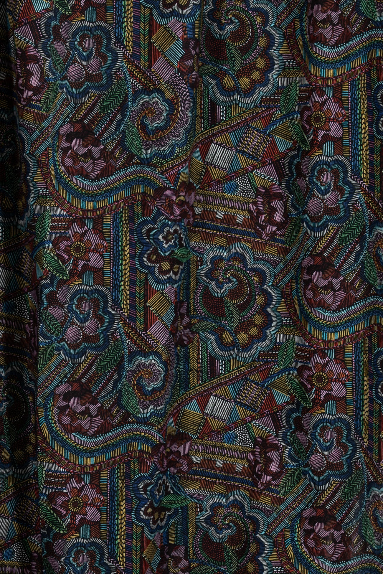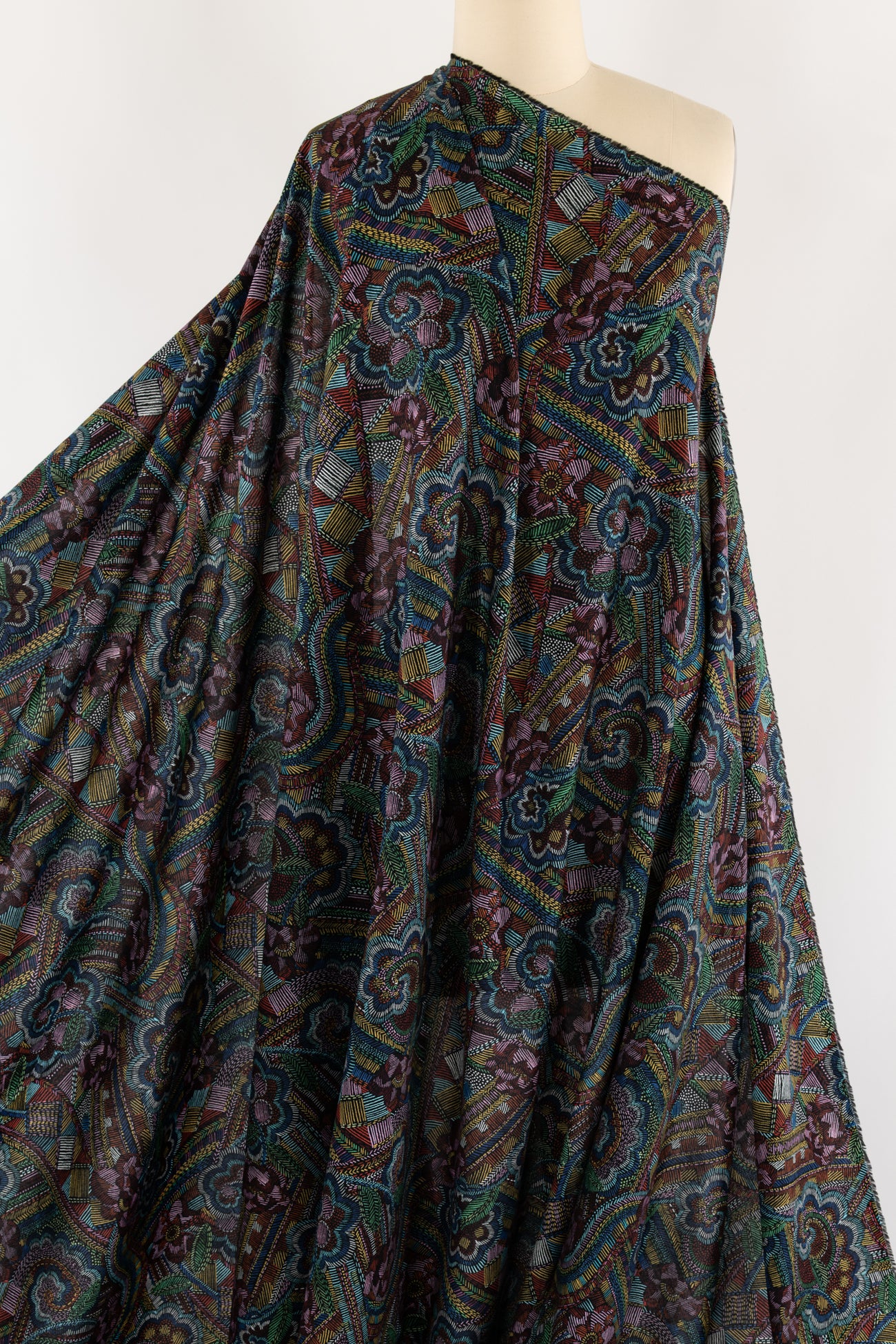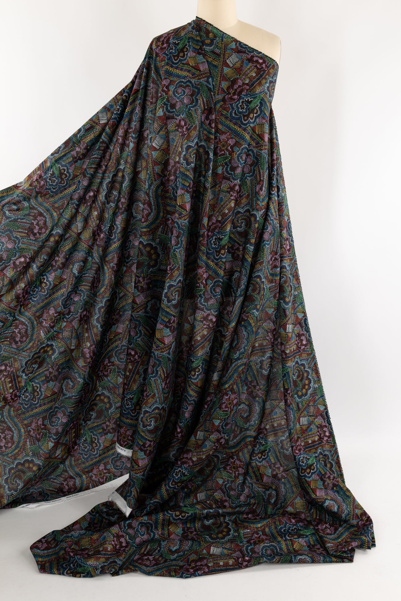 Striking geometric and floral motifs are richly colored with small lines reminiscent of hand embroidery on black, inspired by Liberty's archival studio designs with a contemporary touch. Produced in Northern Italy for Liberty of London, printed on the renowned and exceptional Tana Lawn, the cotton that behaves and feels like silk. Fine-grained, with a cool, smooth, soft hand, fluid drape and depth of color. Perfect for a shirt, dress, skirt, tunic, caftan, loungewear, children's, accessories, or home decor. Right to wear everyday or for statement pieces. One-way design, 12¼" repeat. OEKO-TEX® certified.