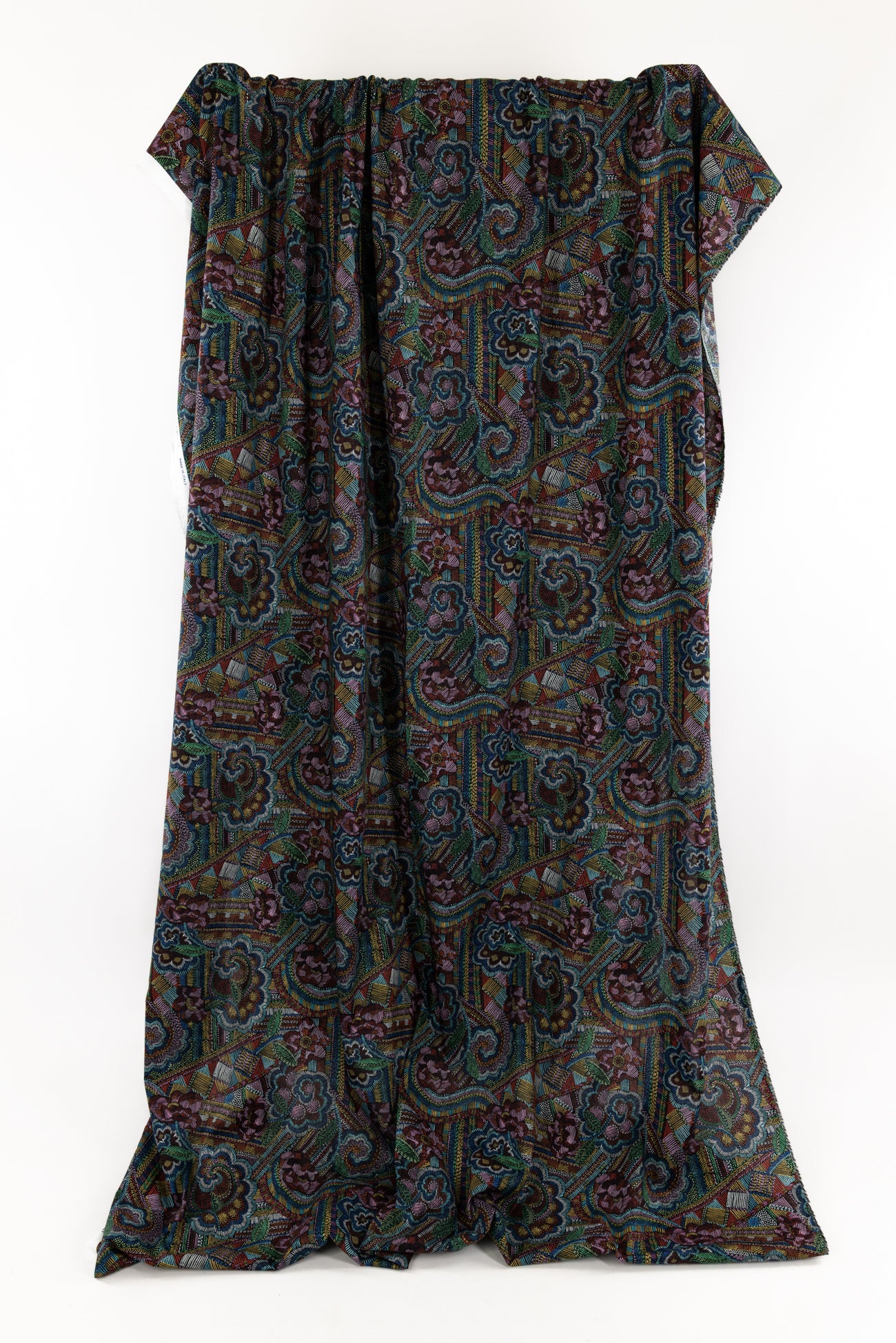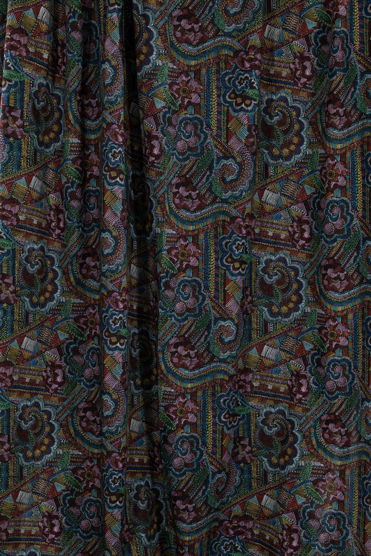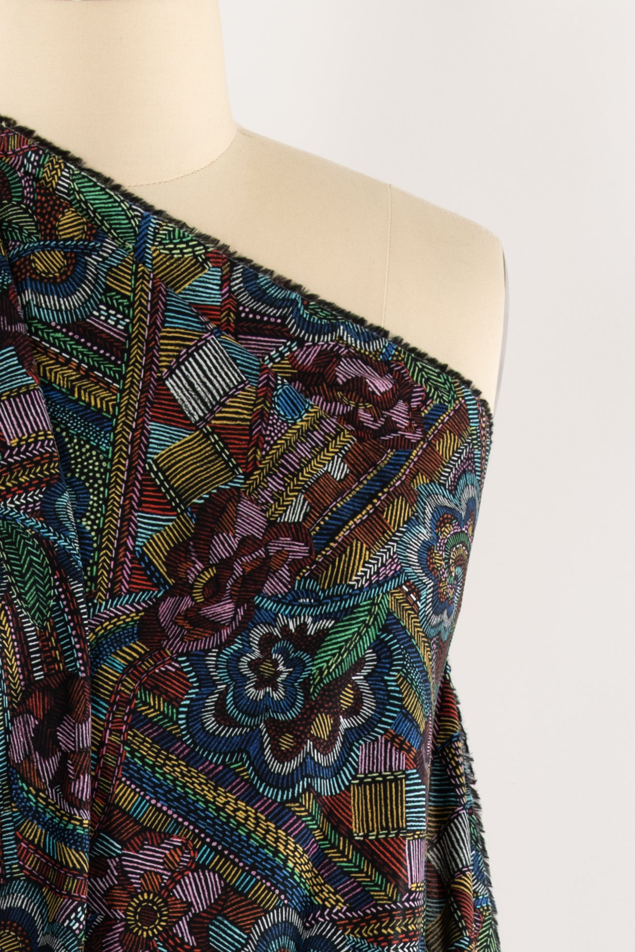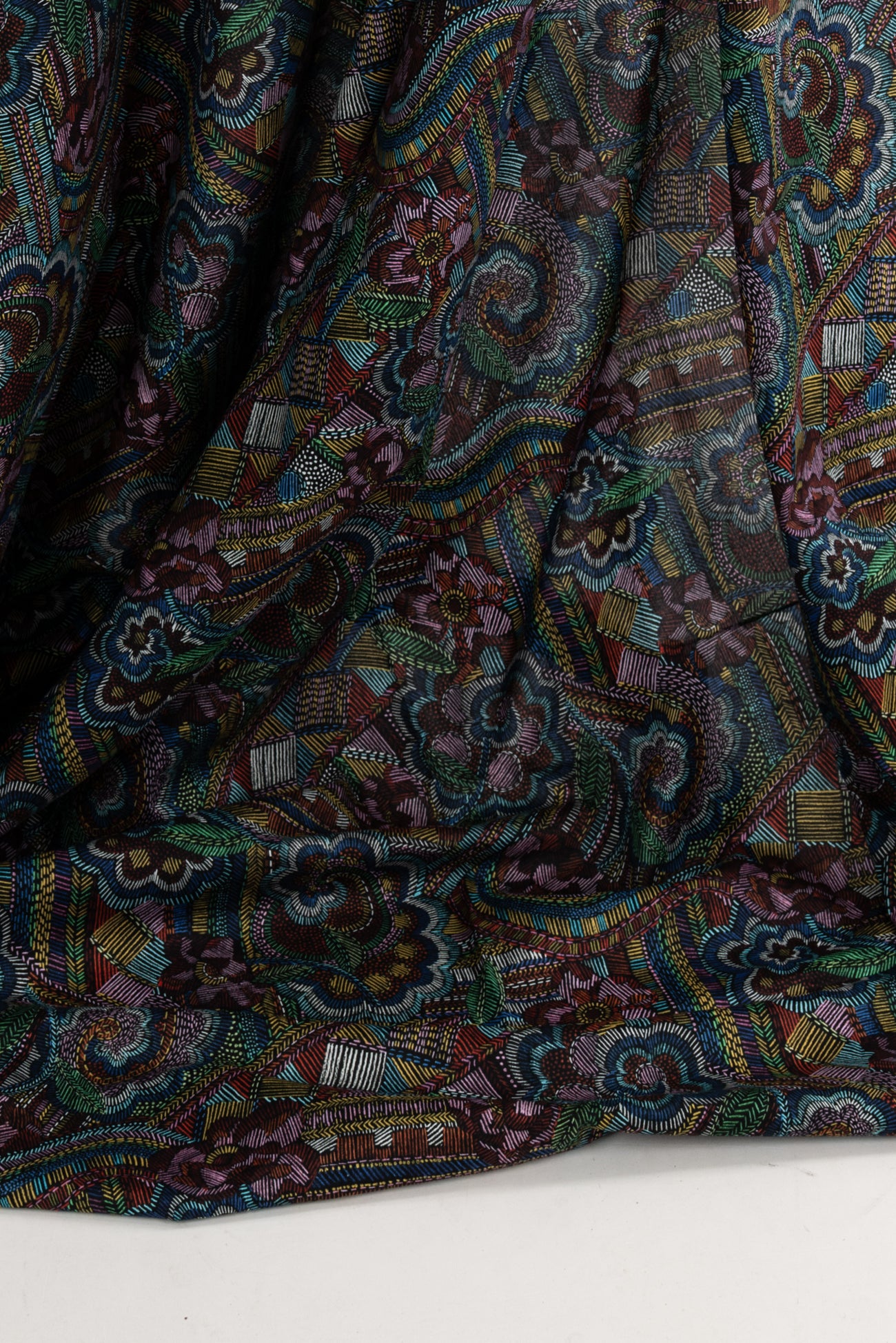 Striking geometric and floral motifs are richly colored with small lines reminiscent of hand embroidery on black, inspired by Liberty's archival studio designs with a contemporary touch. Produced in Northern Italy for Liberty of London, printed on the renowned and exceptional Tana Lawn, the cotton that behaves and feels like silk. Fine-grained, with a cool, smooth, soft hand, fluid drape and depth of color. Perfect for a shirt, dress, skirt, tunic, caftan, loungewear, children's, accessories, or home decor. Right to wear everyday or for statement pieces. One-way design, 12¼" repeat. OEKO-TEX® certified.