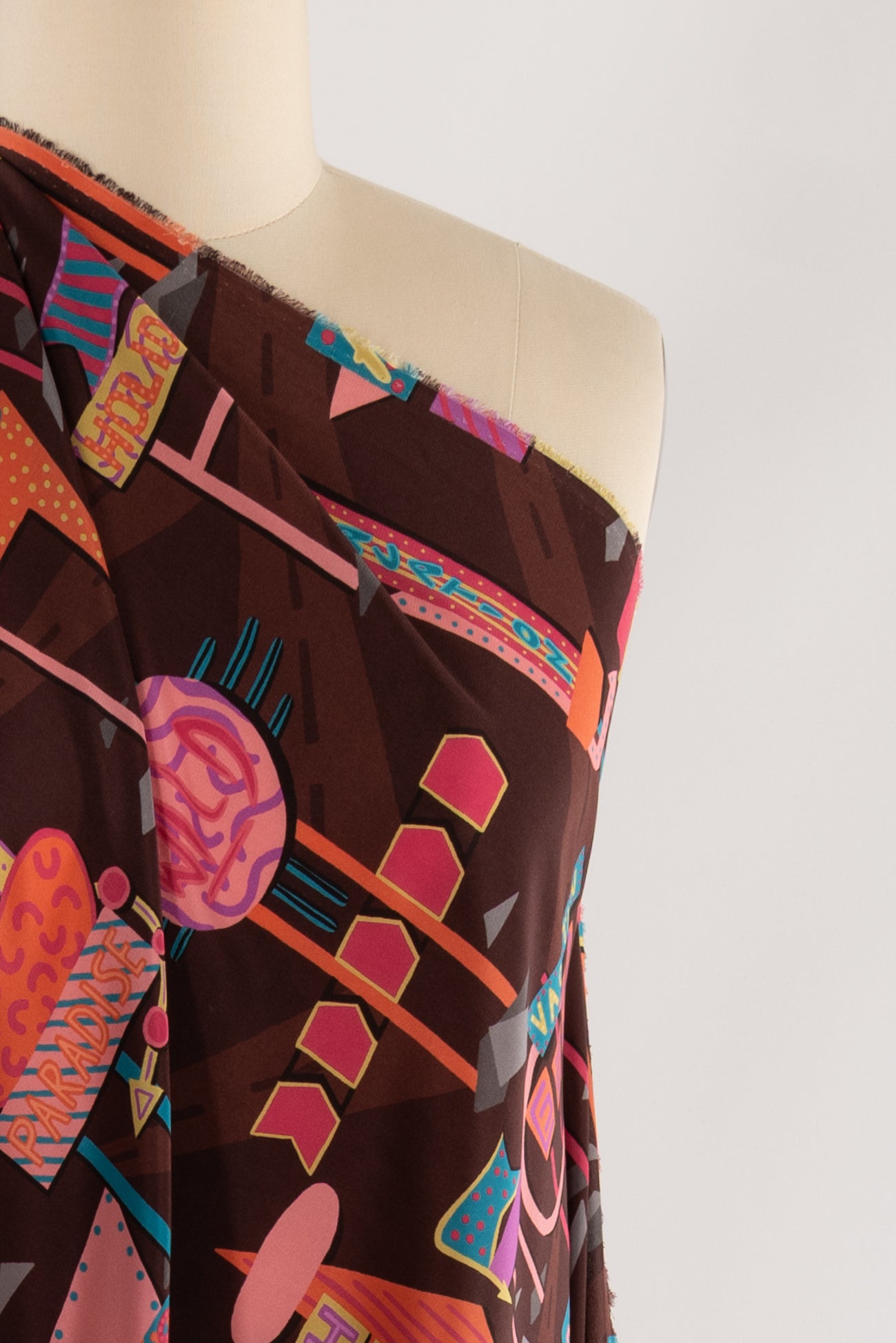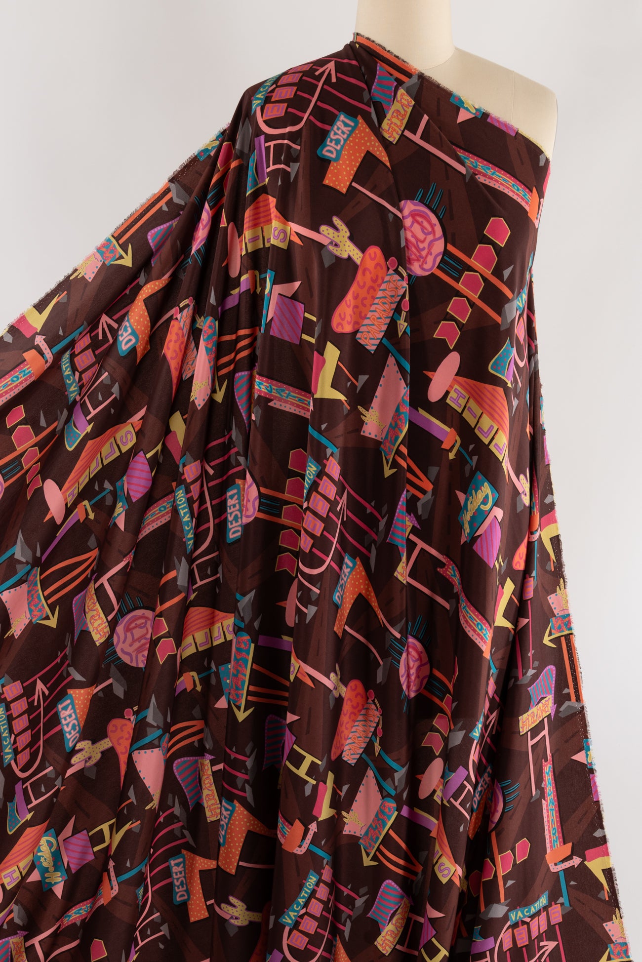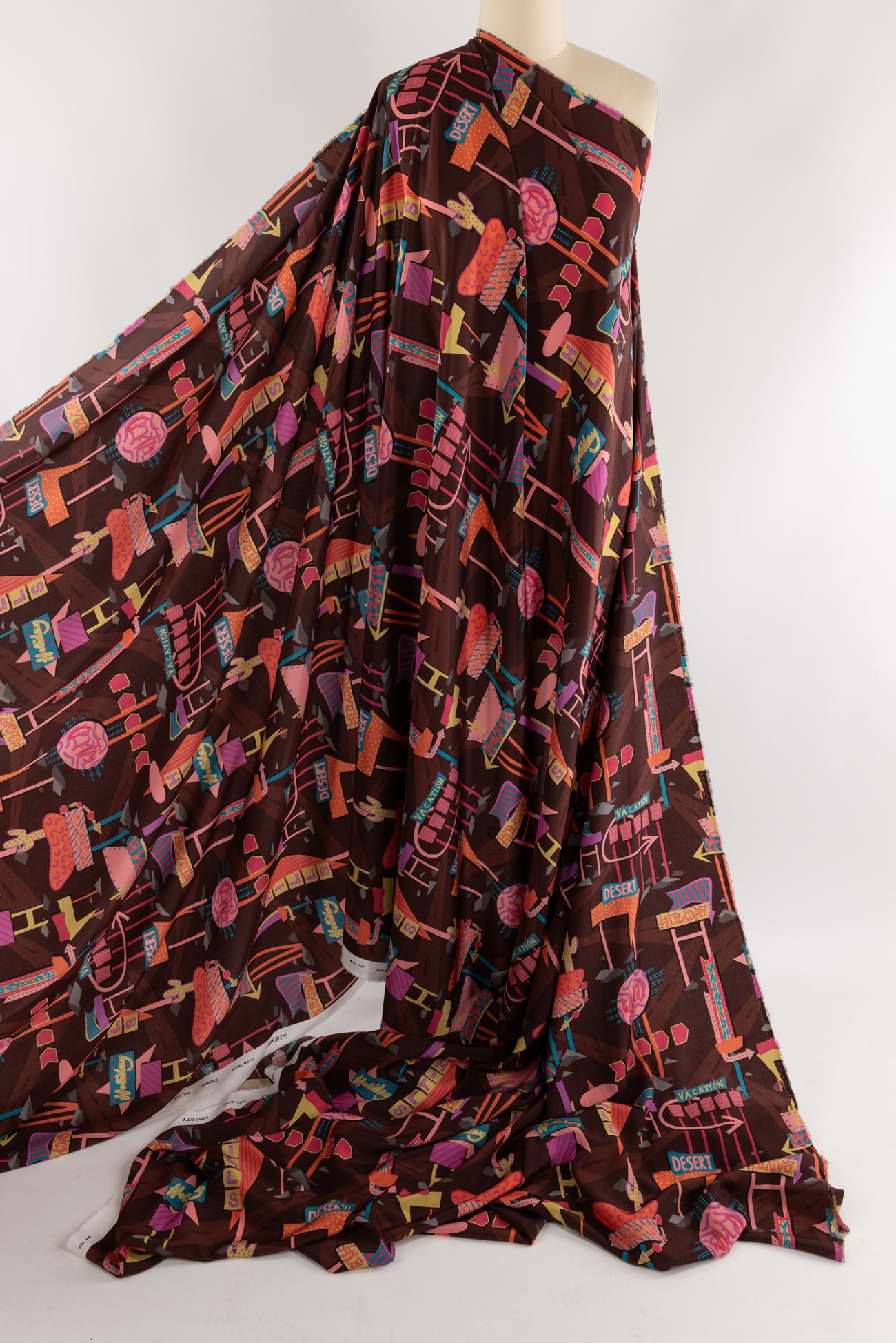 Modern & whimsical spin in luxe Liberty silk crepe de chine in a multicolored warm toned southwest themed digitally printed in Italy. Lightweight, (but Liberty silks have extra oomph and structure), opaque, with a cool, dry crepe hand and fluid liquid drape. Right for a dress, tunic, shirt, floaty jacket, soft pants, kimono, or caftan. One-way design, 17" repeat. OEKO-TEX certified. Marcy says, 'I can see this in a soft drapey tunic, dress or shirt - and fabulous for menswear!'