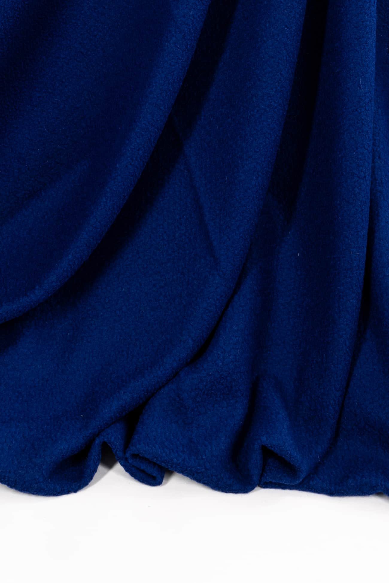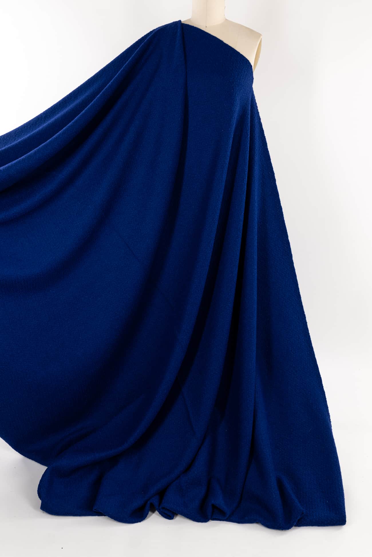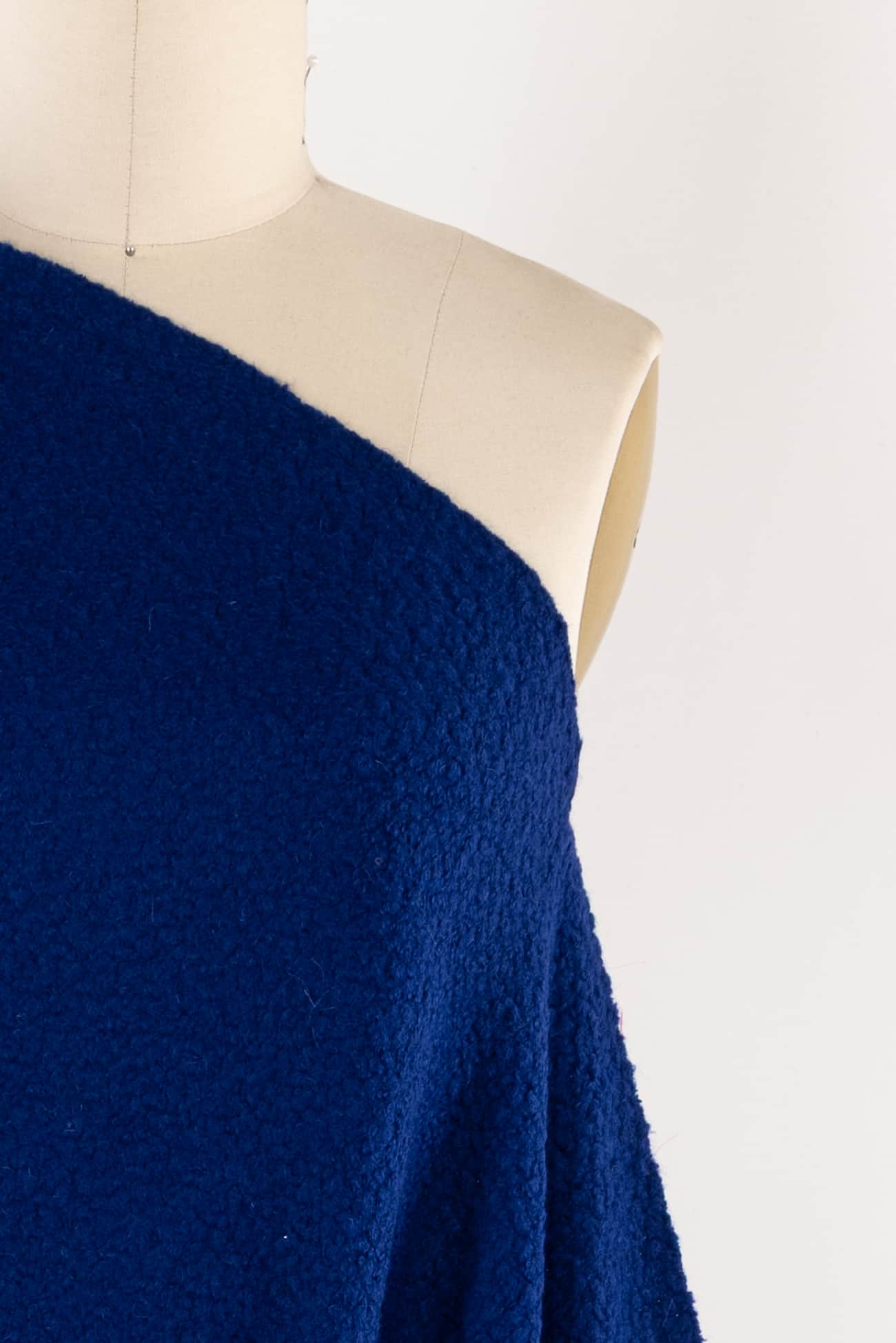 Color saturated cool toned royal blue boucle knit, deadstock produced in South Korea for an upscale LA designer. Heavy/mid weight with a bit of loft, an appealing cozy textured boucle surface, smooth on the back side and light crosswise stretch. No rolling at the cut edge, no raveling, so no need for a seam finish (lining optional), - will be easy to sew and a pleasure to wear. Beautiful quality! Right for a coat, jacket, vest, sweater, poncho.