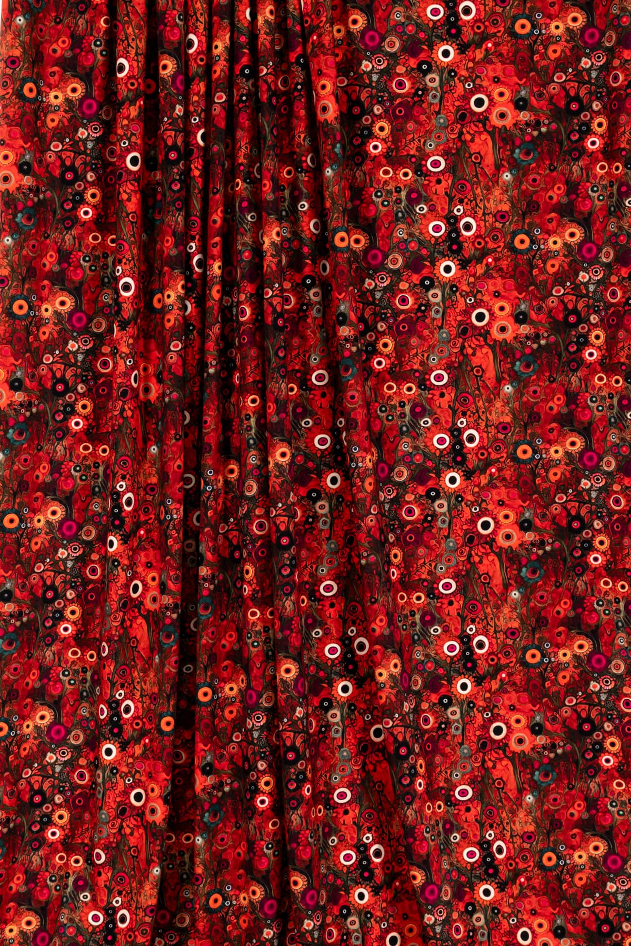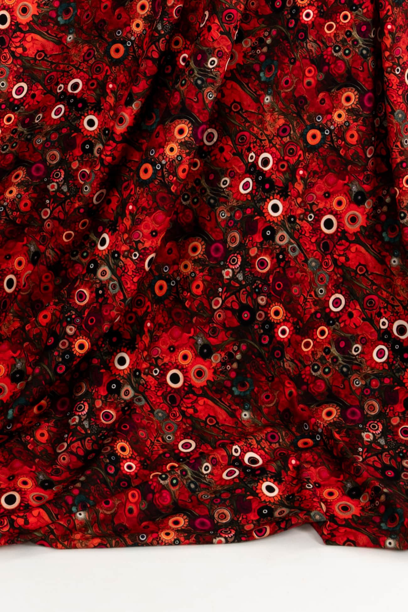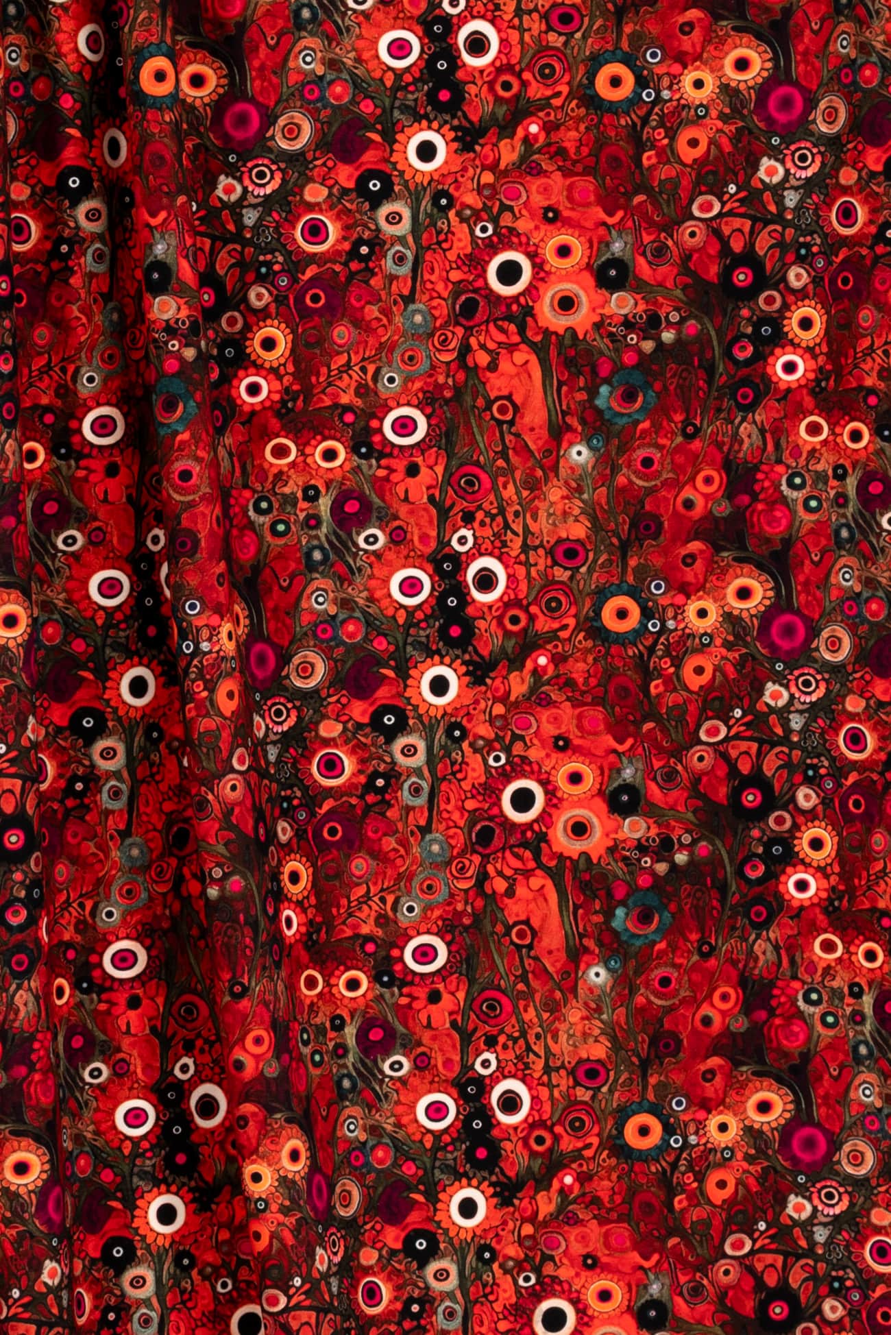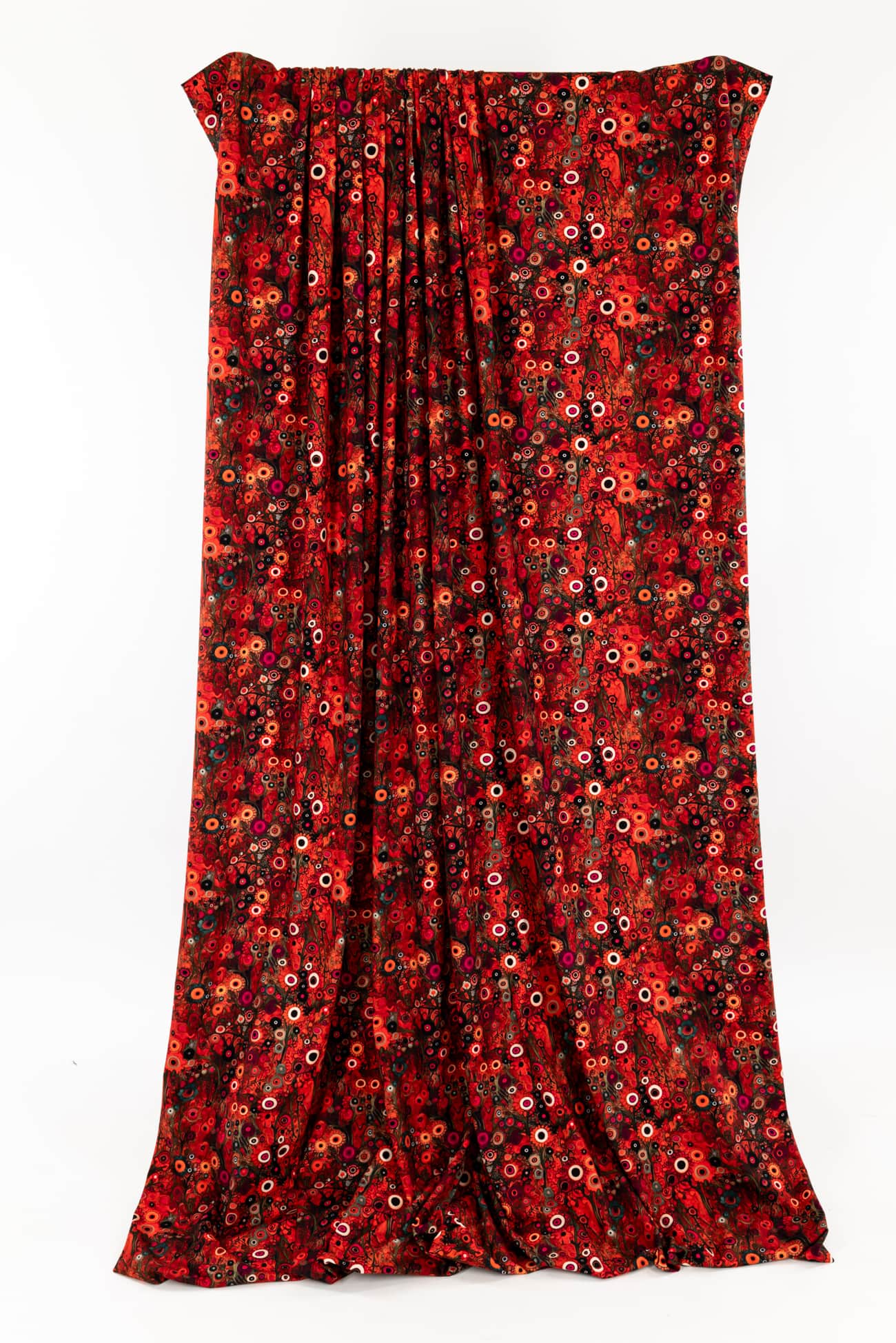 An elegant array of Klimt inspired circles in shades of red, tangerine, brown and black. Luxurious cotton knit jersey, digitally printed in the Netherlands. Impeccable quality, light/mid-weight, opaque, with a flattering body-skimming flow, appealing soft hand, fluid drape, crosswise stretch, some lengthwise stretch, a 9¼" repeat and some rolling at the cut edge. Ideal for a wide range of garments, t-shirt, tunic, dress, skirt, soft pants, loungewear, caftan, kimono or children's. Oeko-Tex® certified.