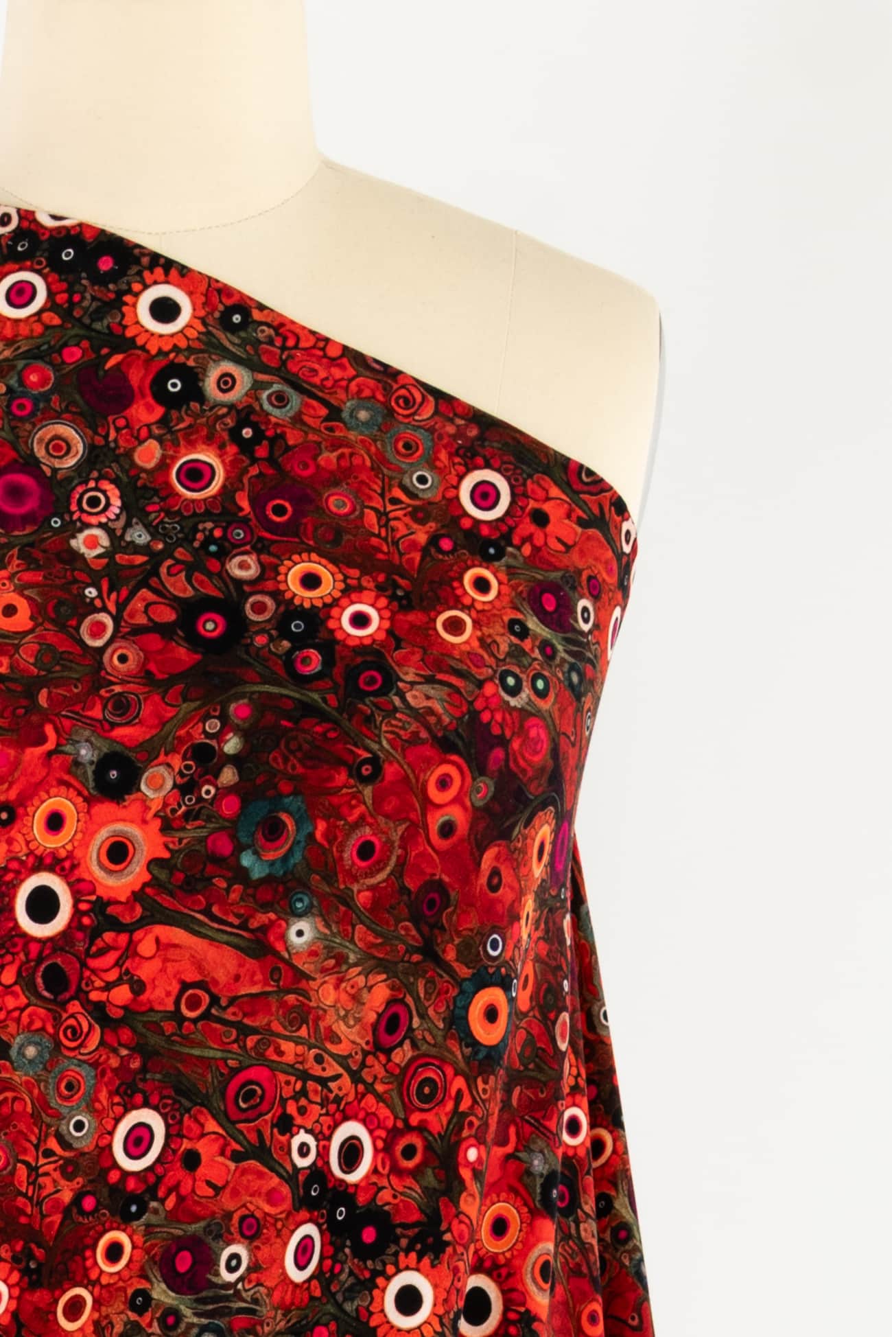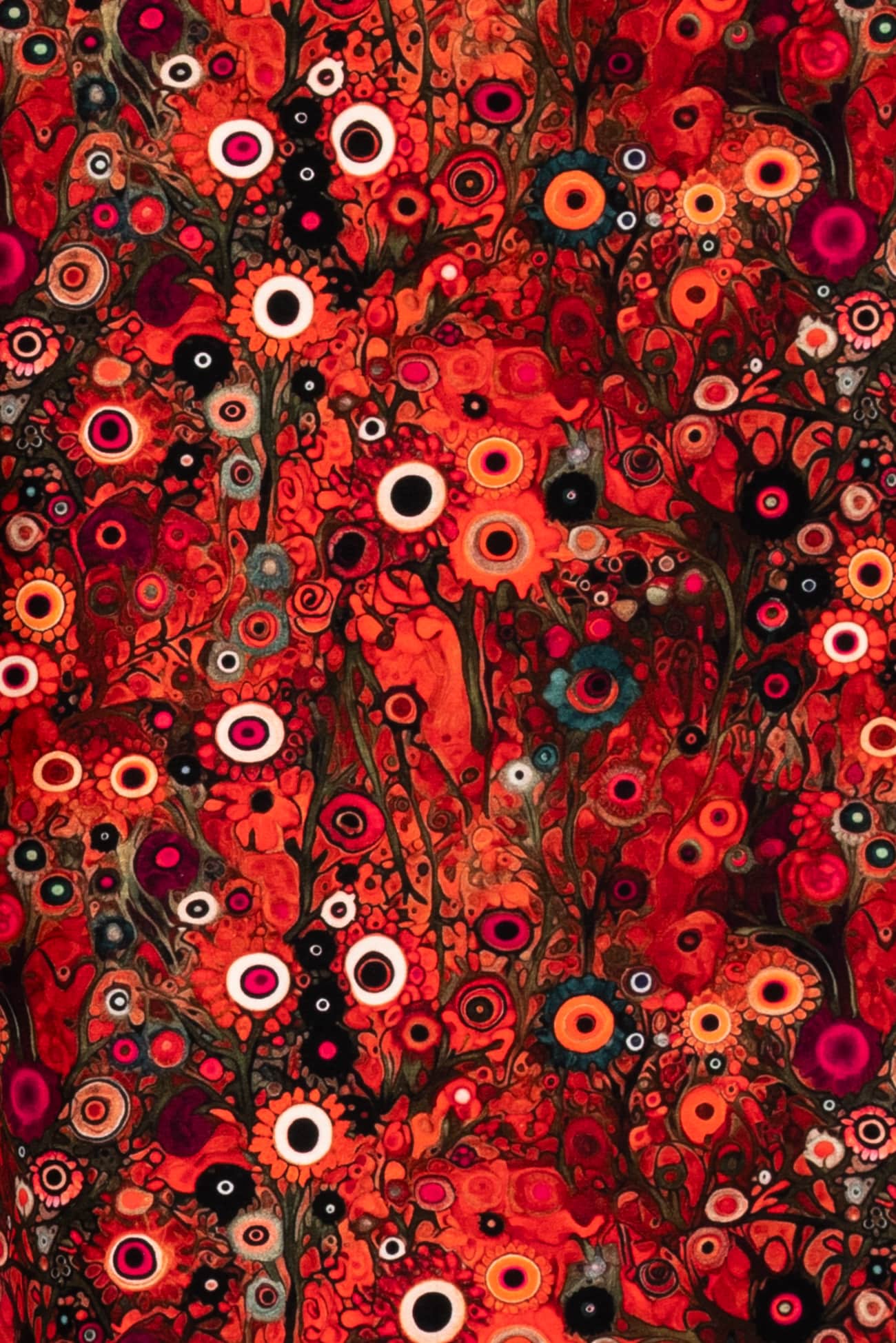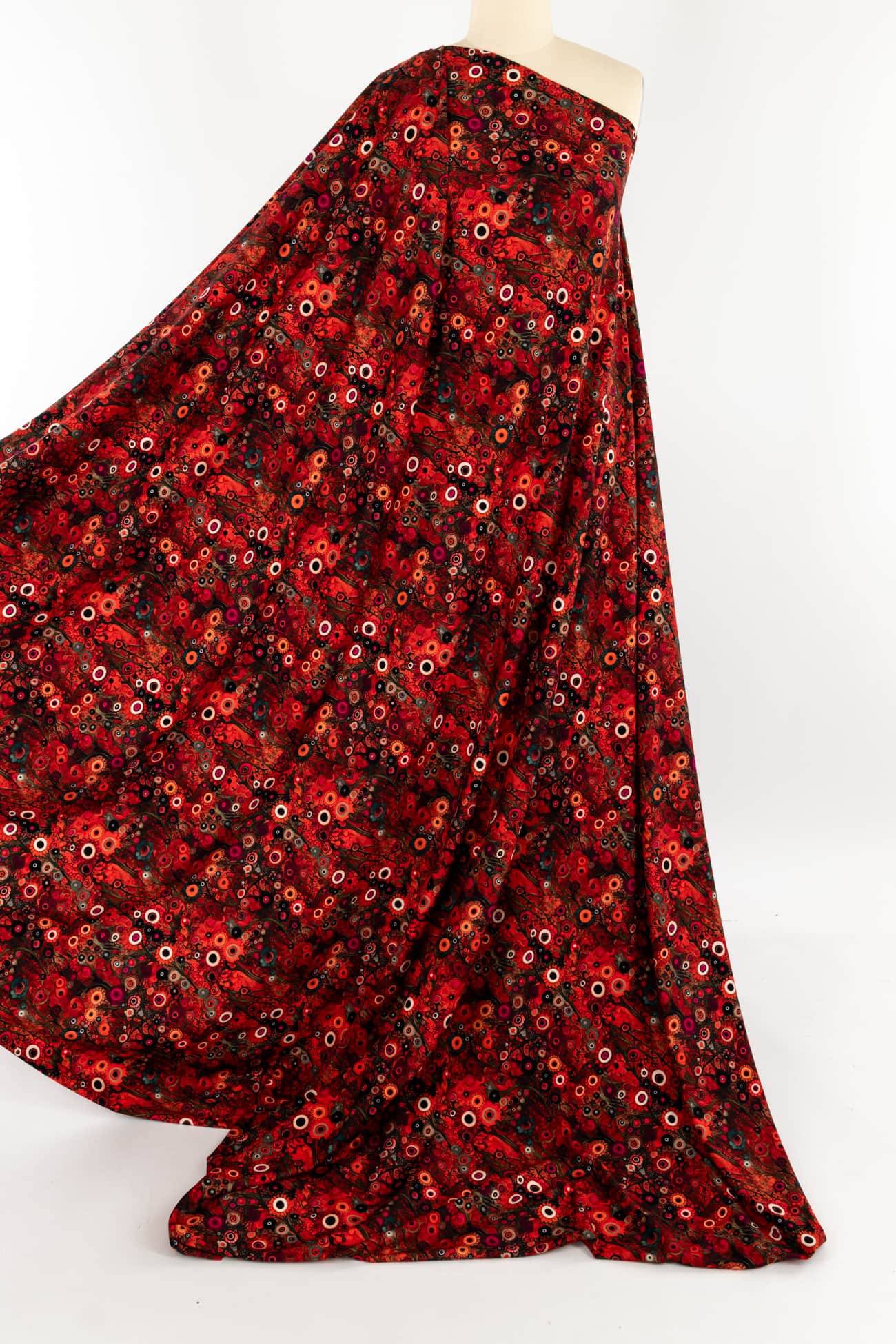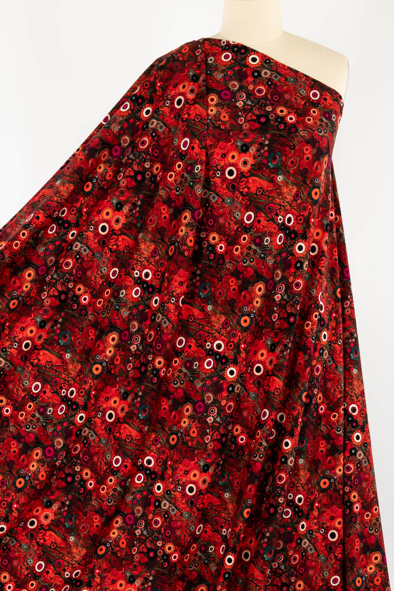 An elegant array of Klimt inspired circles in shades of red, tangerine, brown and black. Luxurious cotton knit jersey, digitally printed in the Netherlands. Impeccable quality, light/mid-weight, opaque, with a flattering body-skimming flow, appealing soft hand, fluid drape, crosswise stretch, some lengthwise stretch, a 9¼" repeat and some rolling at the cut edge. Ideal for a wide range of garments, t-shirt, tunic, dress, skirt, soft pants, loungewear, caftan, kimono or children's. Oeko-Tex® certified.