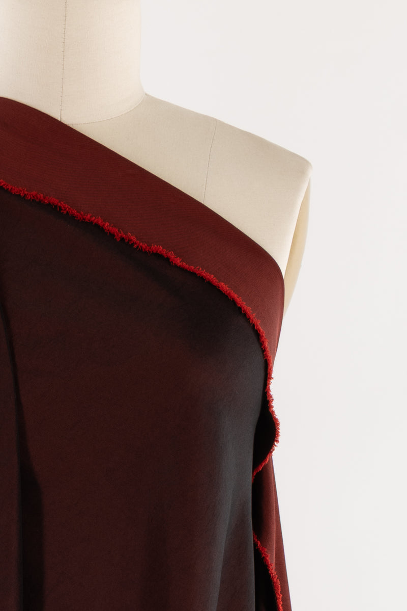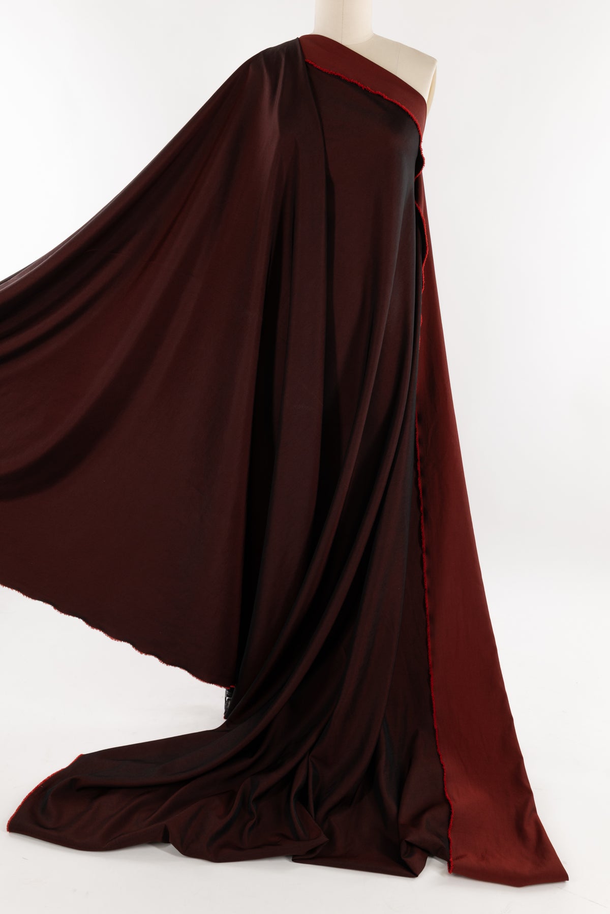 Deep ruby and red water-resistant rainwear, double-sided deadstock from an LA designer. Lightweight, cross-woven with a black warp and red weft so it is deep ruby on one side, red on the other, and will fold up to almost nothing. Beautiful and supple with a malleable smooth hand, softly shimmering surface, dry hand, and liquid drape. Perfect for a coat or jacket, cape or poncho.