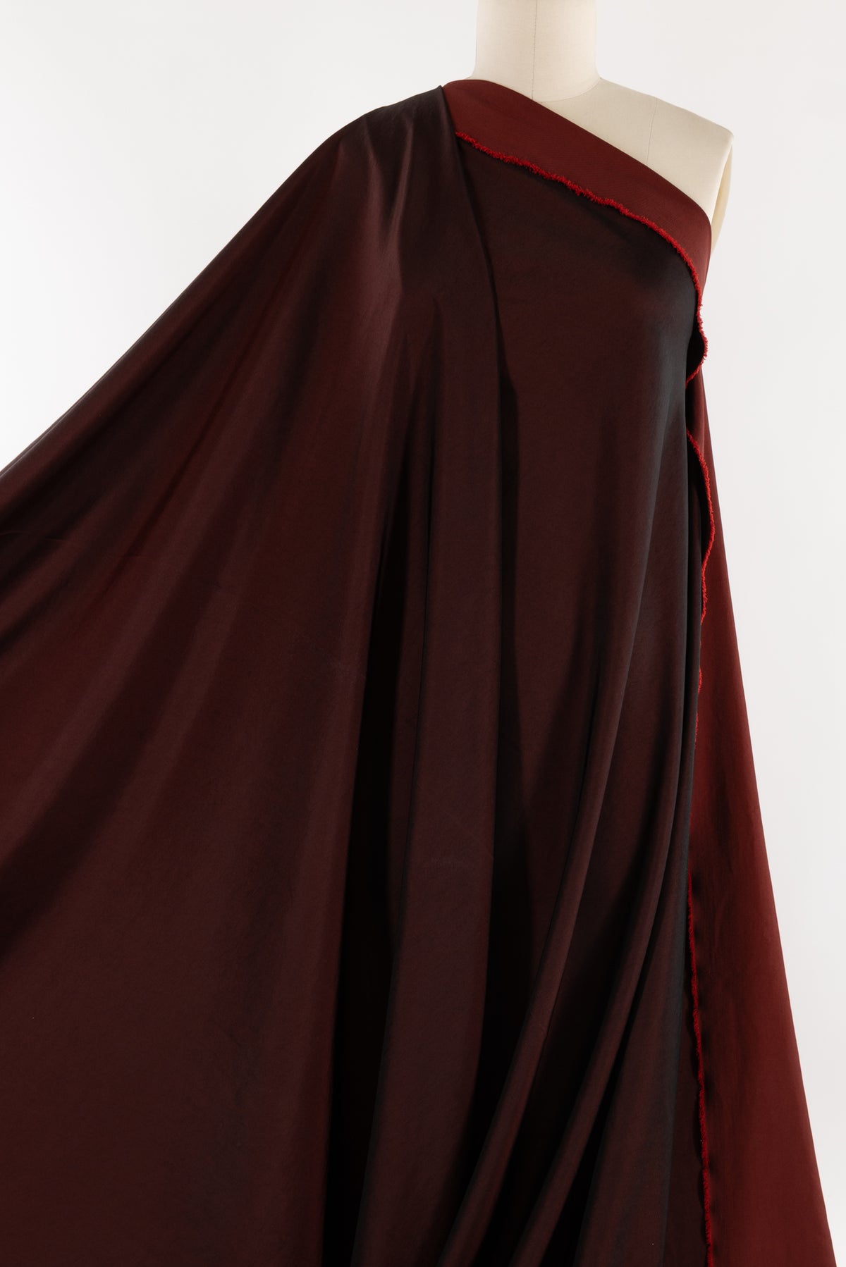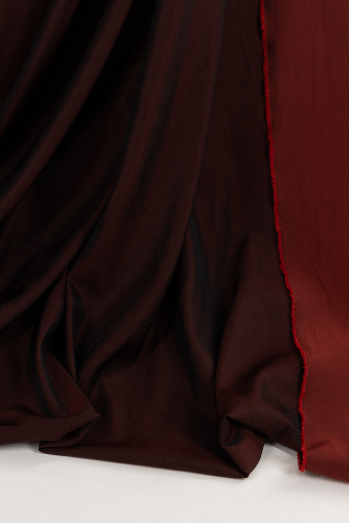 Deep ruby and red water-resistant rainwear, double-sided deadstock from an LA designer. Lightweight, cross-woven with a black warp and red weft so it is deep ruby on one side, red on the other, and will fold up to almost nothing. Beautiful and supple with a malleable smooth hand, softly shimmering surface, dry hand, and liquid drape.  Perfect for a coat or jacket, cape or poncho.