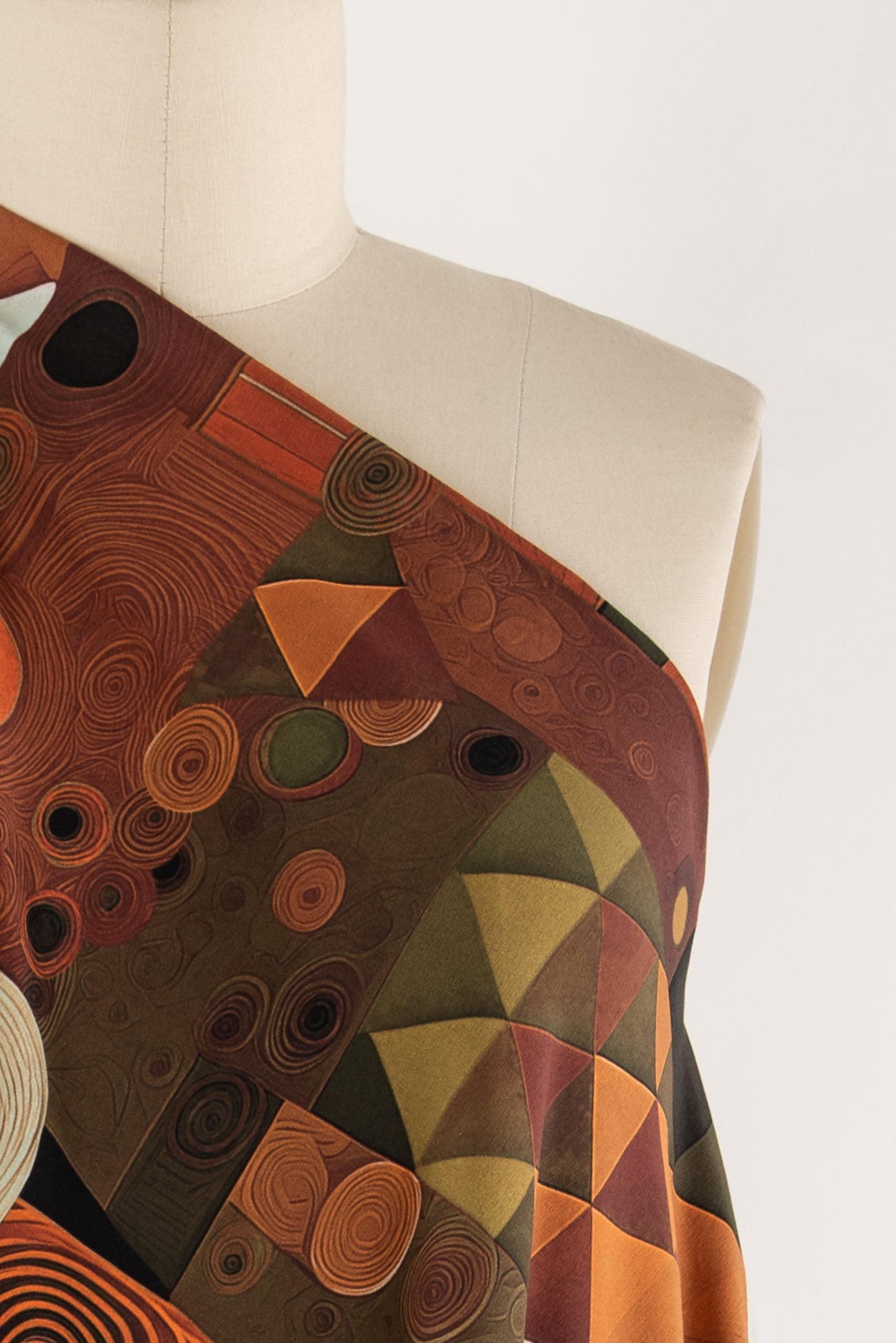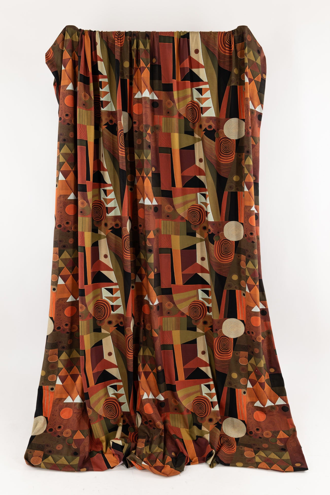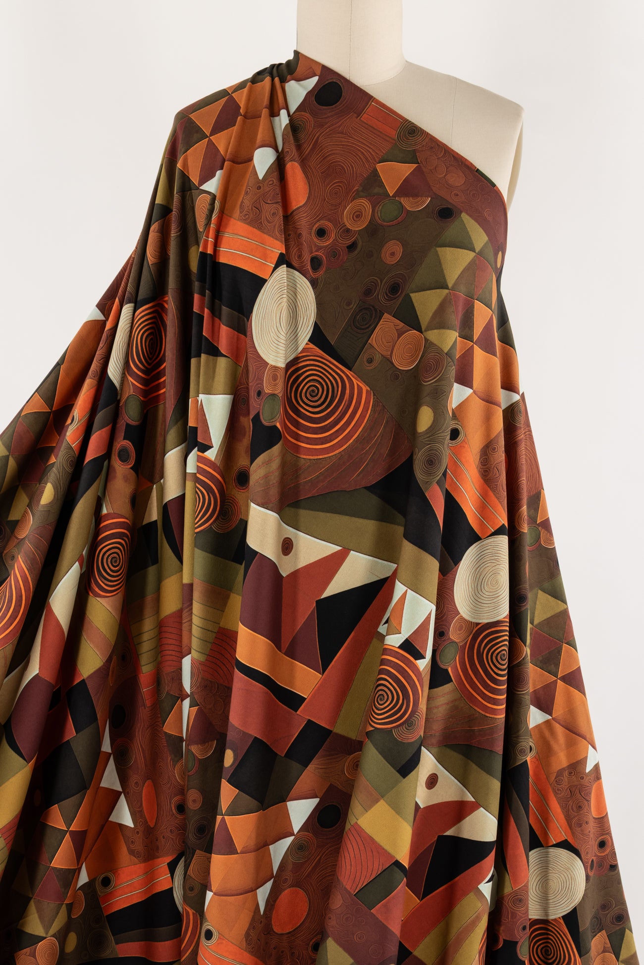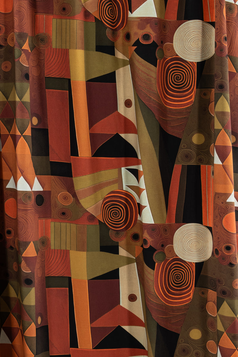Contemporary color saturated warm-toned geometric in rust, persimmon, muted greens, and ivory accented with black, digitally printed on luxurious cotton knit jersey in the Netherlands. Impeccable quality, light/mid-weight, opaque, with a flattering body-skimming flow, appealing soft hand, fluid drape, crosswise stretch, some lengthwise stretch, a 16" repeat, one-way design, and some rolling at the cut edge. Ideal for a wide range of garments, t-shirt, tunic, dress, skirt, soft pants, loungewear, caftan, kimono, men's, or children's. Oeko-Tex® certified.
