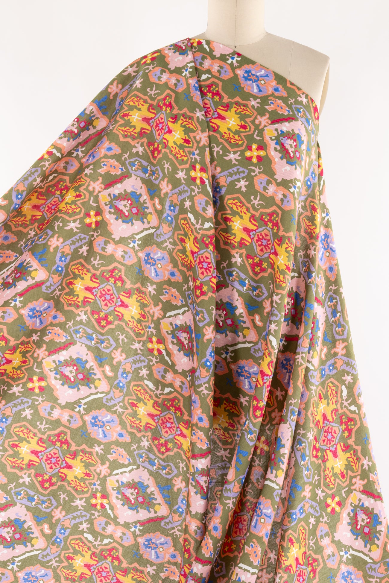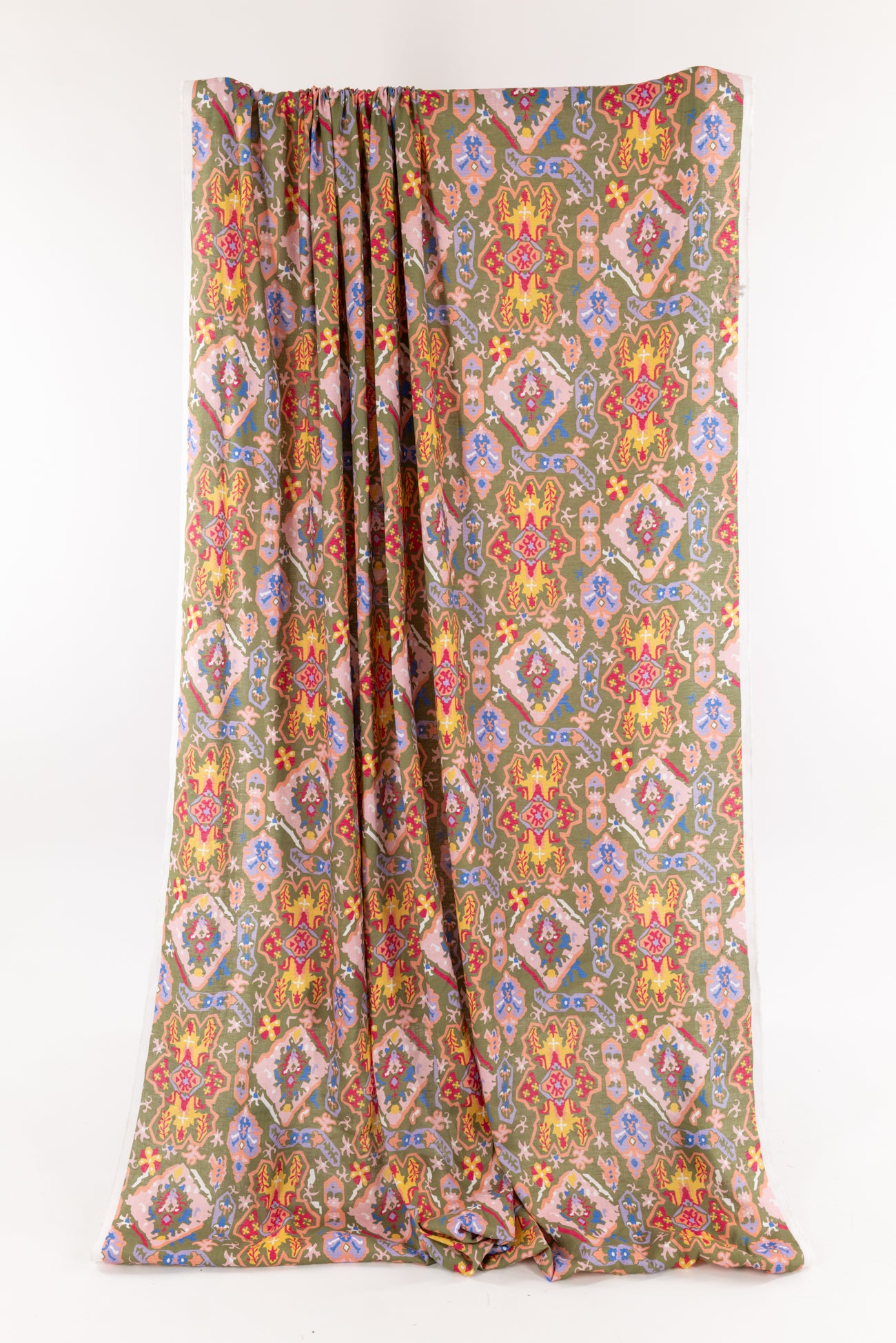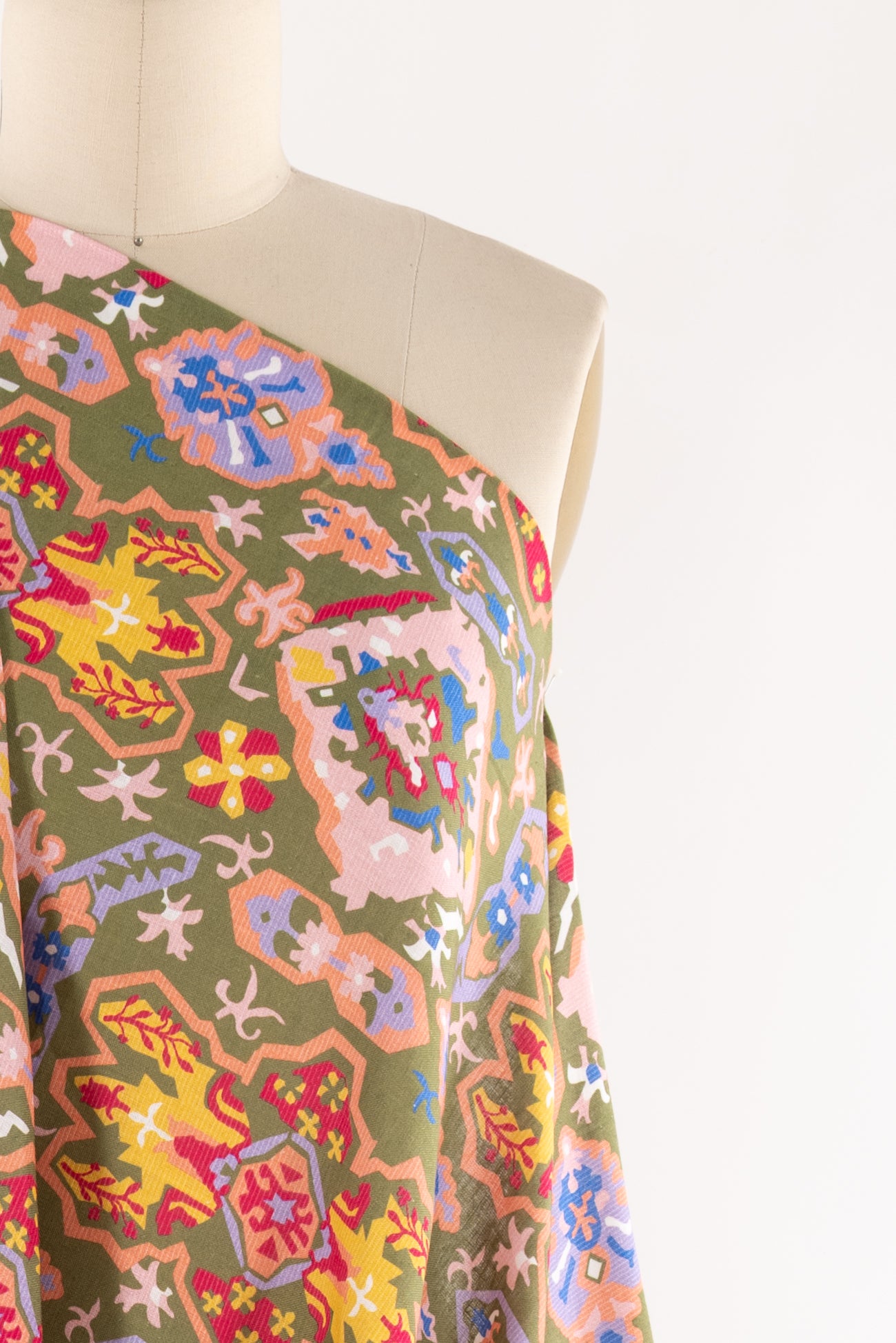 Striking stylized floral in a kaleidoscope of muted pastel colors on a fine linen blend woven. Beautiful deadstock milled in Italy. Lightweight, with a smooth linen hand, a 15¾" repeat and soft airy drape. Right for a shirt, blouse, dress, tunic, skirt, soft pant, caftan, kimono or children's.