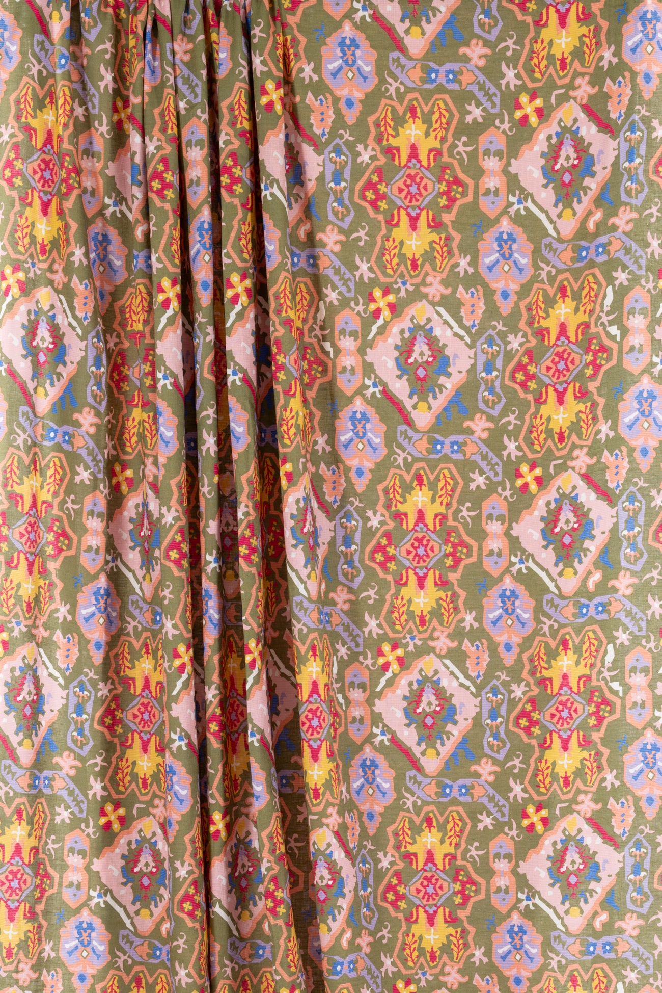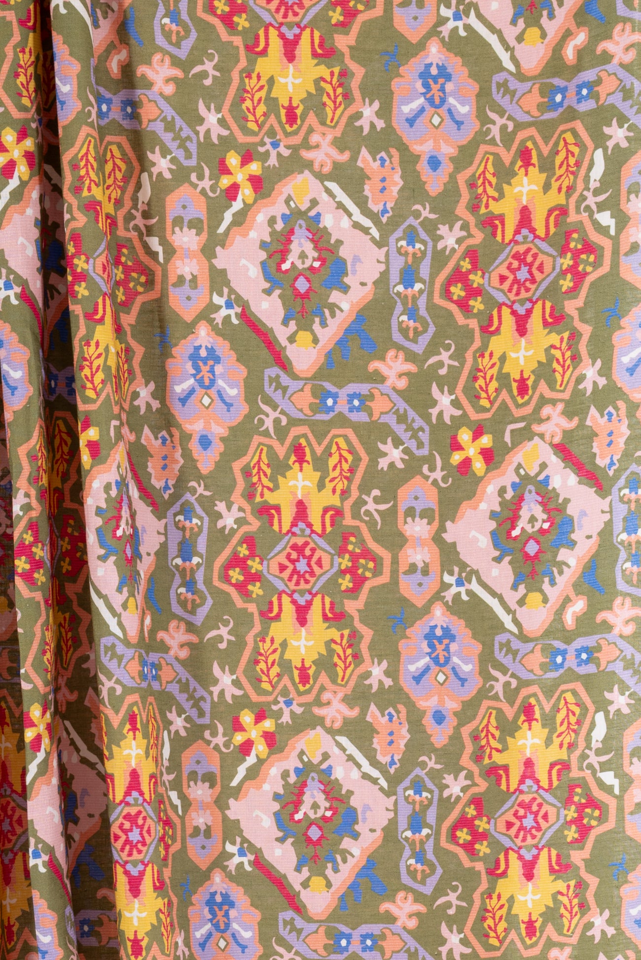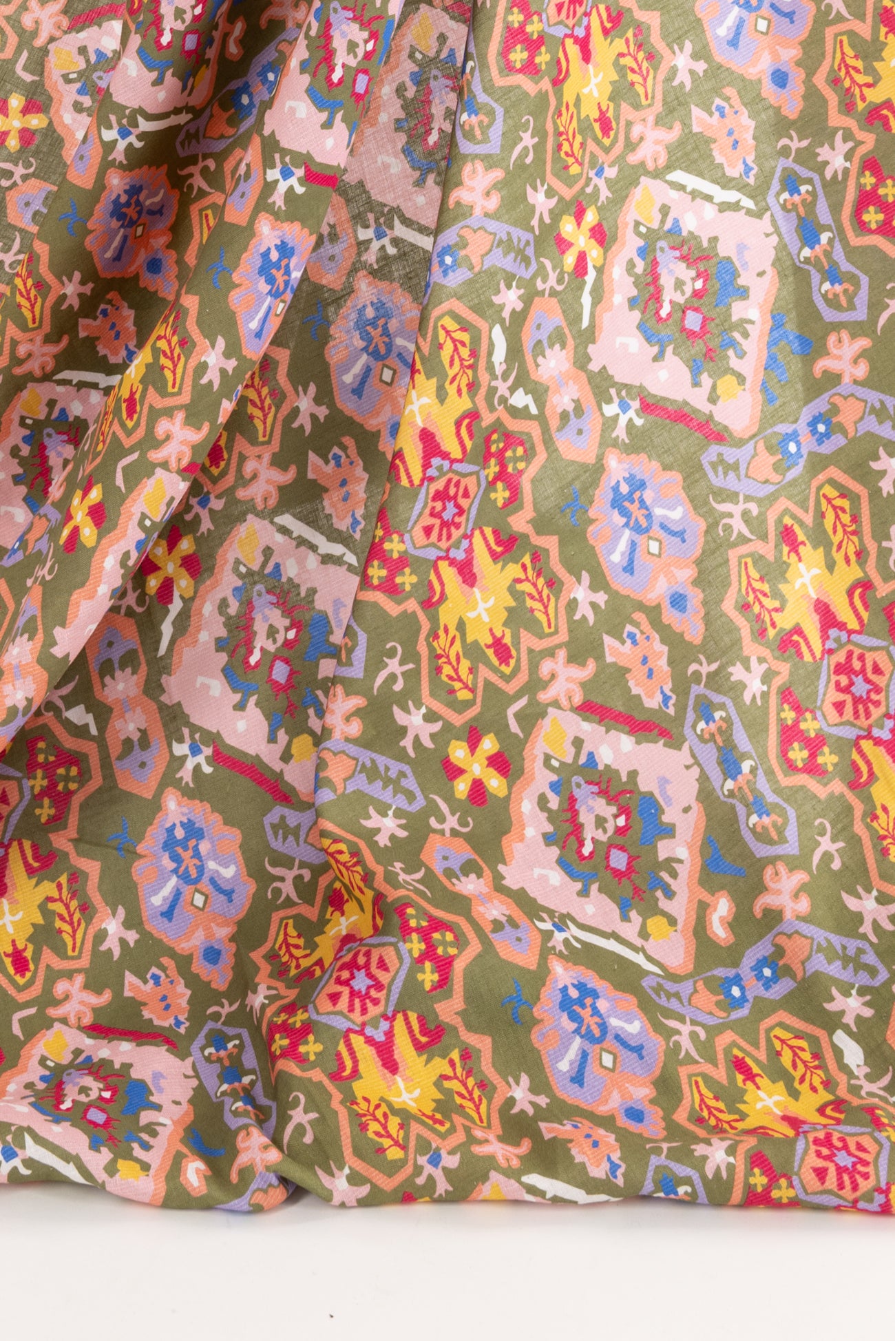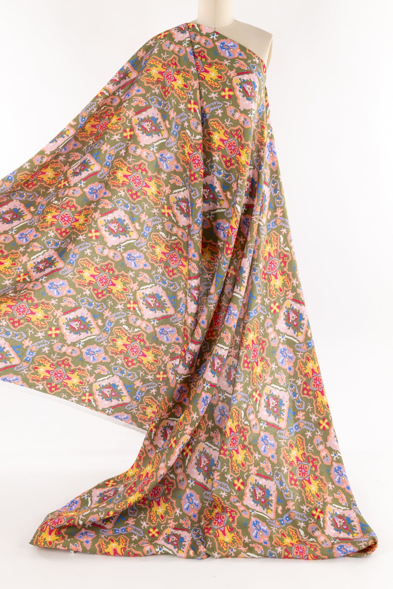 Striking stylized floral in a kaleidoscope of muted pastel colors on a fine linen blend woven. Beautiful deadstock milled in Italy. Lightweight, with a smooth linen hand, a 15¾" repeat and soft airy drape. Right for a shirt, blouse, dress, tunic, skirt, soft pant, caftan, kimono or children's.