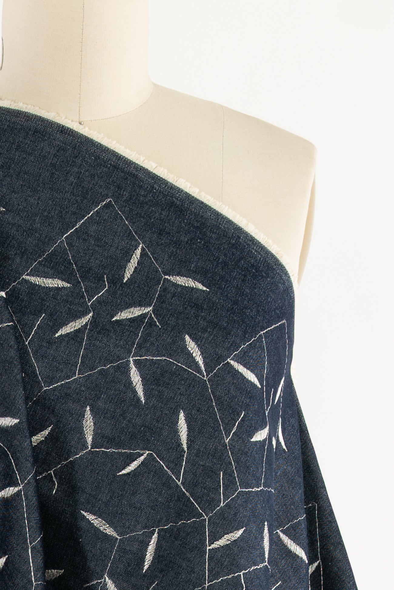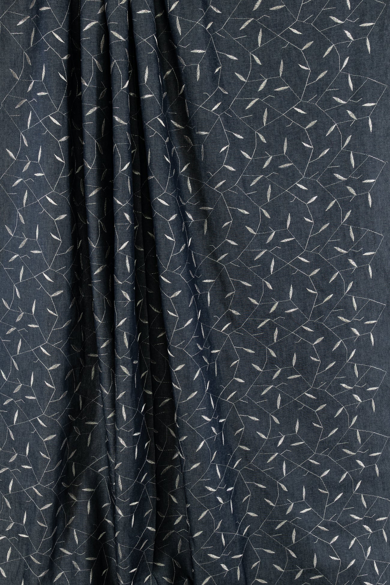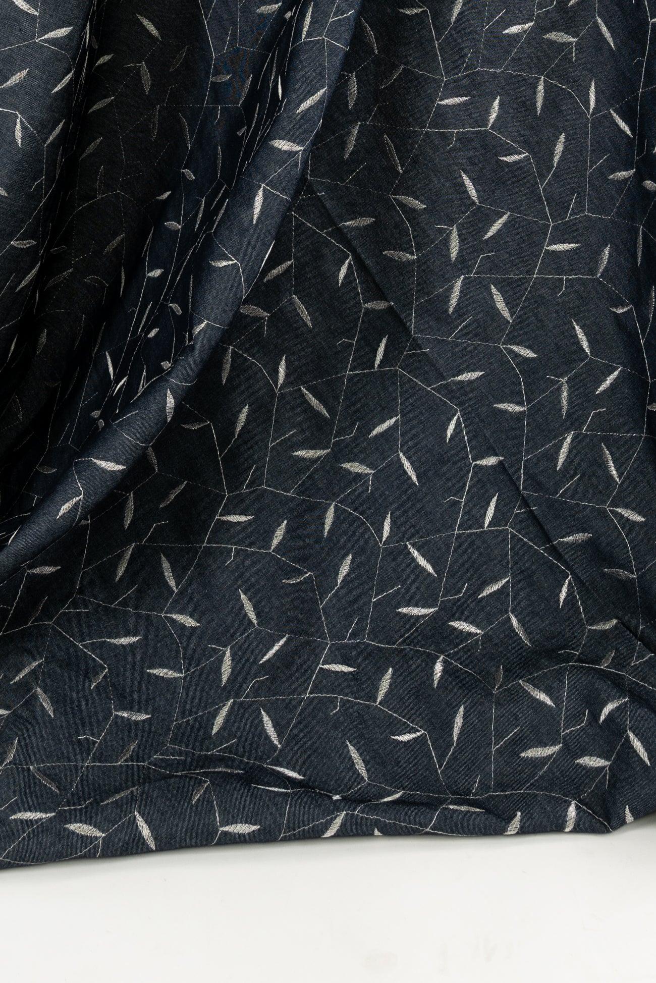 Soft pewter/silver airy leaves embroidered overall on classic indigo denim, deadstock from an LA designer. Mid weight, with a smooth hand and lightly crisp drape. Right for both tops and bottoms; jacket, duster coat, vest, dress, skirt, pants, jeans, jumpsuit, men's and children's wear.