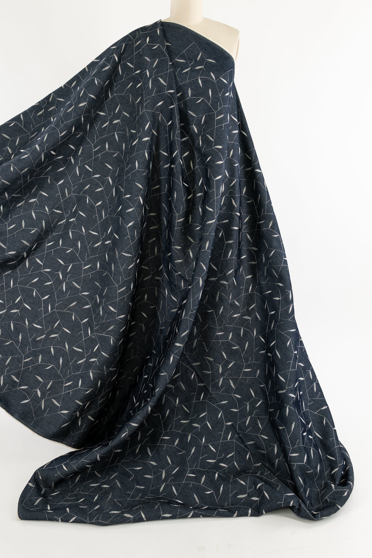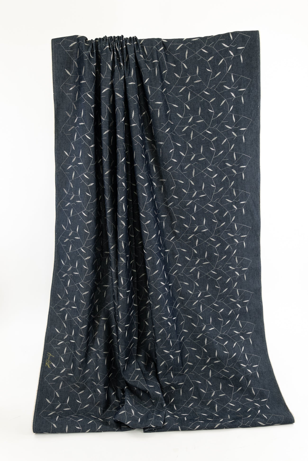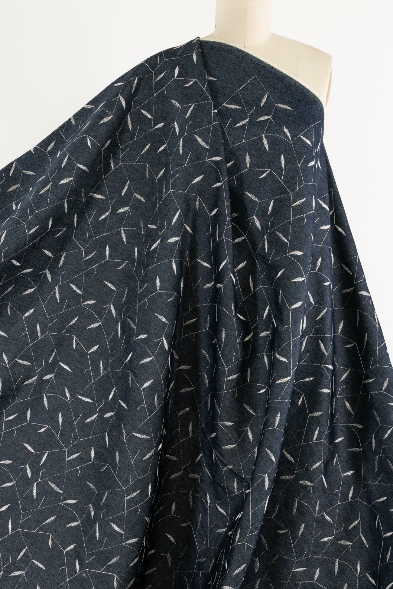 Soft pewter/silver airy leaves embroidered overall on classic indigo denim, deadstock from an LA designer. Mid weight, with a smooth hand and lightly crisp drape. Right for both tops and bottoms; jacket, duster coat, vest, dress, skirt, pants, jeans, jumpsuit, men's and children's wear.