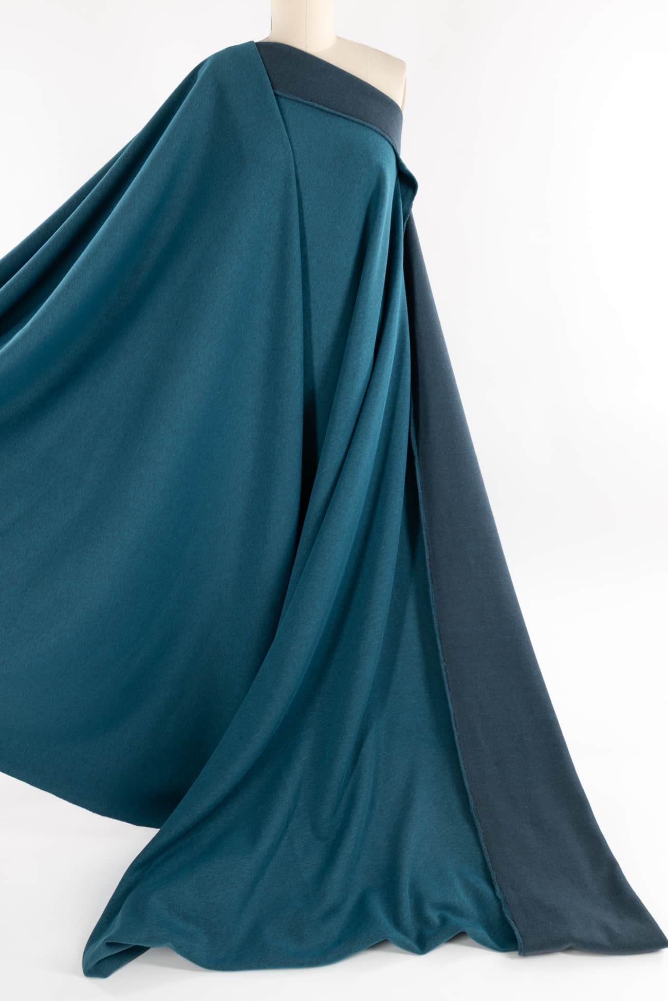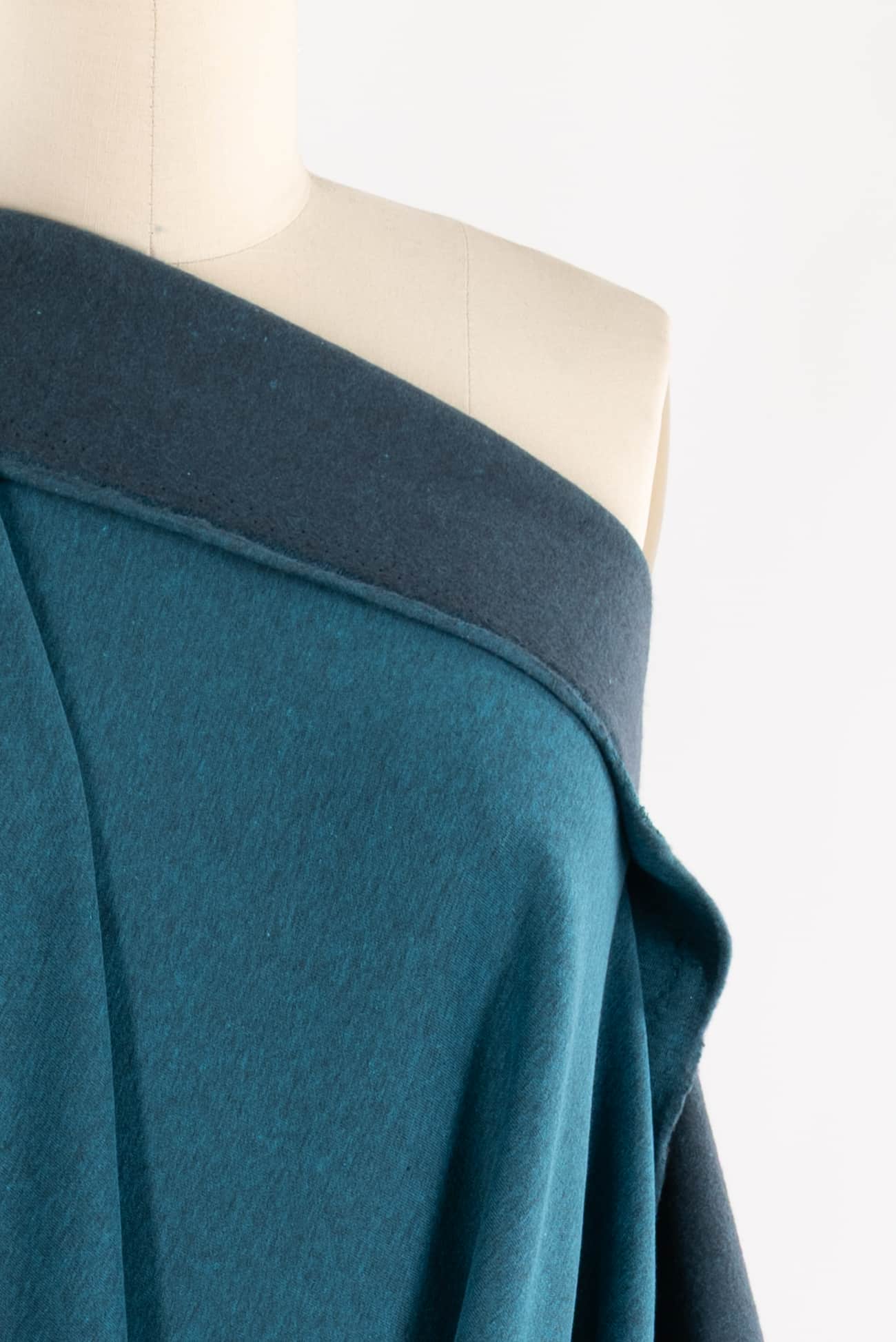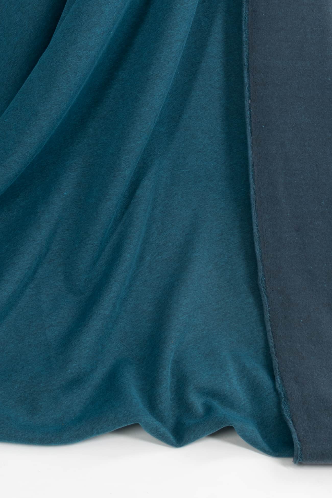 Brindled turquoise and charcoal fleece in a super soft, cozy and drapey cotton/poly blend, a beautiful quality knit from Denmark. Think of a just right sweatshirt type fabric without any stiffness, with a lovely drape and a super appealing soft hand on both sides of the fabric. The back side is softly brushed fleece, the face is smooth yet soft. Crosswise stretch with some rolling at the cut edge, but no raveling and I'd consider using parts of the back side as a design element. The mid/heavyweight is right for a top, tunic or t-shirt, dress, hoodie, yoga or loungewear, light jacket, cozy coat, men's or children's.