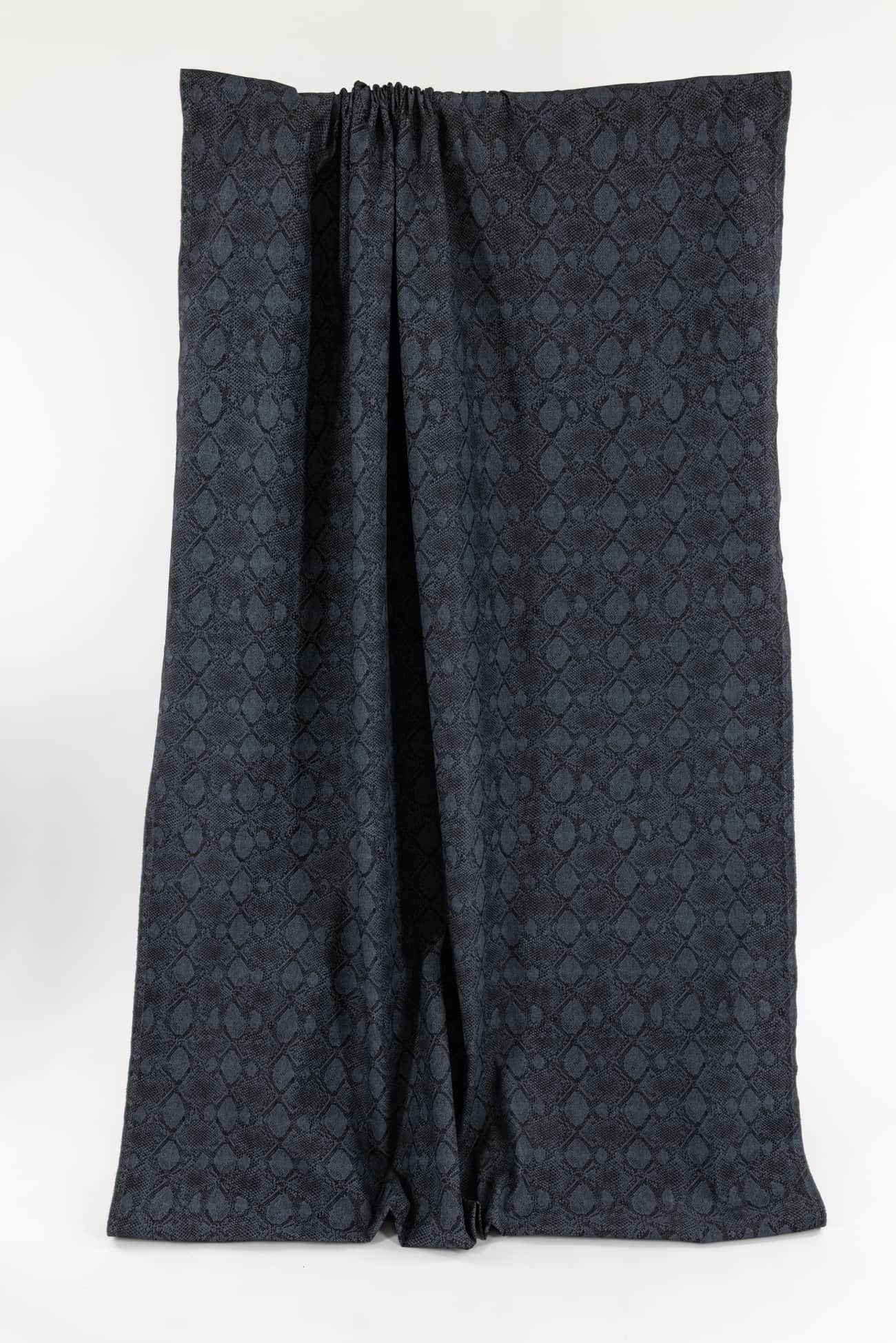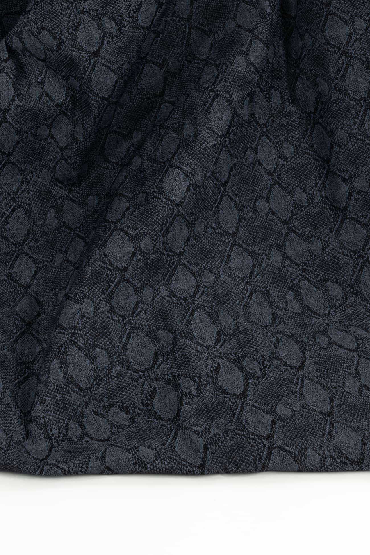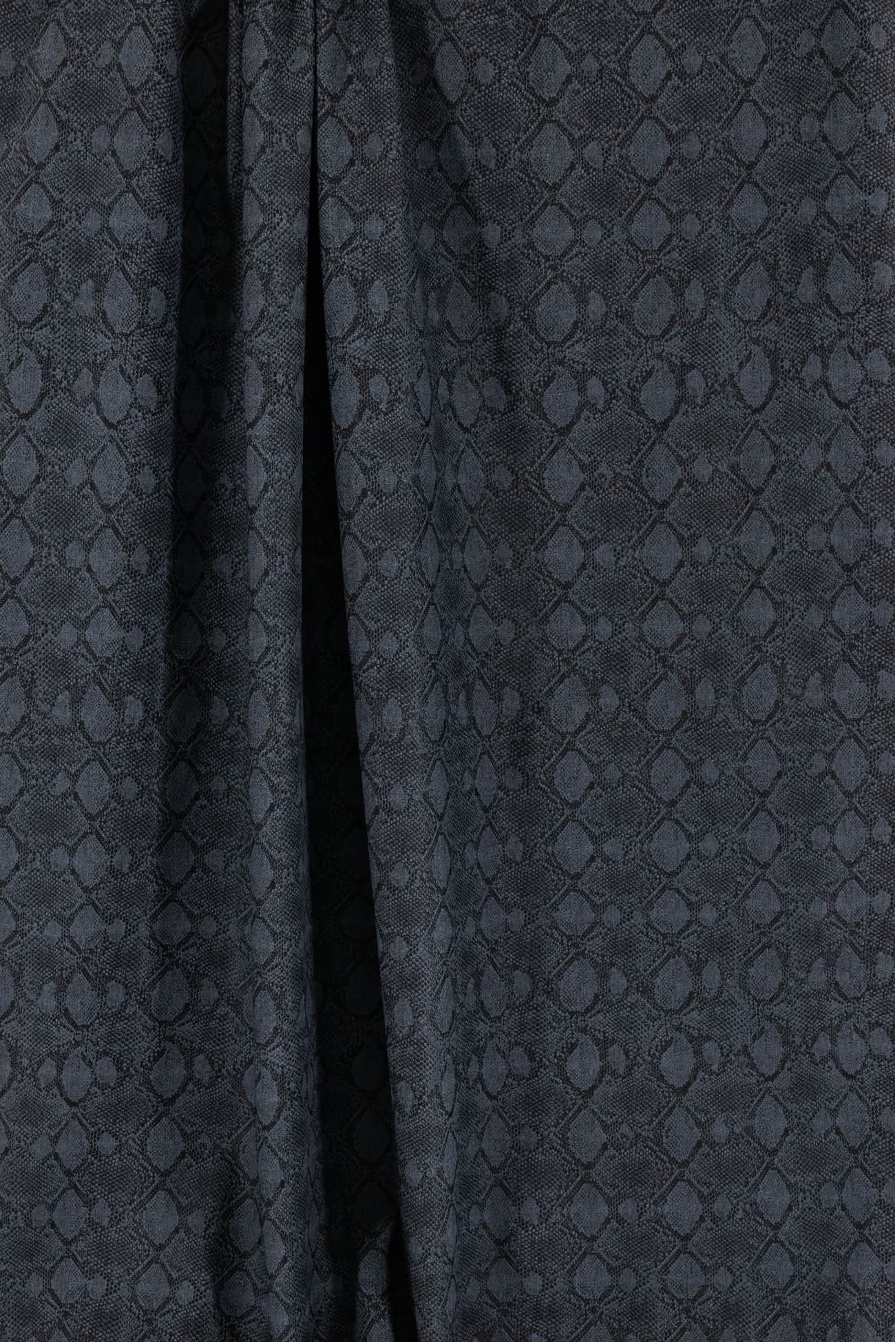 Charcoal stretch denim is overprinted with a textured cool gray lizard print. Fine quality deadstock from a New York designer, mid/heavyweight with a smooth hand, crisp sculptural drape, 5" repeat and some crosswise stretch with good recovery. Right for a jacket, coat, jeans, dress, vest, pants, skirt or workwear.