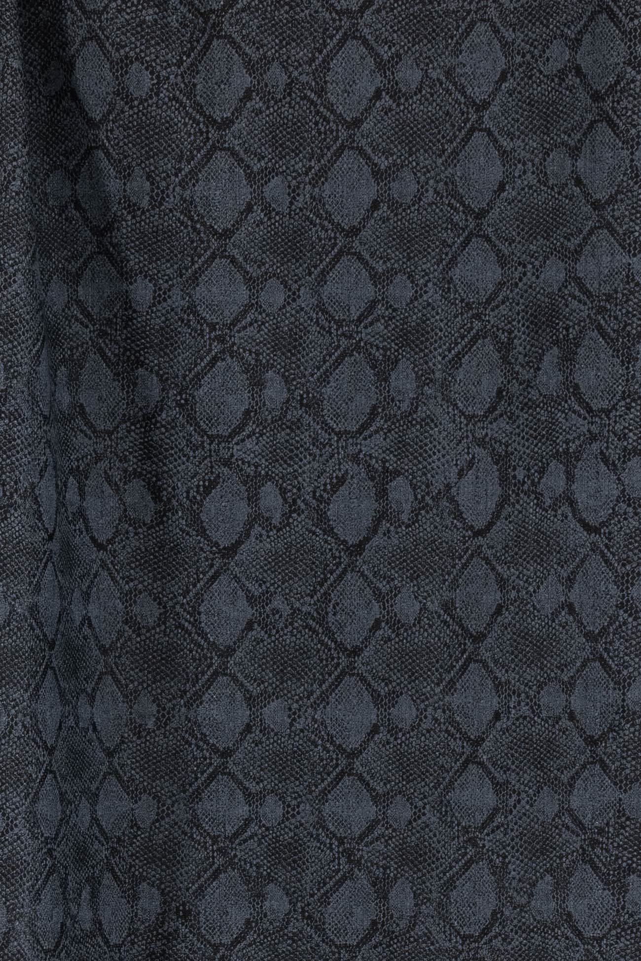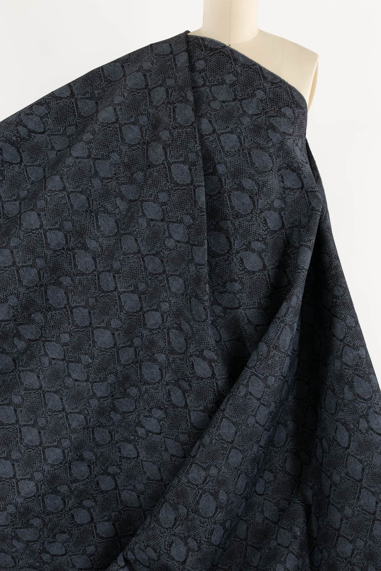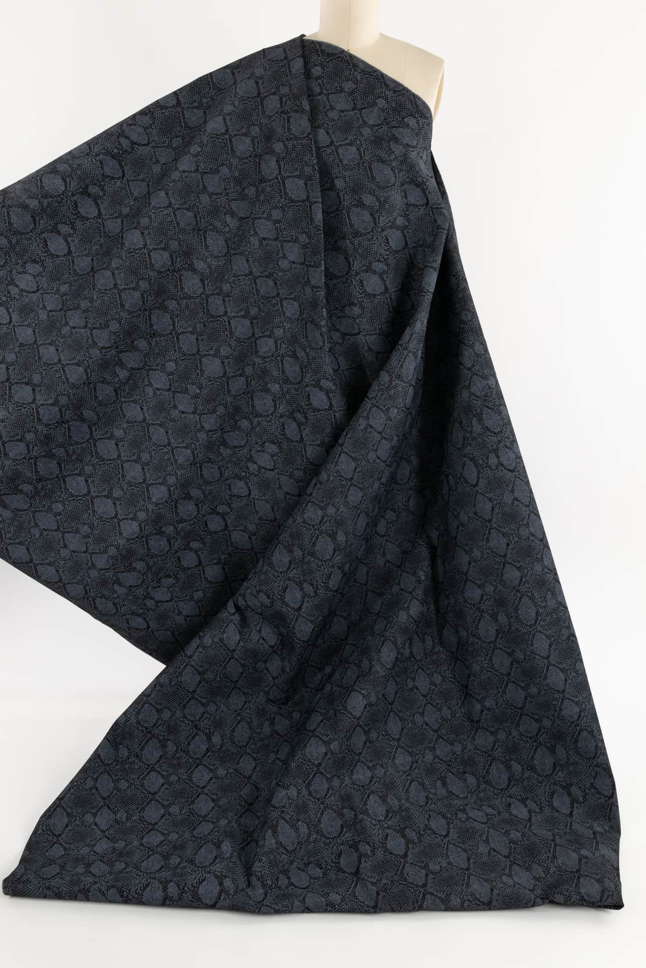 Charcoal stretch denim is overprinted with a textured cool gray lizard print. Fine quality deadstock from a New York designer, mid/heavyweight with a smooth hand, crisp sculptural drape, 5" repeat and some crosswise stretch with good recovery. Right for a jacket, coat, jeans, dress, vest, pants, skirt or workwear.