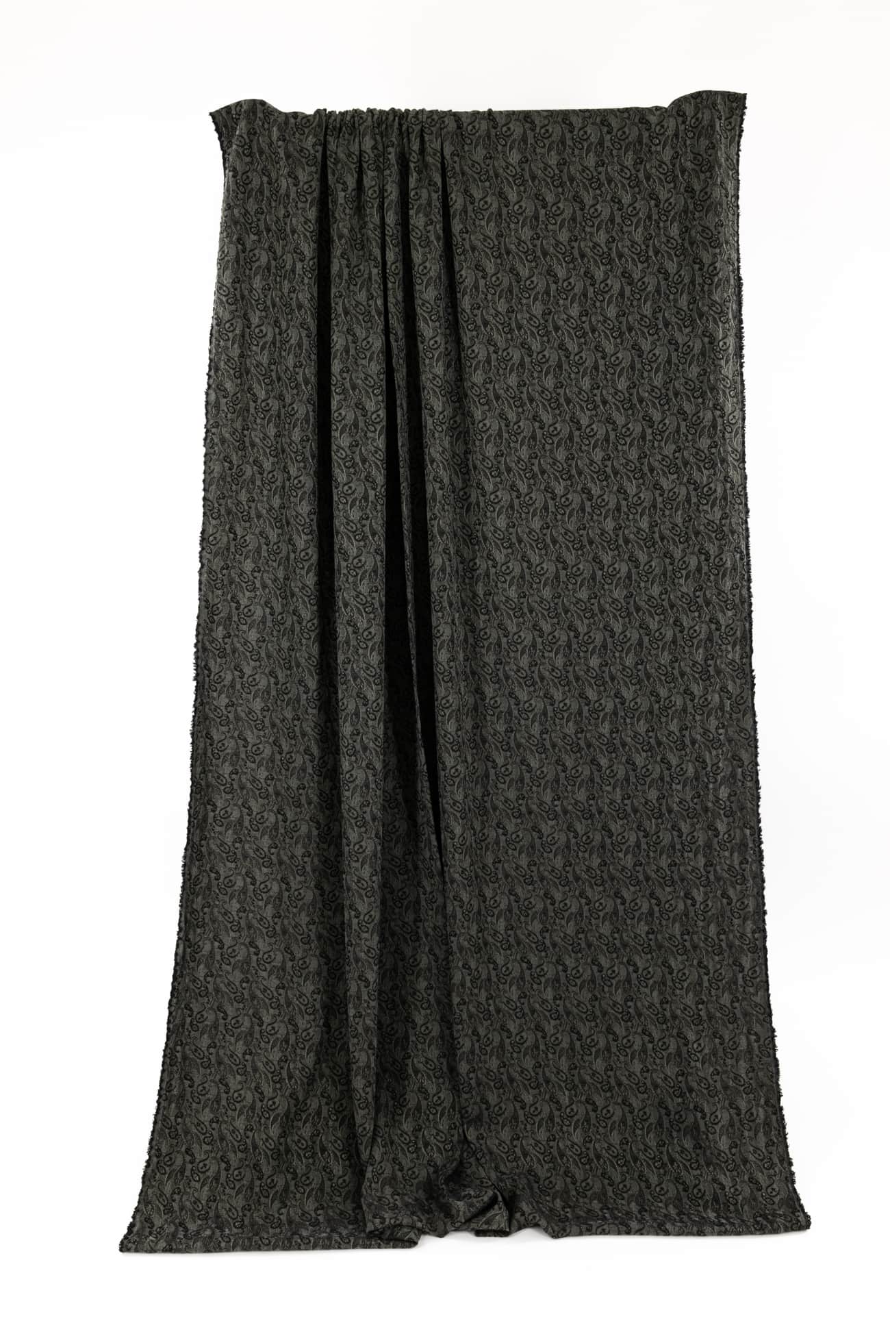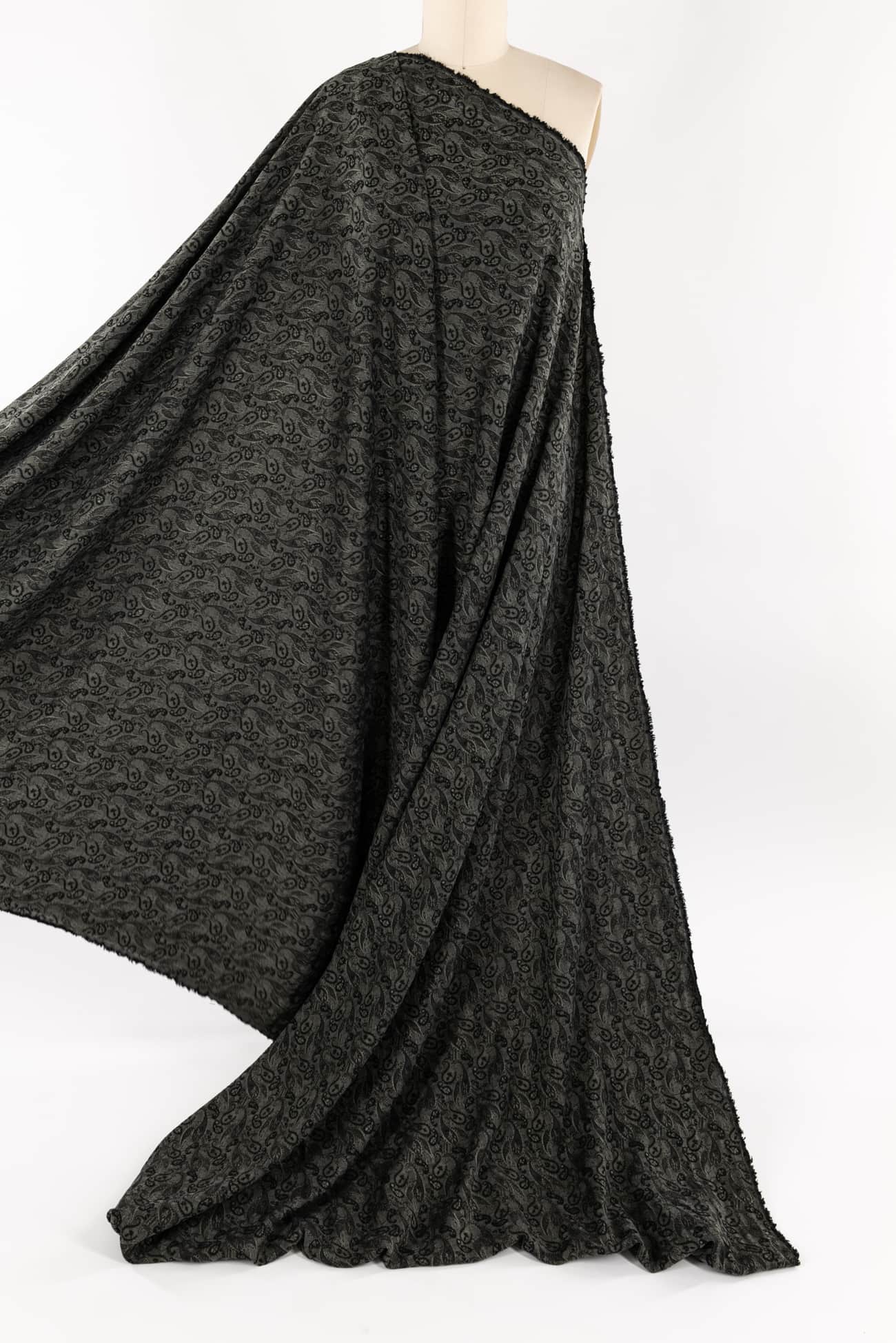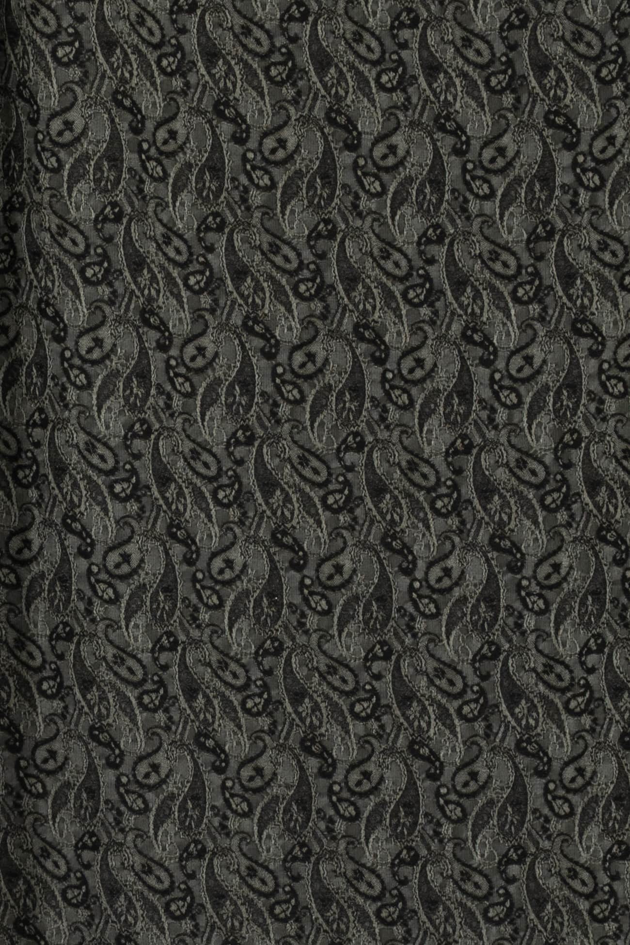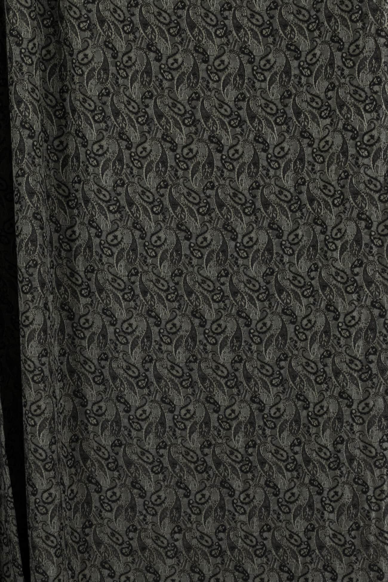 Soft sage green with a subtly striped background is overlaid with black paisleys in a fine Bemberg rayon jacquard. Beautiful deadstock from an LA designer. Light/suiting weight with a softly textured hand, 12¾" repeat and light malleable drape. Feels delicious, no wrinkling, ideal for a jacket, vest, shirt, soft pants or dress. Limited quantity.