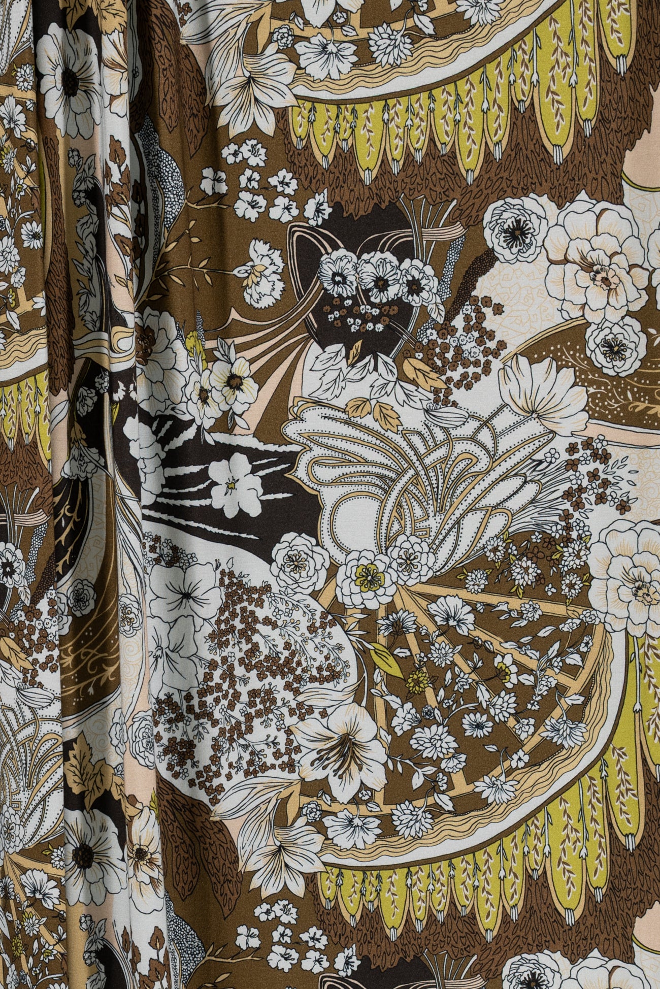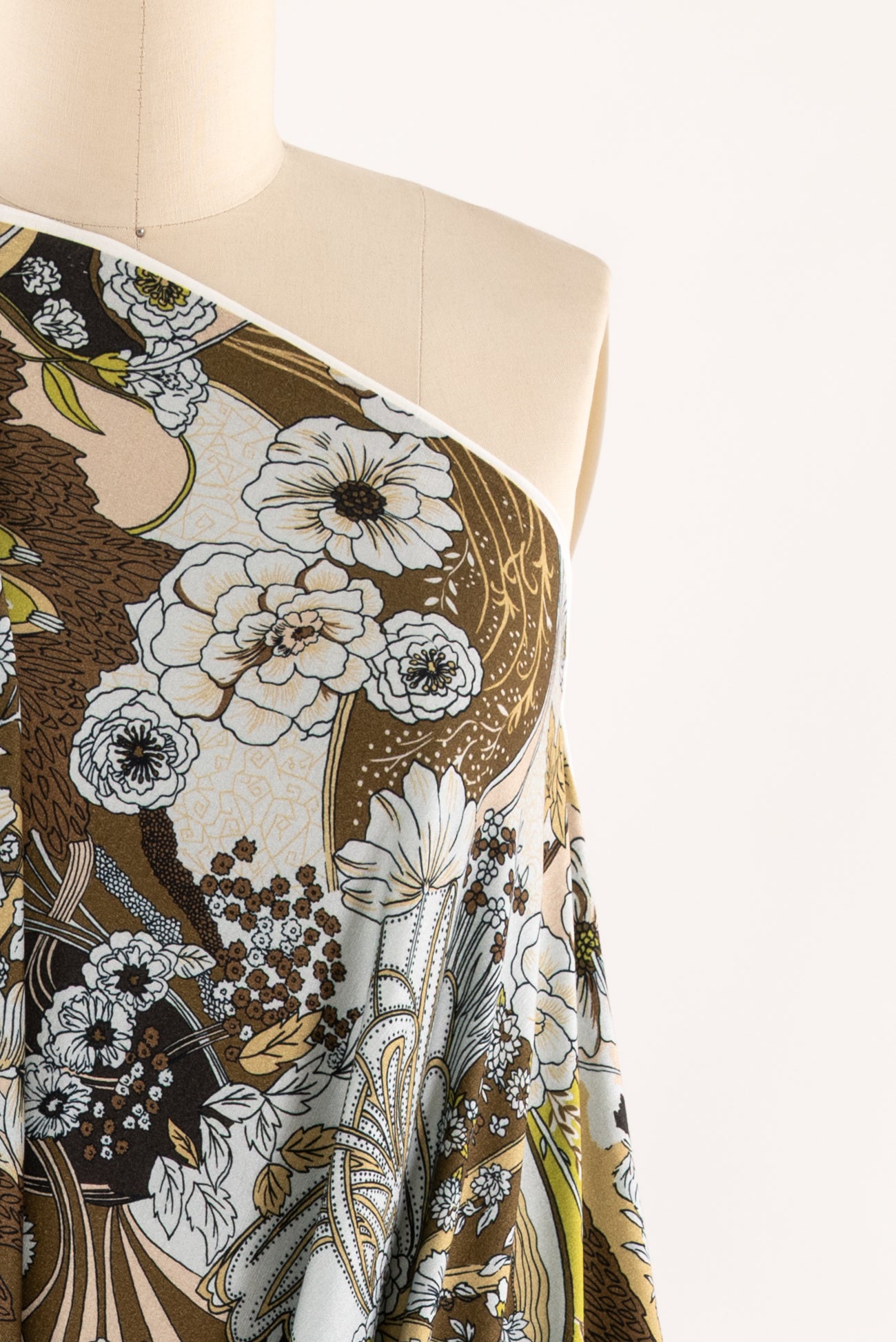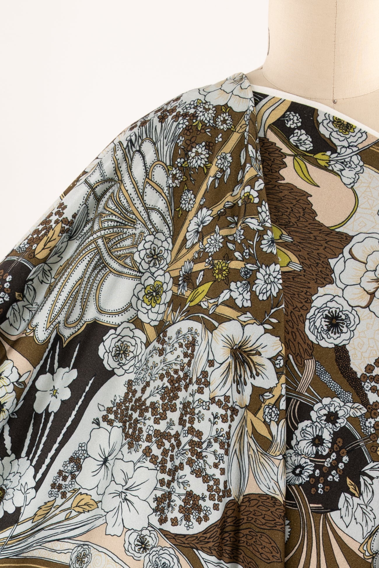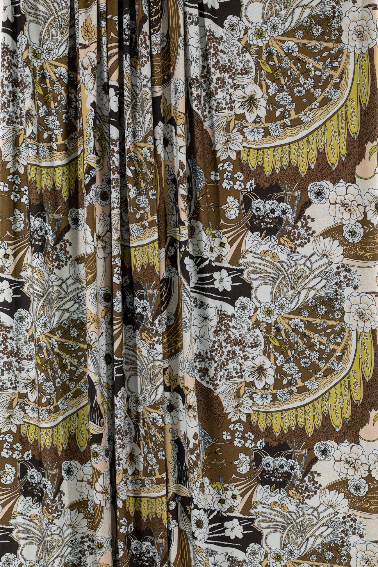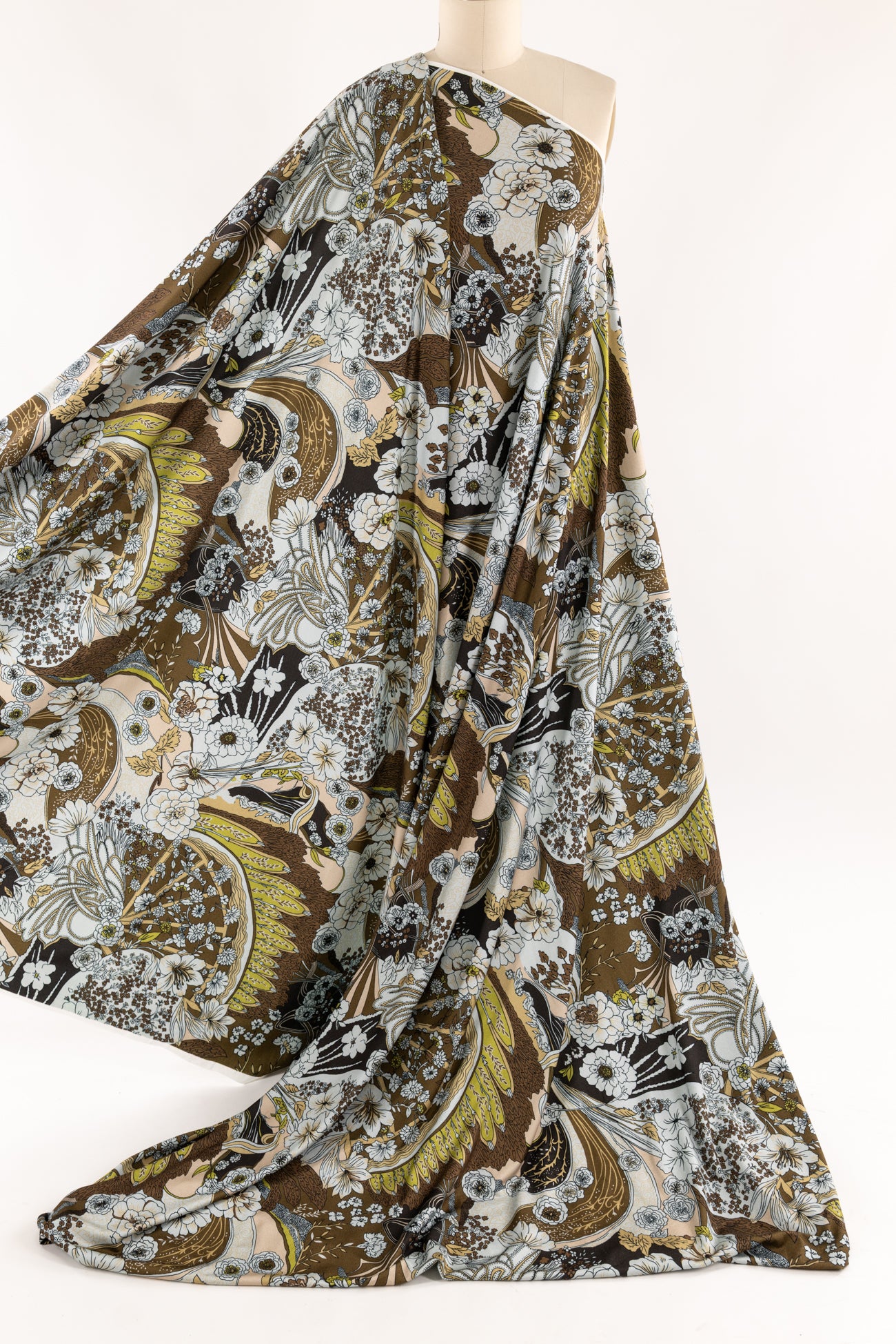 Modern floral in tones of warm greens and soft brown punched with black, deadstock from LA designer, Novella Royale (who just closed their 16 year business). Beautiful quality and weight rayon/spandex jersey - has just a touch more weight than most, opaque, with a soft, smooth, matte hand, 4 way stretch, minimal rolling at the cut edge. Right for a dress, skirt, tunic, t-shirt, soft pants, leggings, caftan, kimono, jumpsuit. One way design, 20" repeat.