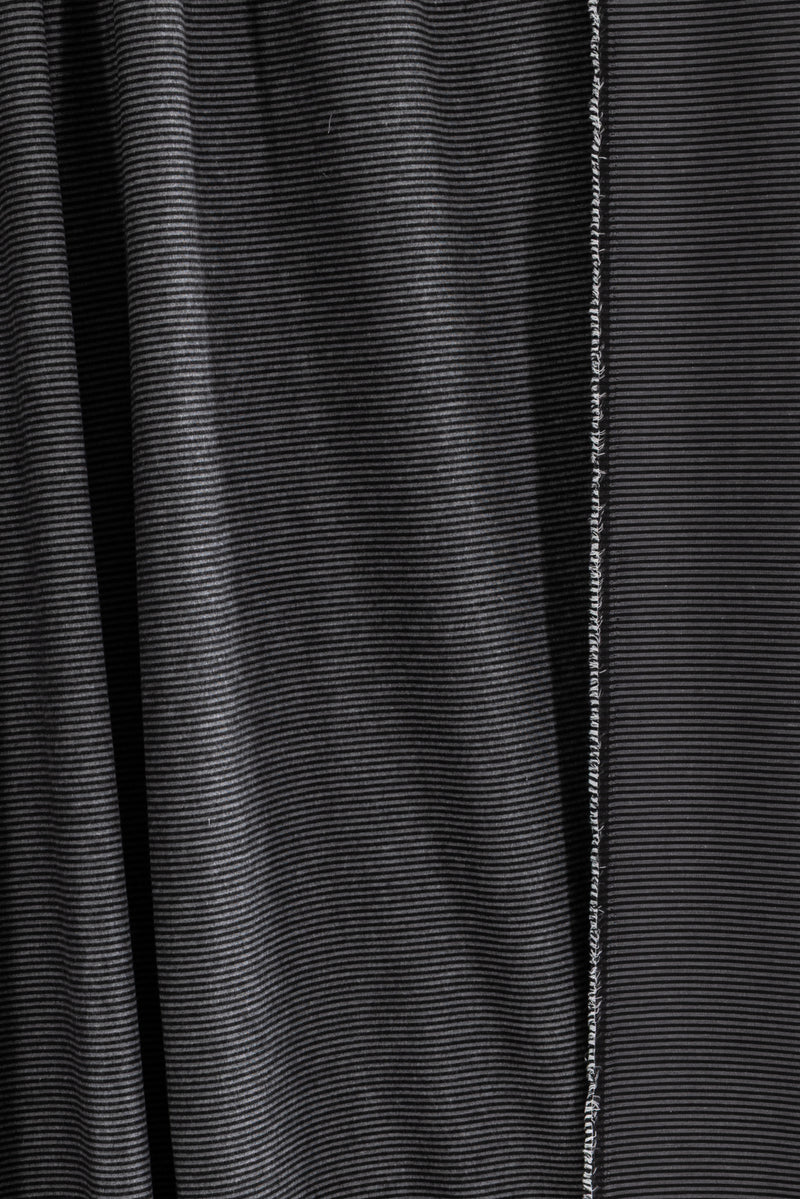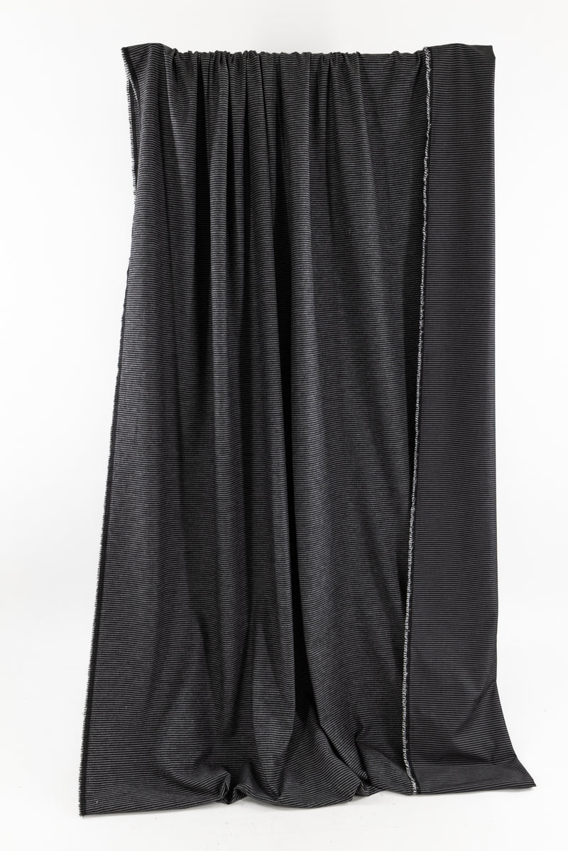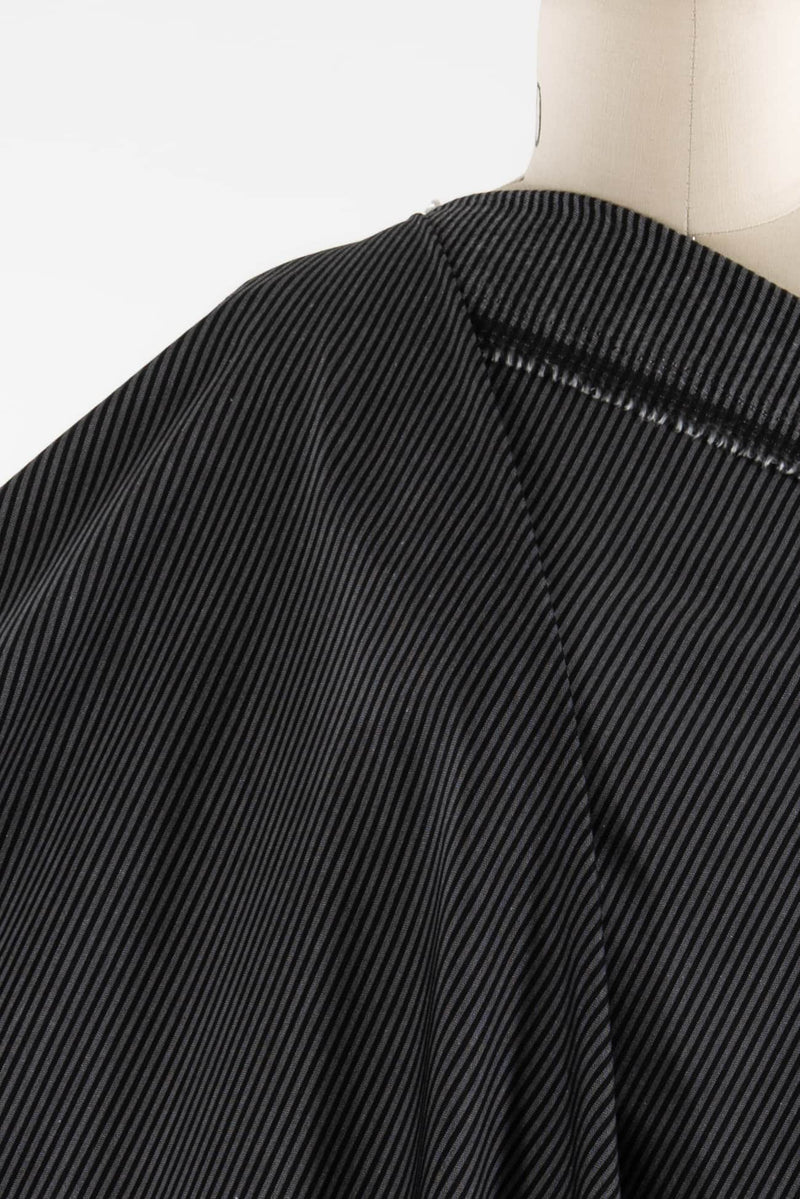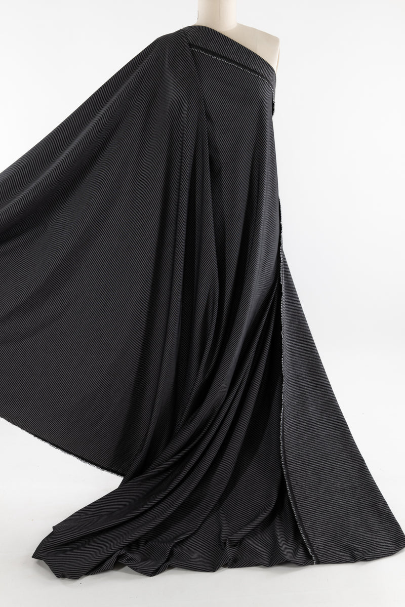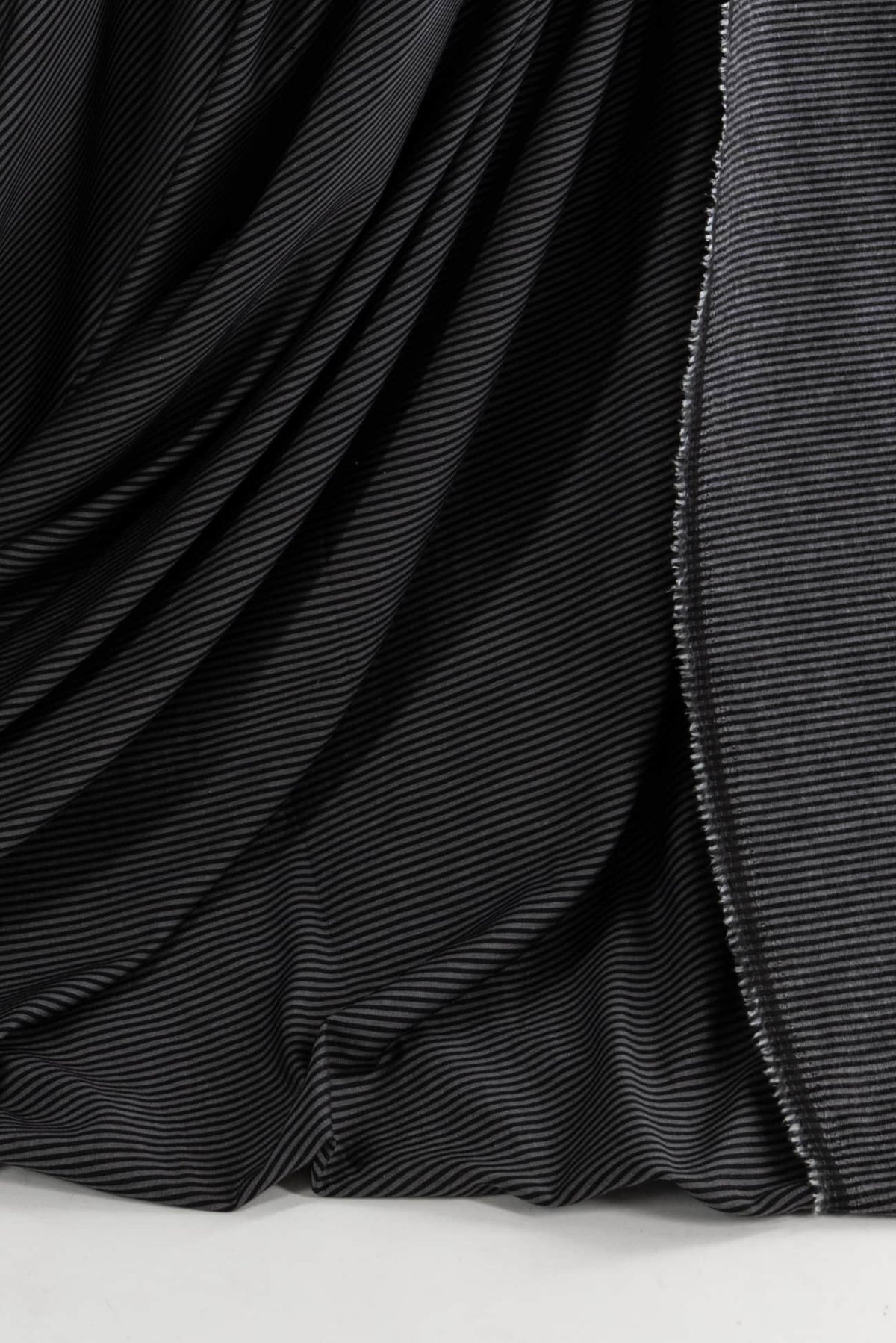 Polished black and gray stripes in a fine quality yarn-dyed rayon blend, deadstock from LA designer Katrin Noon for Spirithouse. Light/mid-weight, opaque, with a soft smooth hand and soft supple drape. Right for a dress, skirt, blouse, tunic, kimono, caftan, soft pants, men's or sophisticated children's.