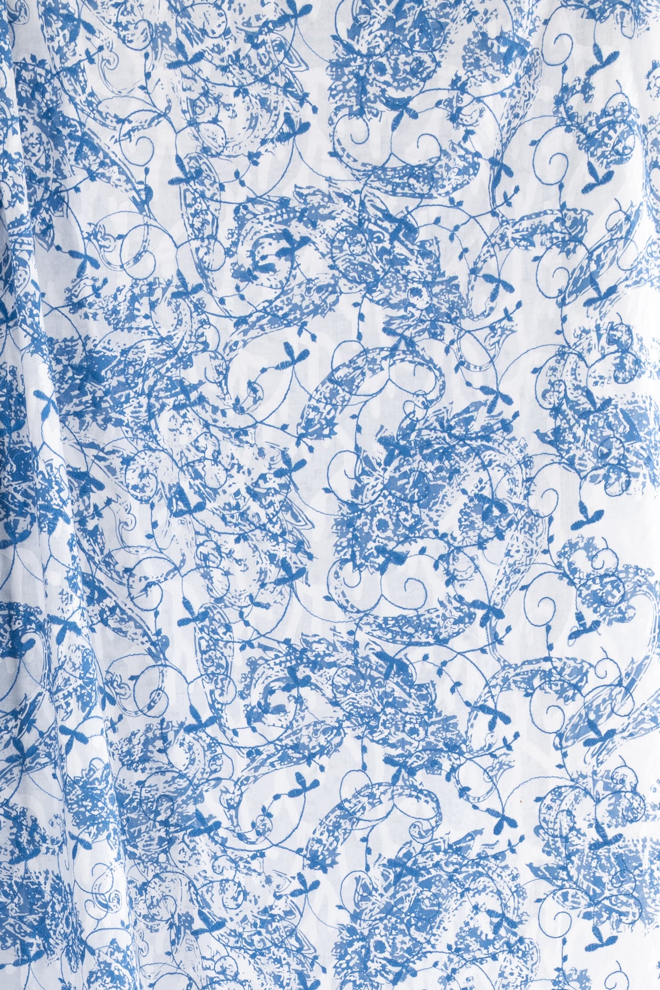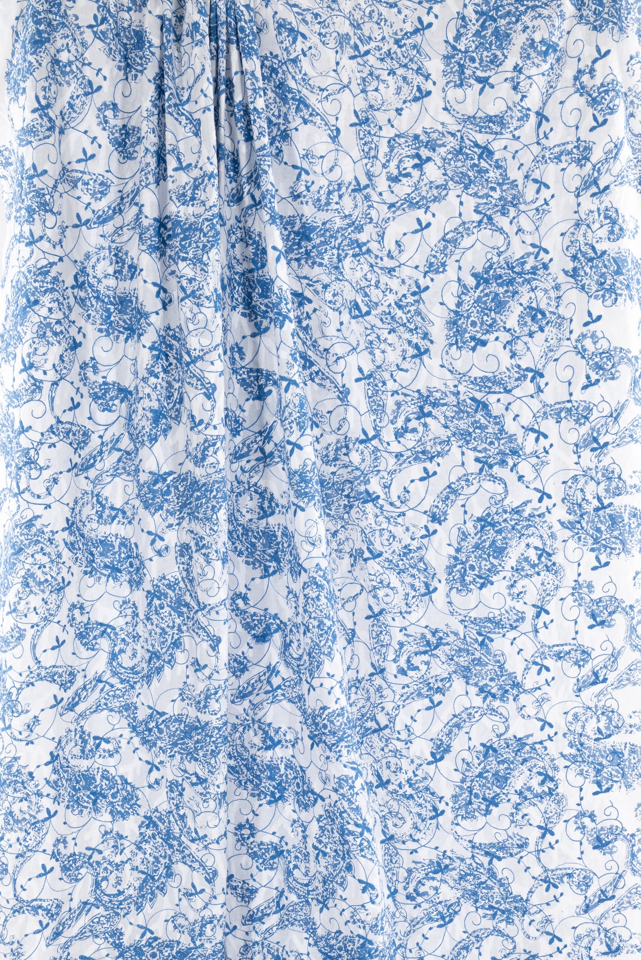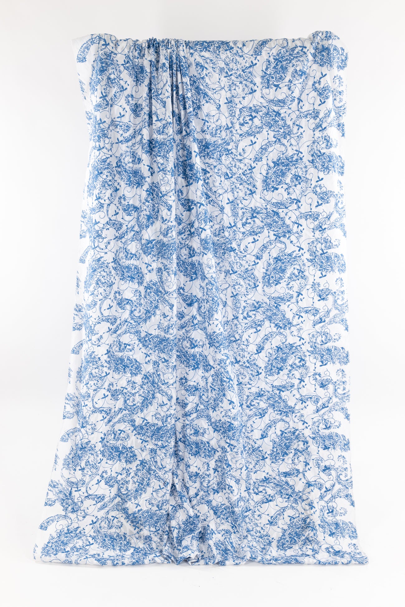 Blue paisley print on a beautiful subtle white-on-white jacquard is embroidered with delicate blue flowers. Lightweight with a softly textured hand, 11¾" repeat, and supple airy drape - the embroidery adds a bit of weight to the drape. Right for a dress, shirt, blouse, tunic, caftan, kimono, caftan, or children's.