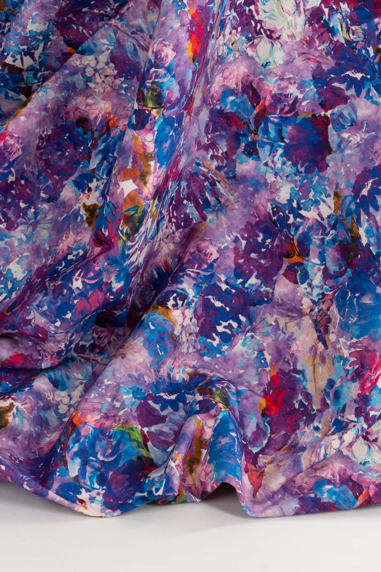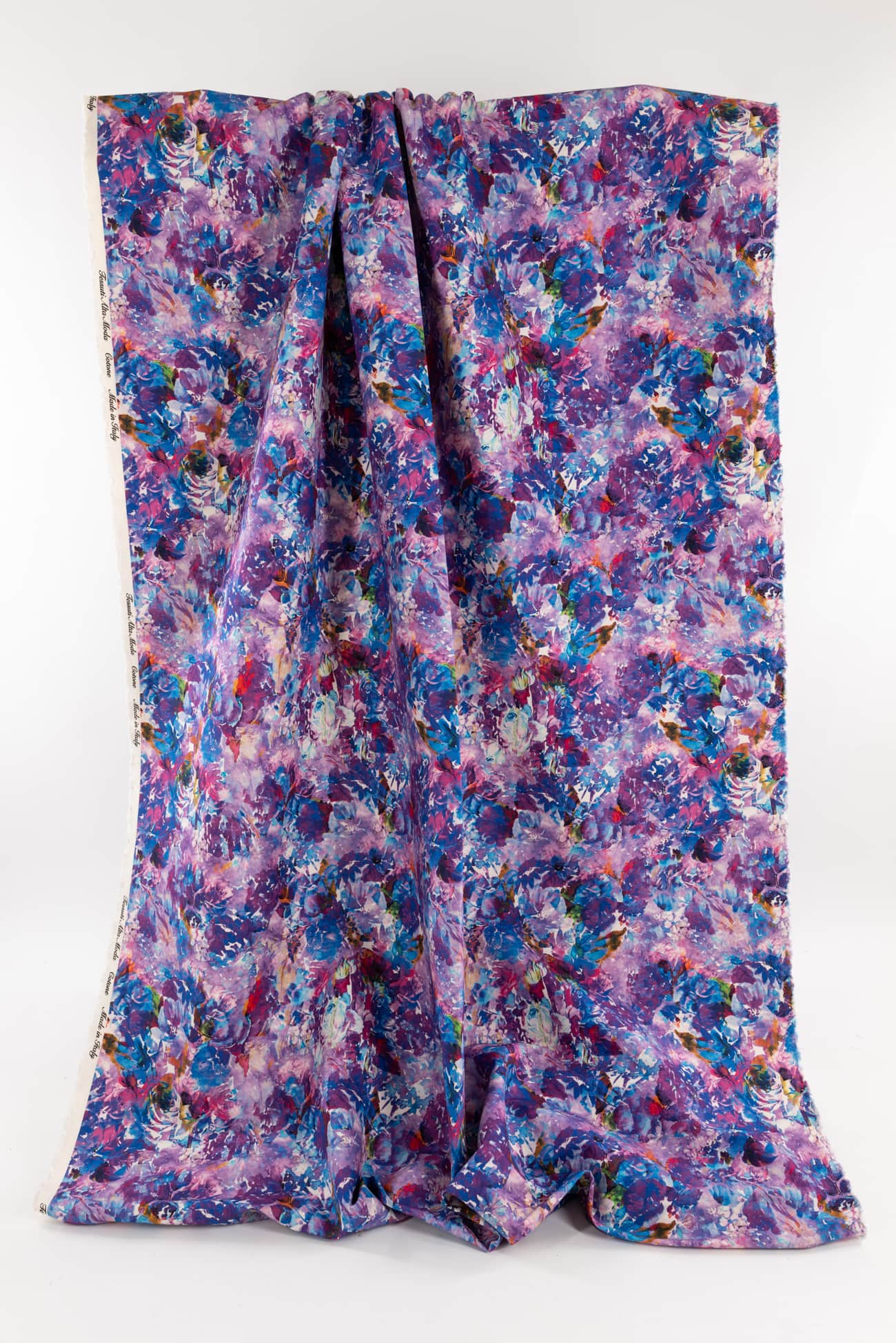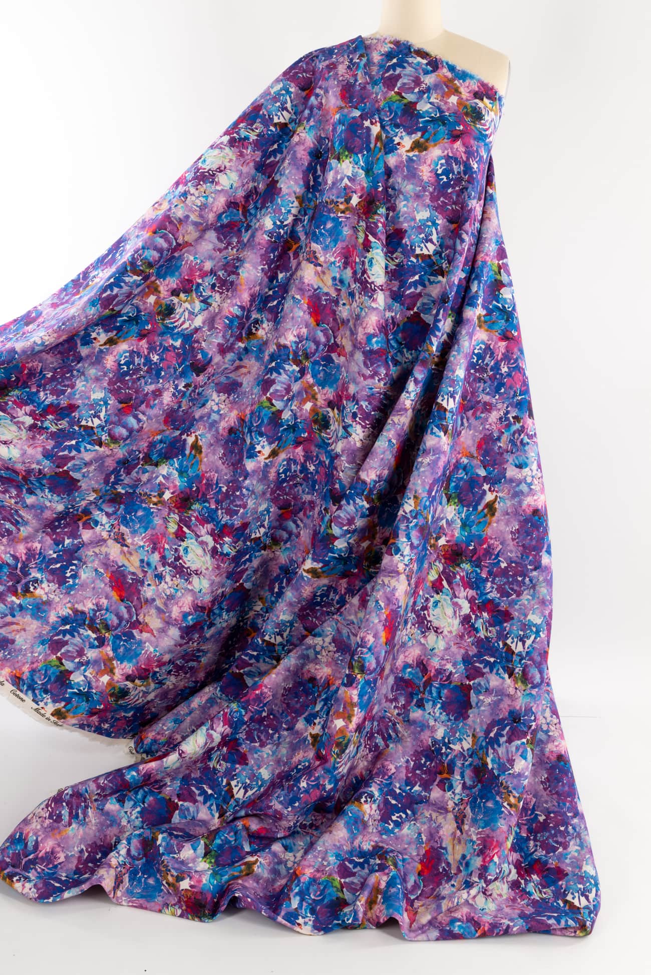 Stunning abstract floral in shades of blue and purple digitally printed on cotton, fine quality deadstock from an Italian mill. The base fabric is heavyweight with a smooth fine grained hand, 19¾" repeat and structured drape. Right for a jacket, vest, tunic, structured dress, skirt, jeans, pants or children's. Limited quantity.