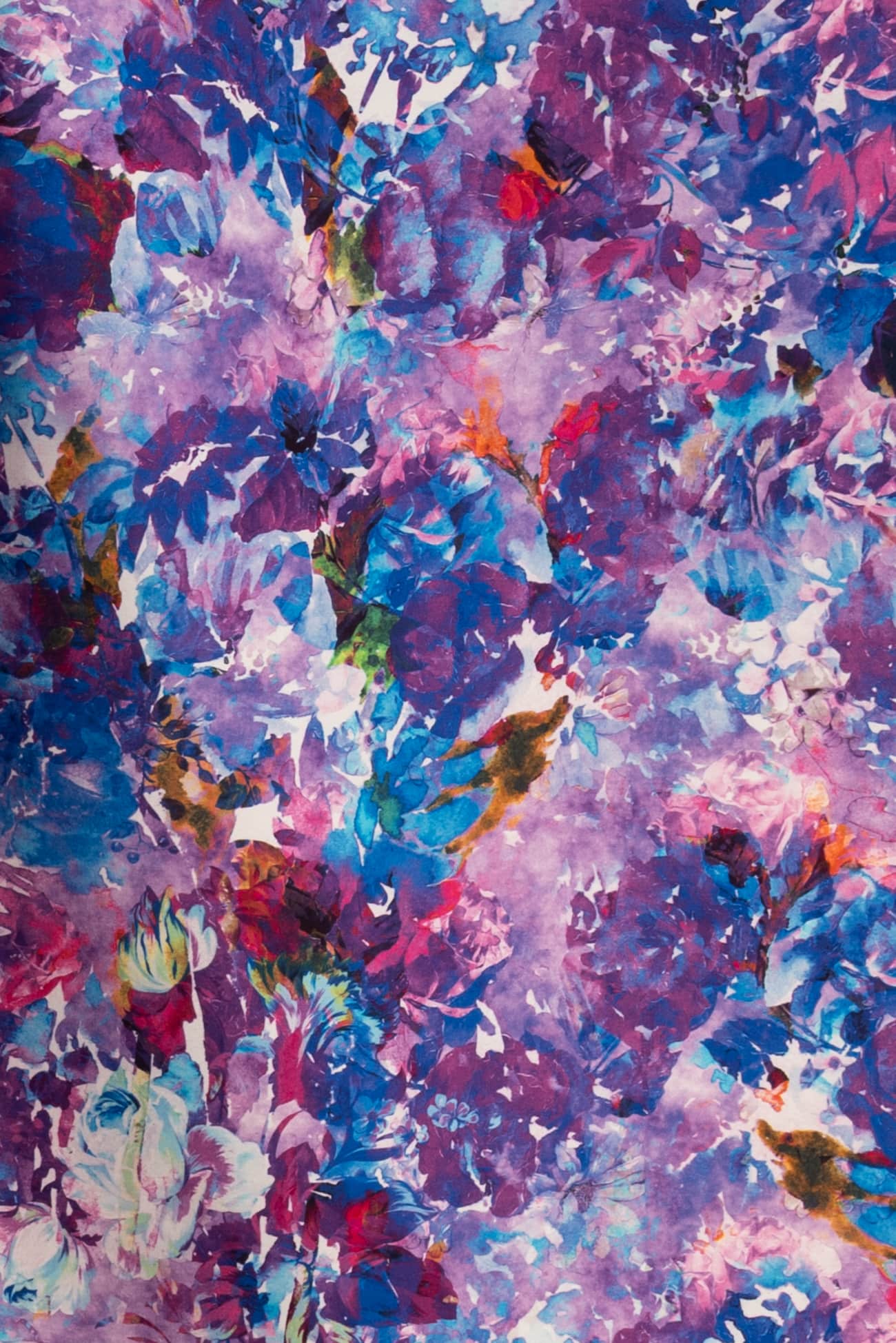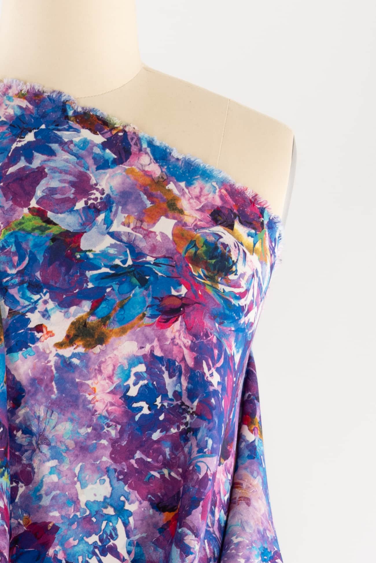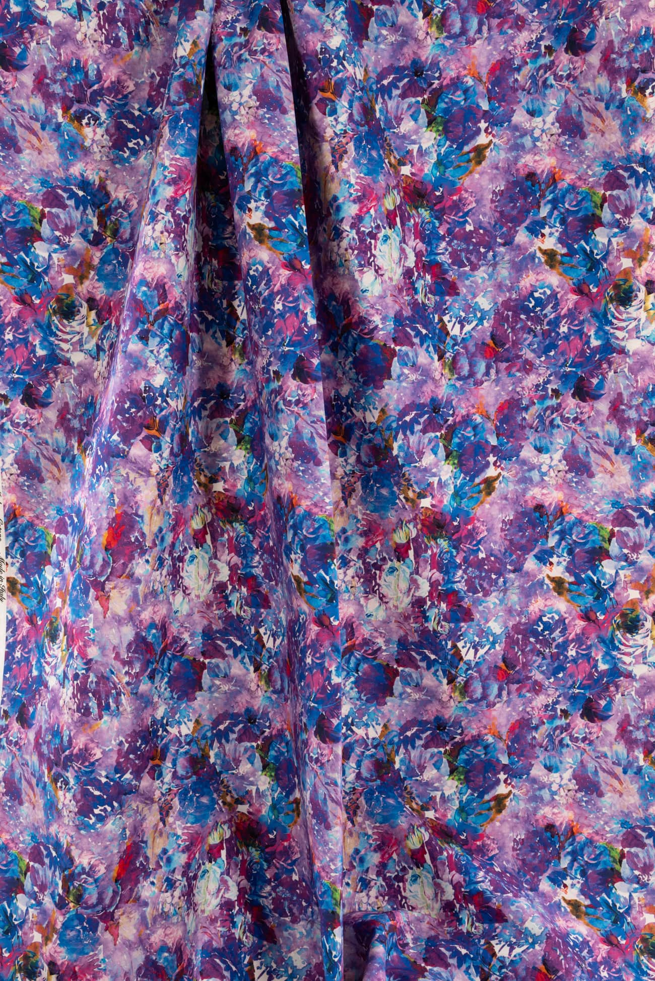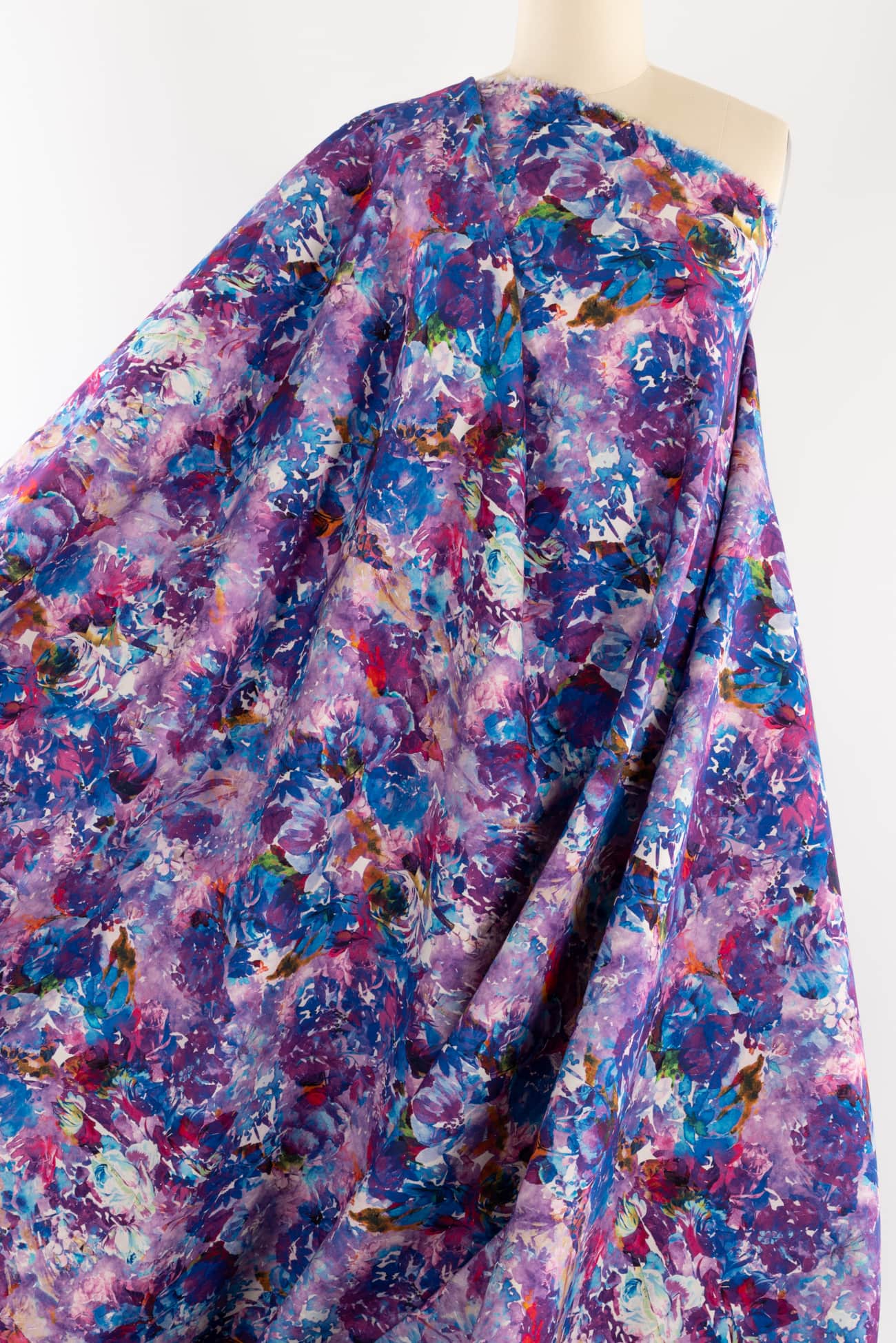 Stunning abstract floral in shades of blue and purple digitally printed on cotton, fine quality deadstock from an Italian mill. The base fabric is heavyweight with a smooth fine grained hand, 19¾" repeat and structured drape. Right for a jacket, vest, tunic, structured dress, skirt, jeans, pants or children's. Limited quantity.