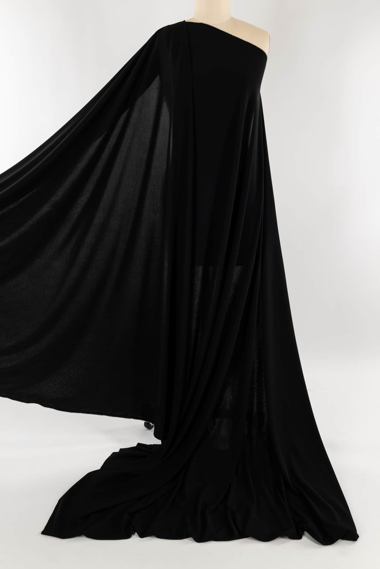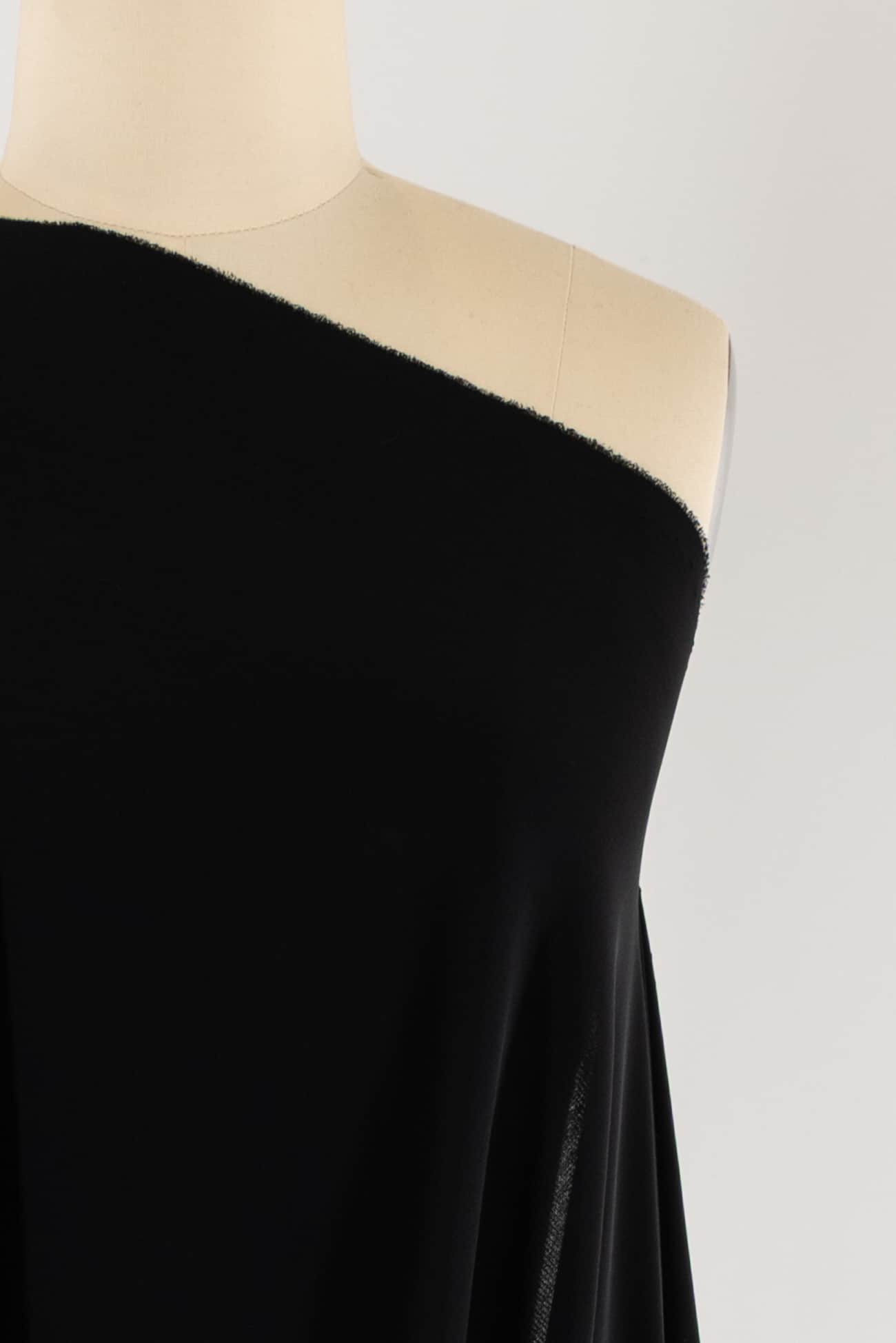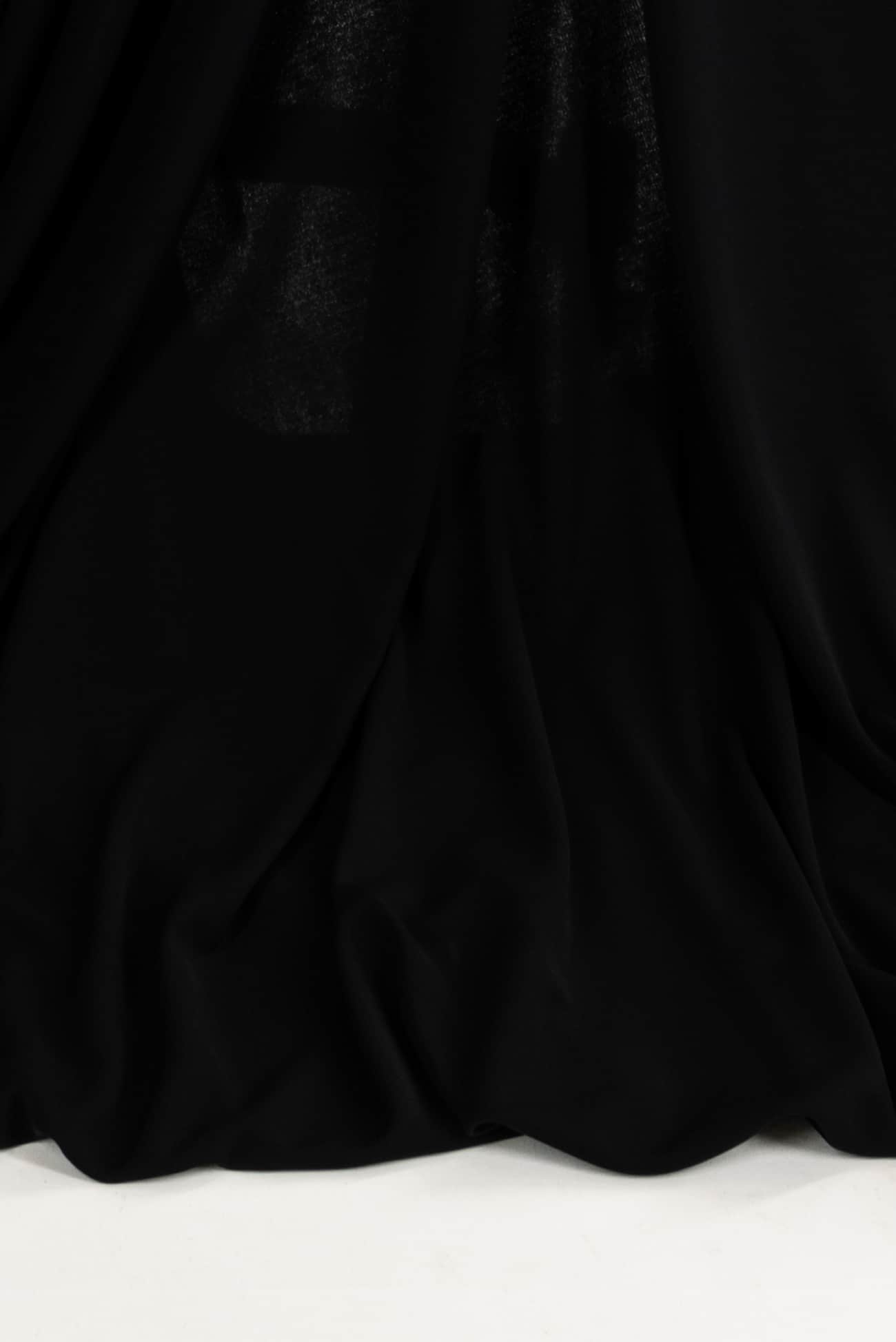 Sumptuous black matte jersey double knit made with fine rayon crepe yarns. Matte jersey is known for having a lovely 'dry' hand and an elegant look. LA deadstock with an easy fluid drape and just enough of a crosswise stretch for a flattering fit. It's easy to sew and won't wrinkle. Right for a graceful dress, skirt, top, tunic, light vest, caftan and more. Marcy says, 'Matte jersey is rare, our supplier found a small batch and I scooped it up. It was beloved by designers in the '30's and 40's such as Madam Grès, famous for her draped matte jersey gowns'