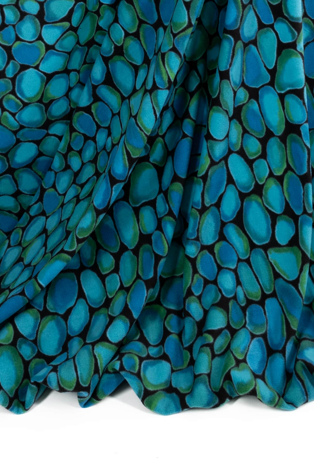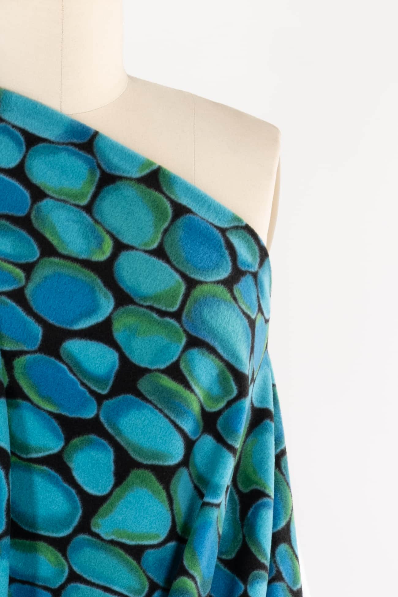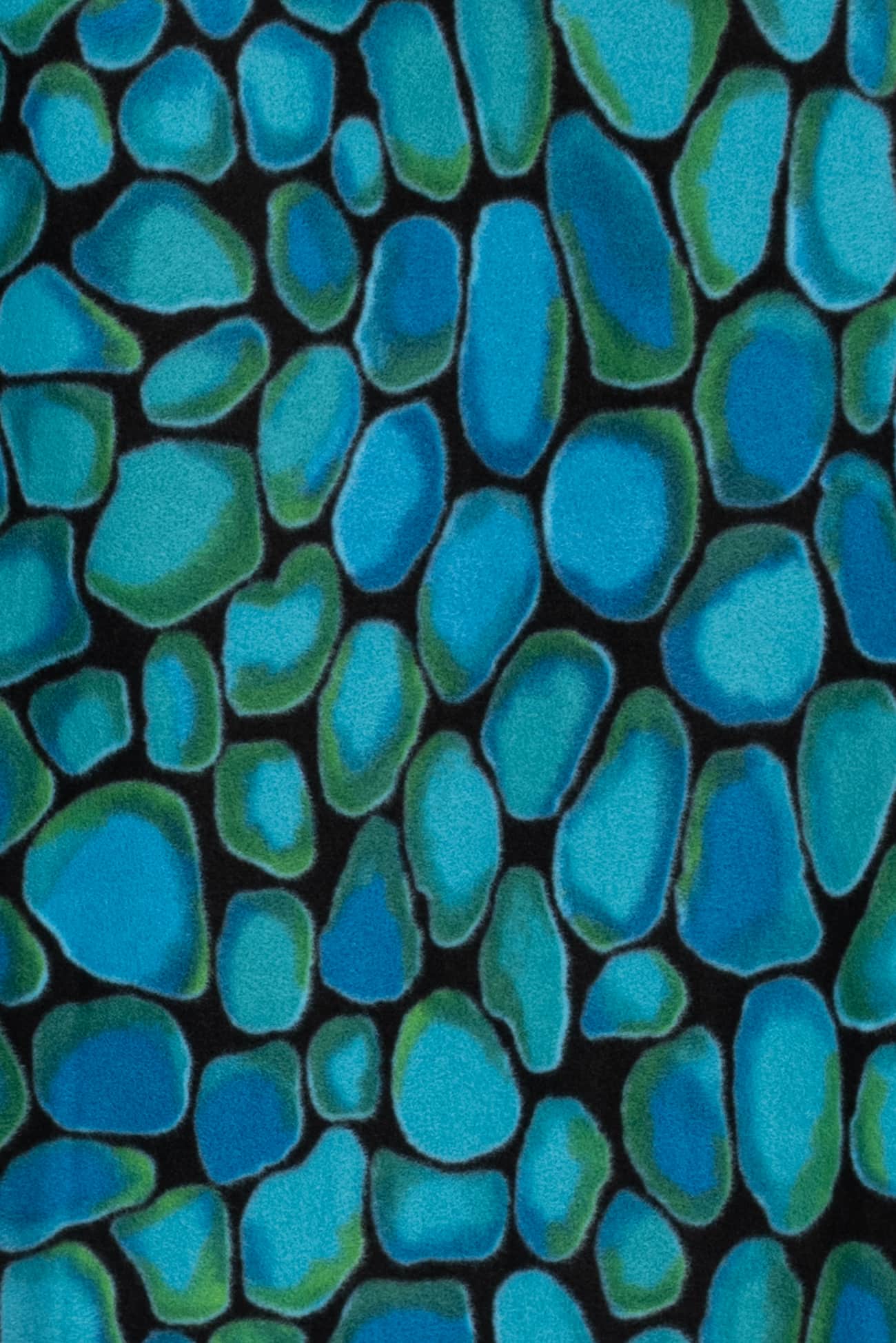 Soft and cozy fleece knit with an overall color saturated print evoking smooth turquoise stones etched in black. Think P@tagonia with a cool print. Softly brushed fleece on the front, flat and smooth on the reverse and no raveling so no seam finish needed. Mid-weight with crosswise stretch, a touch of rolling at the cut edge and a 22" repeat. Perfect for cozying up in a top, t-shirt, tunic, hoodie, jacket, vest, joggers or a throw.