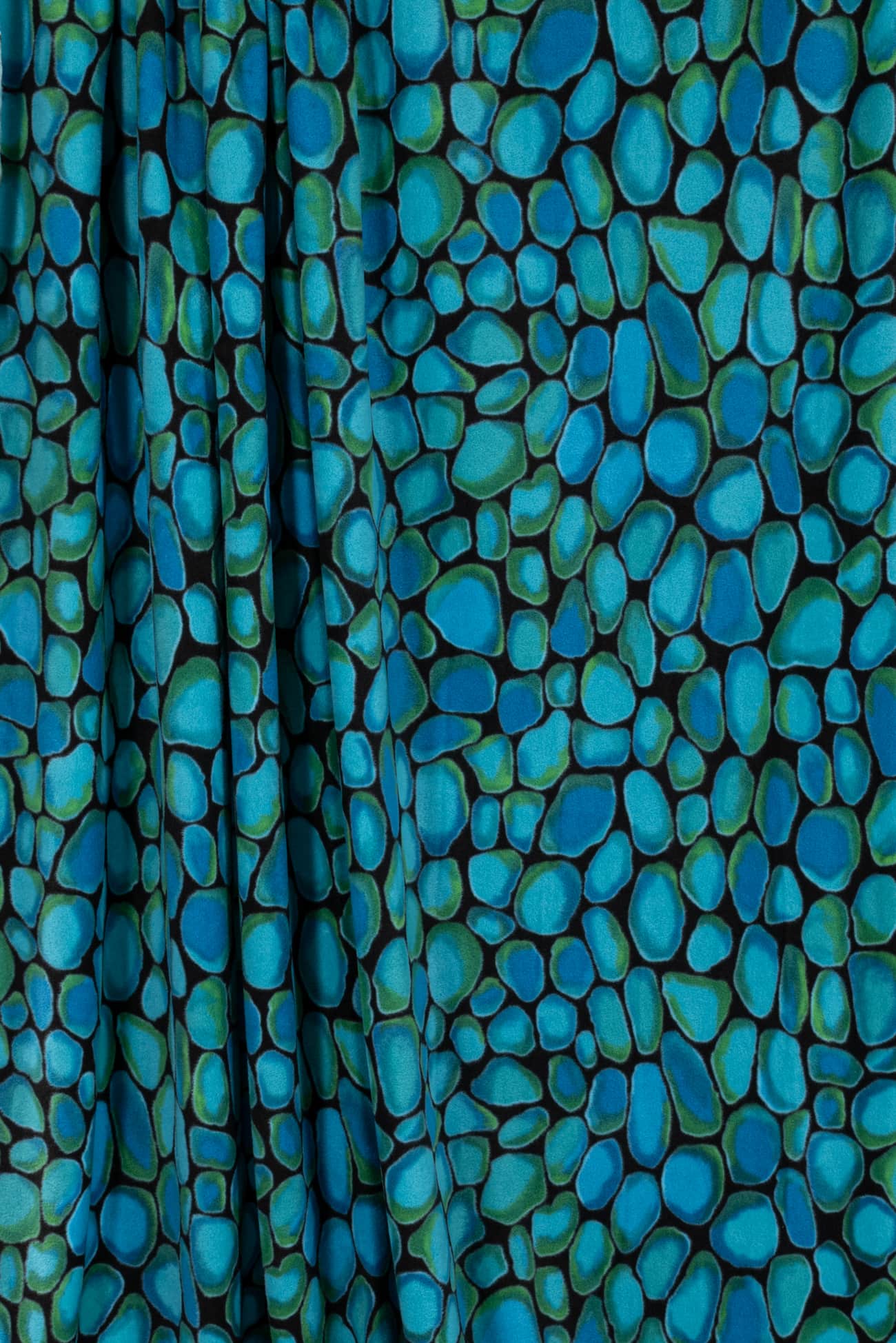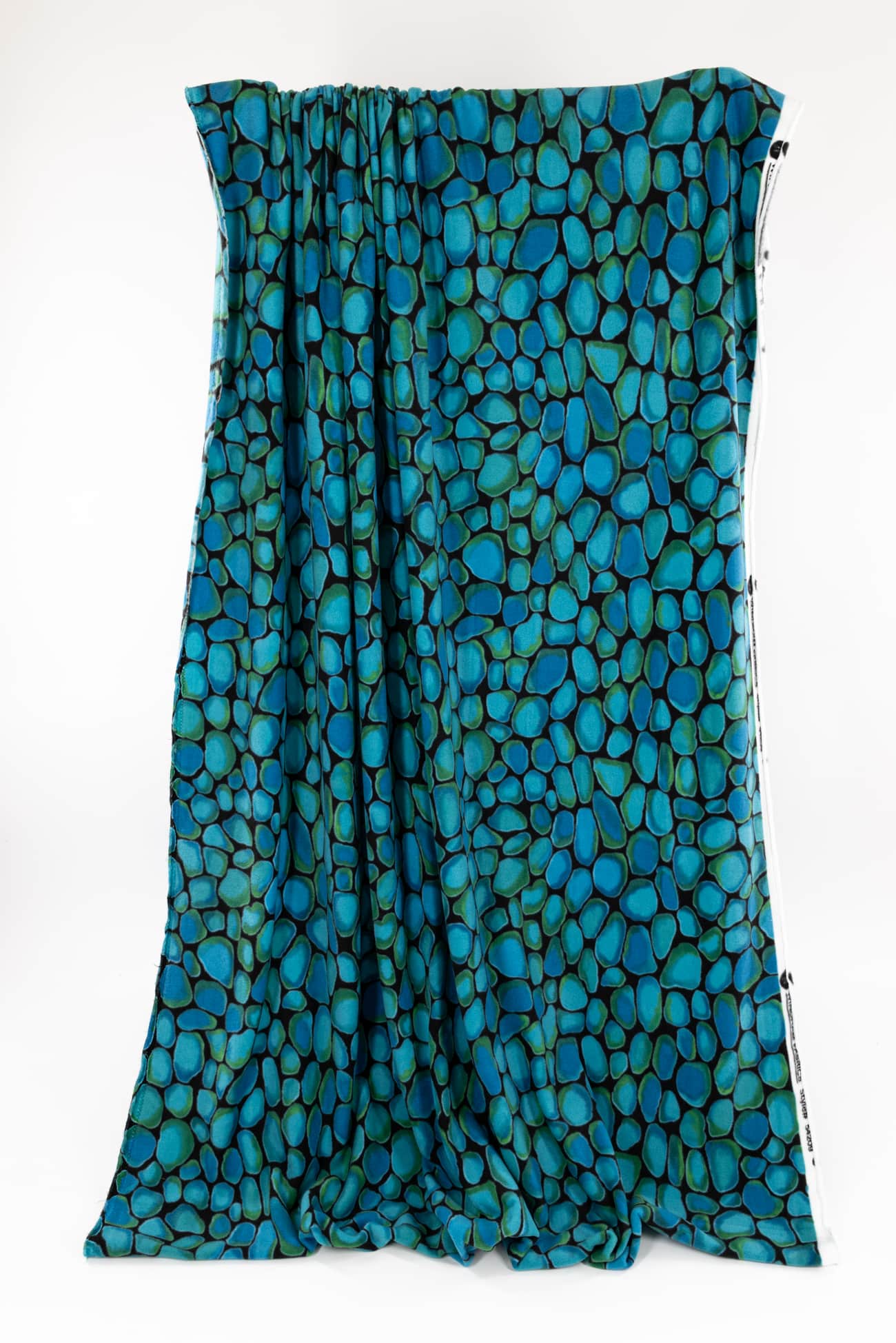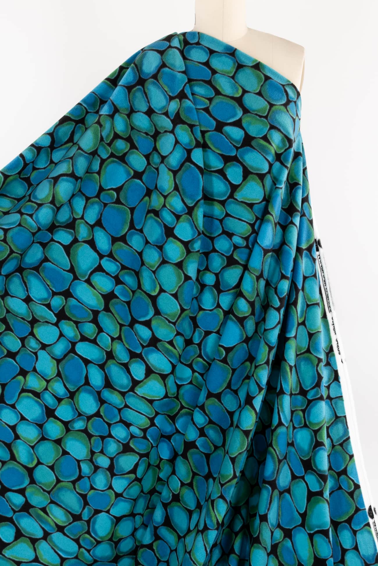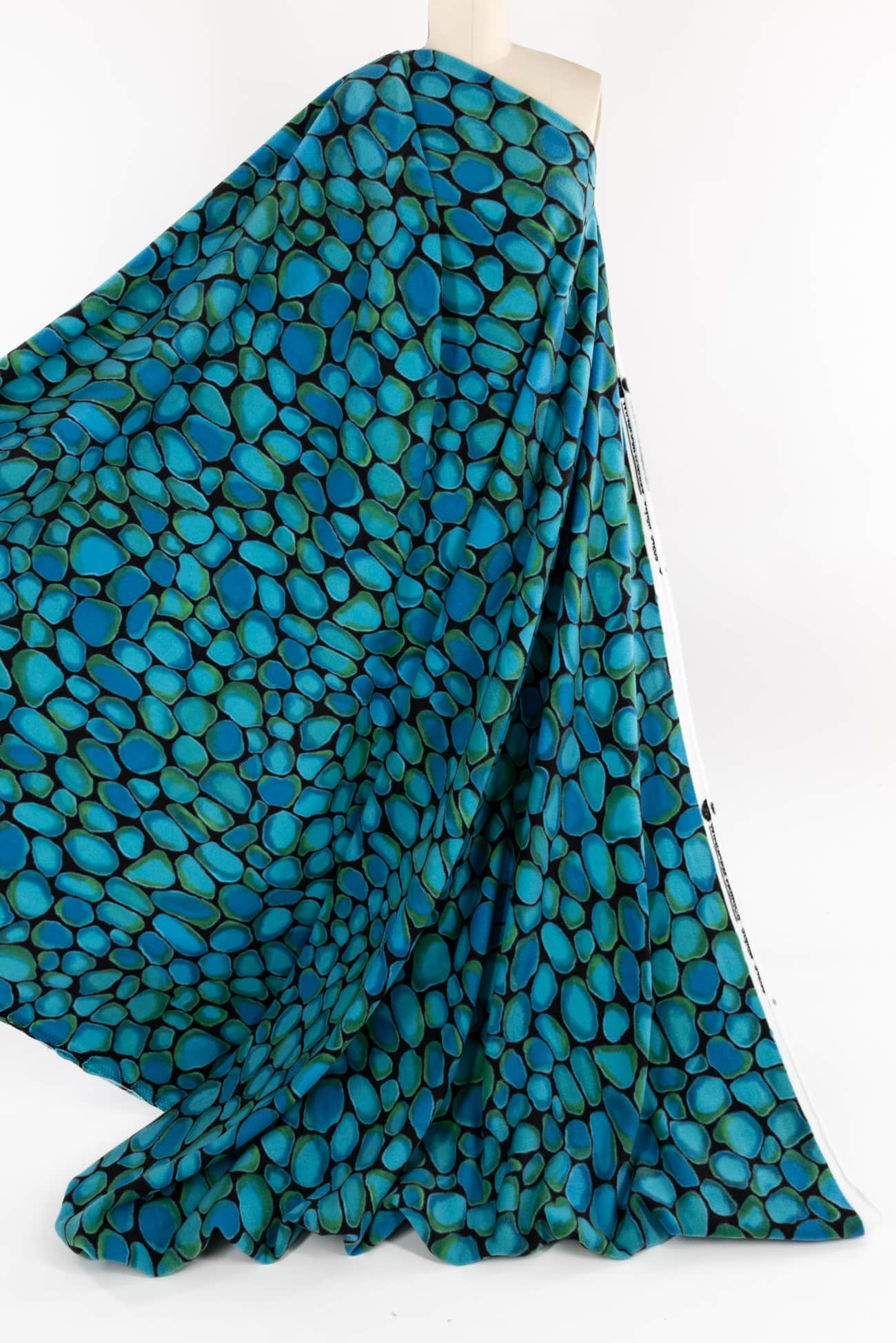 Soft and cozy fleece knit with an overall color saturated print evoking smooth turquoise stones etched in black. Think P@tagonia with a cool print. Softly brushed fleece on the front, flat and smooth on the reverse and no raveling so no seam finish needed. Mid-weight with crosswise stretch, a touch of rolling at the cut edge and a 22" repeat. Perfect for cozying up in a top, t-shirt, tunic, hoodie, jacket, vest, joggers or a throw.