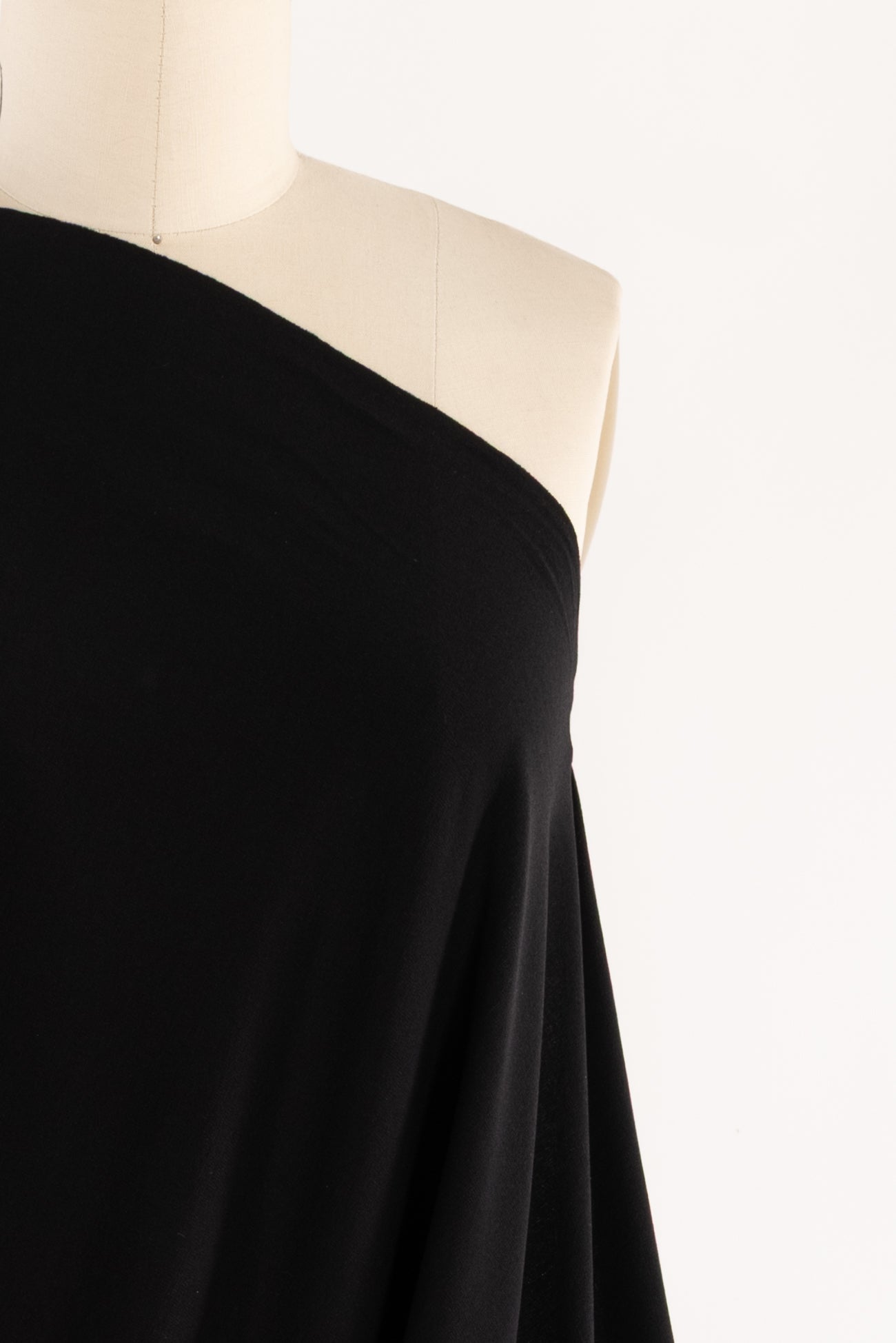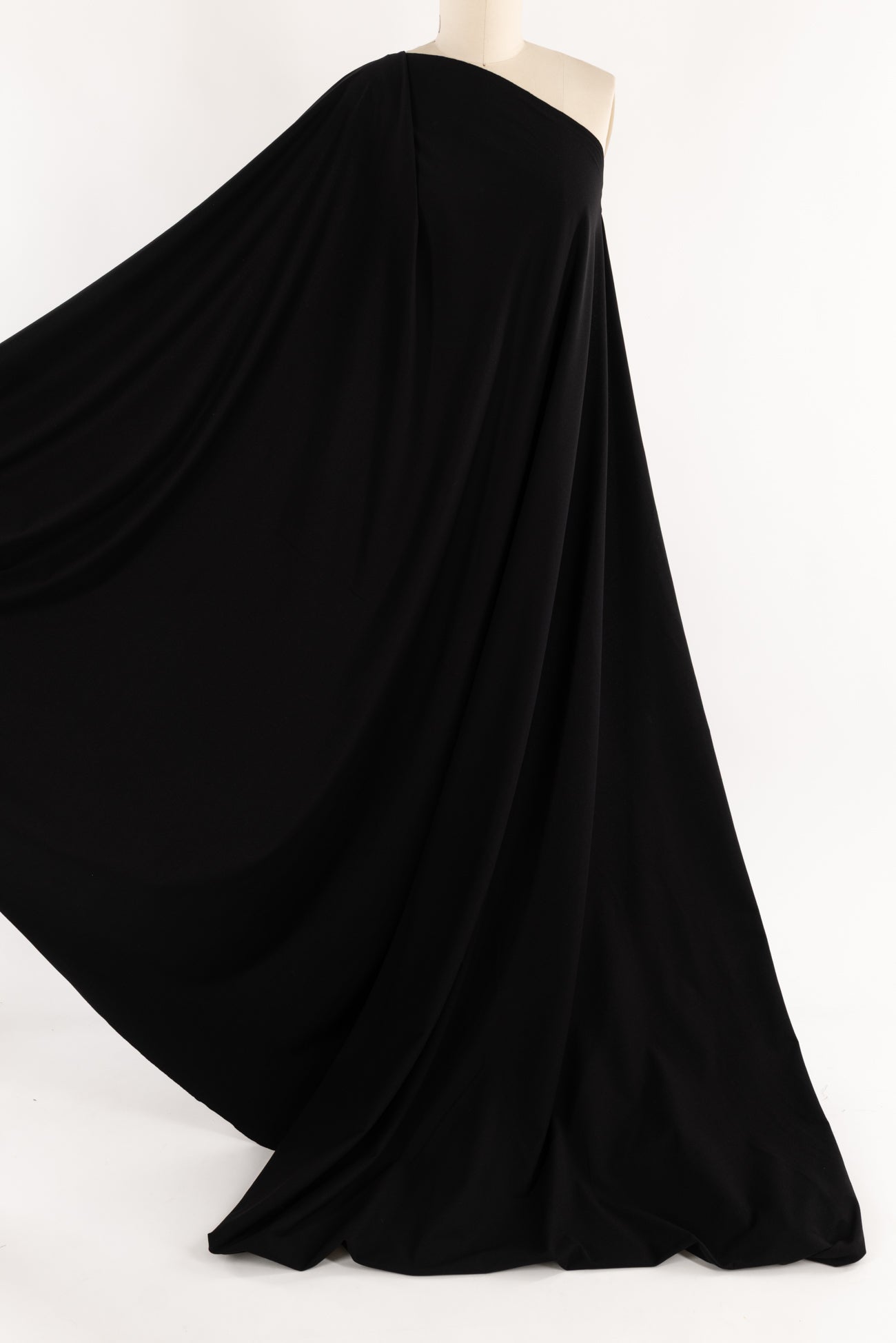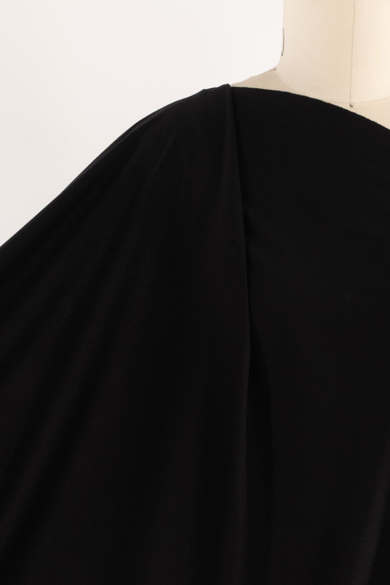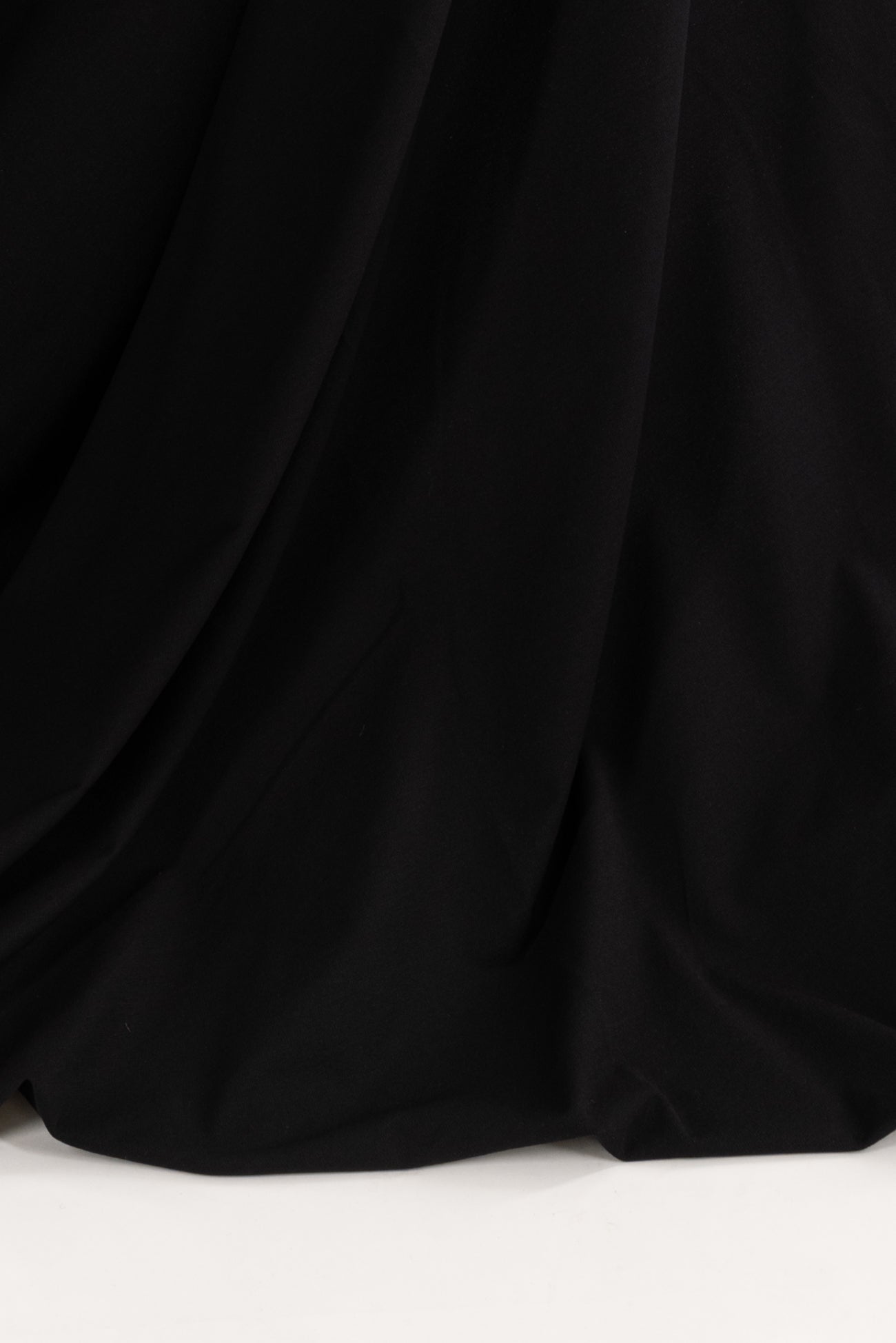 Classic pure black in a fine quality technical knit, produced in an Italian mill, Lulu-like deadstock from an LA designer. Light/mid-weight, with a cool, dry hand, fine grained French terry on the reverse, supple soft drape, 4-way stretch, and little rolling at the cut edge. The subtle, lightly pebbled, crepe-like texture of the reverse makes a nice contrast with the face side as trim or edging. Right for both tops and bottoms, a t-shirt, top, dress, sweater, soft pant, skirt, light jacket, leggings, or cardi. Marcy says, 'The presence of nylon is always an indication of quality in any textile.'