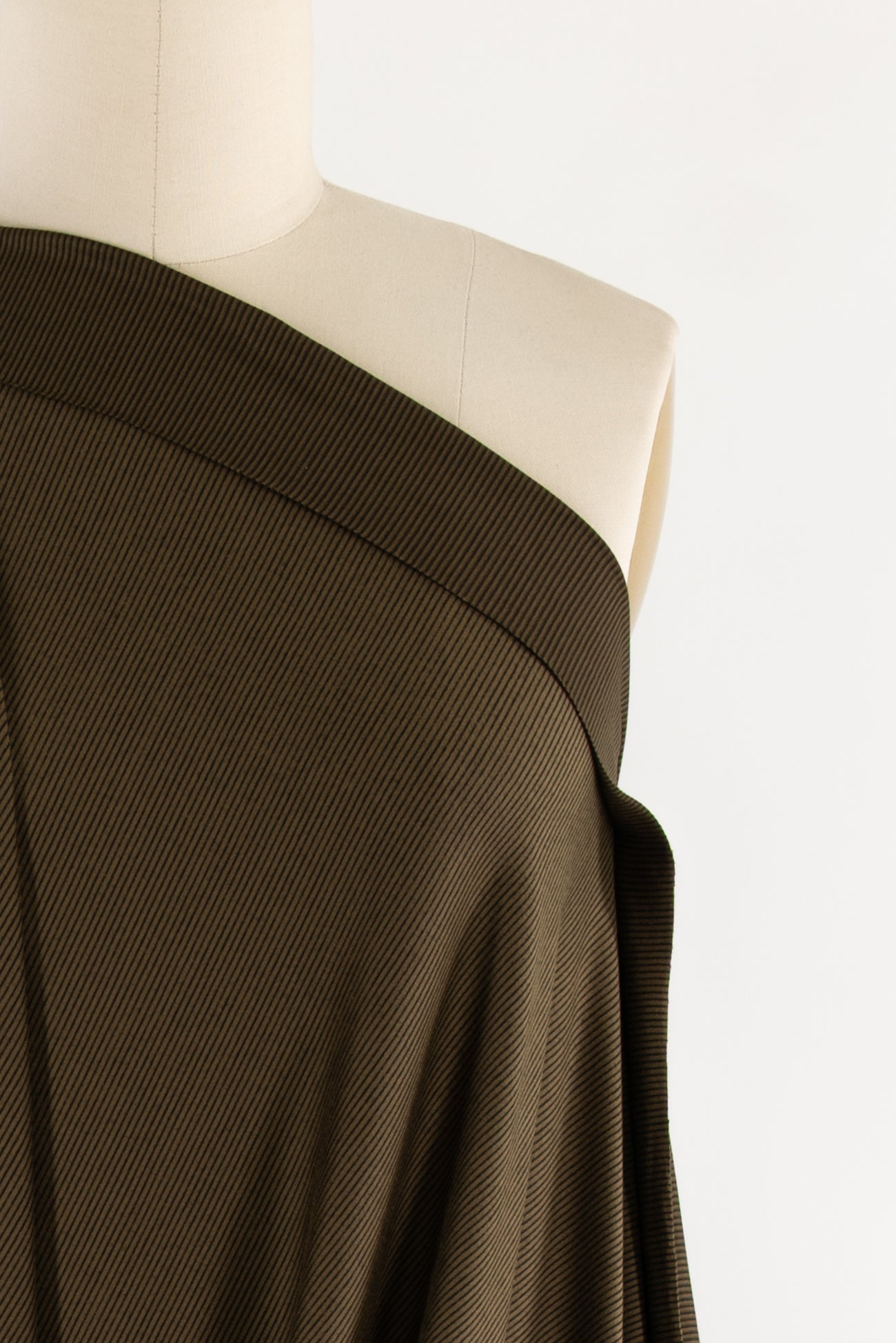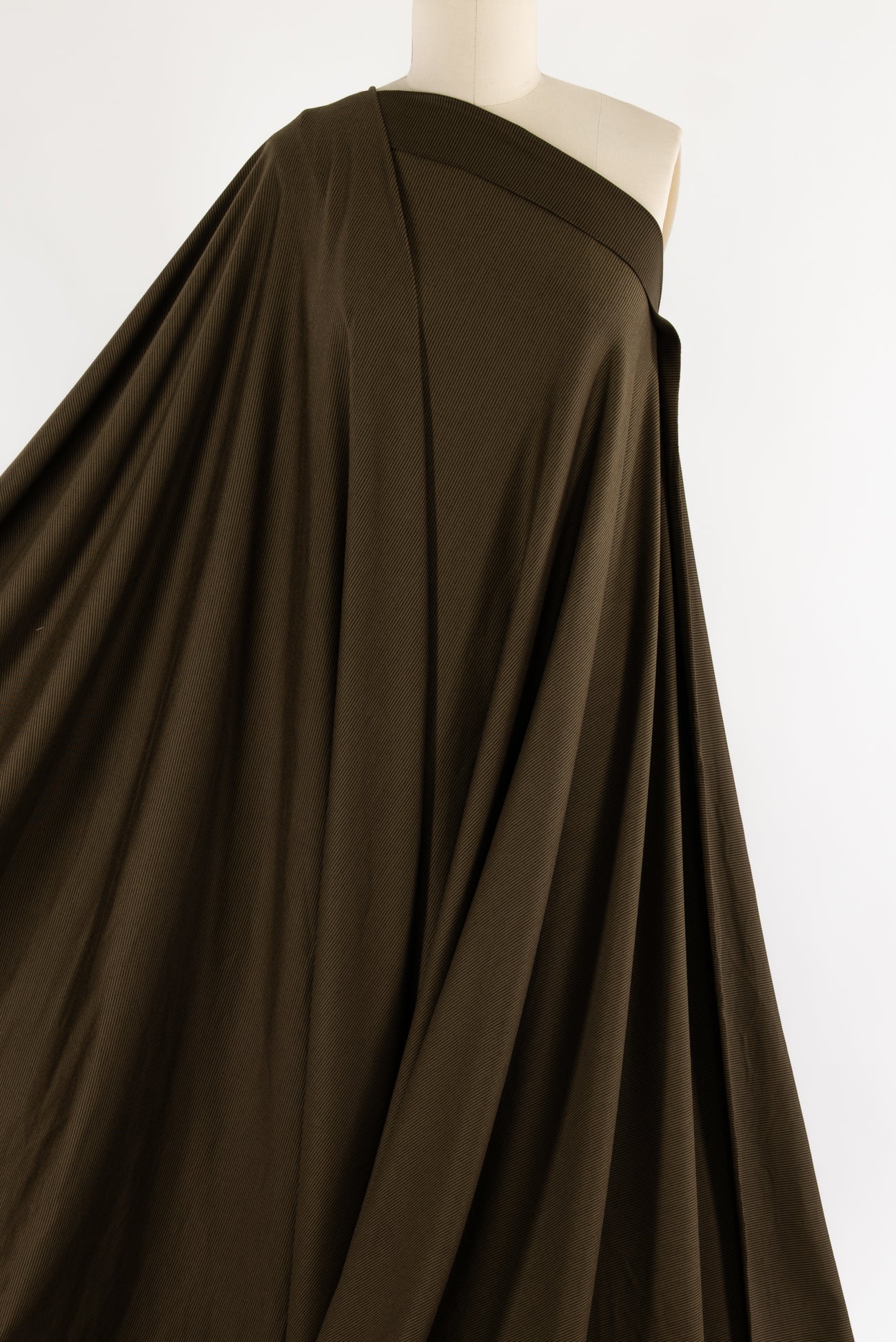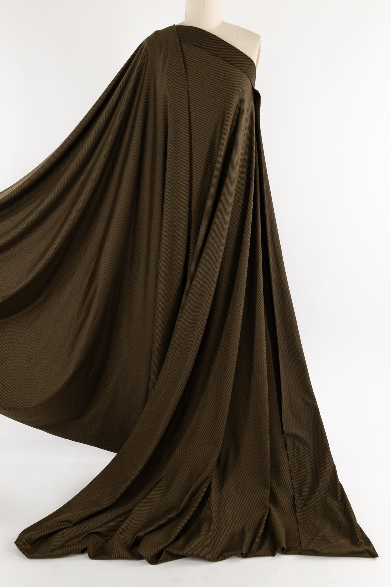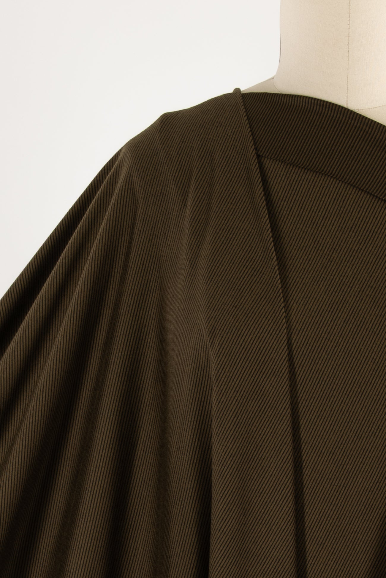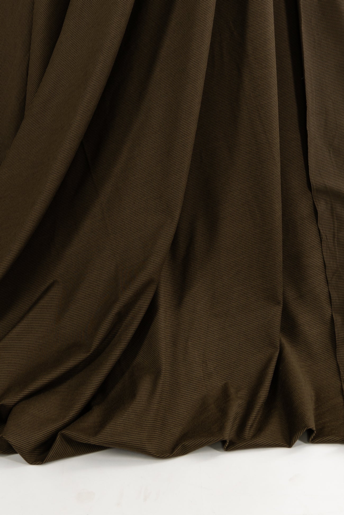 Olive and black narrow horizontal stripes in a fine quality technical knit deadstock from a high end Lulu-like LA designer. Mid-weight, soft hand, with a supple soft drape, 4-way stretch, and little rolling at the cut edge. Right for both tops and bottoms, yoga, athleisure, t-shirt, top, dress, sweater, soft pant, skirt, light jacket, hoodie, leggings, or cardi.