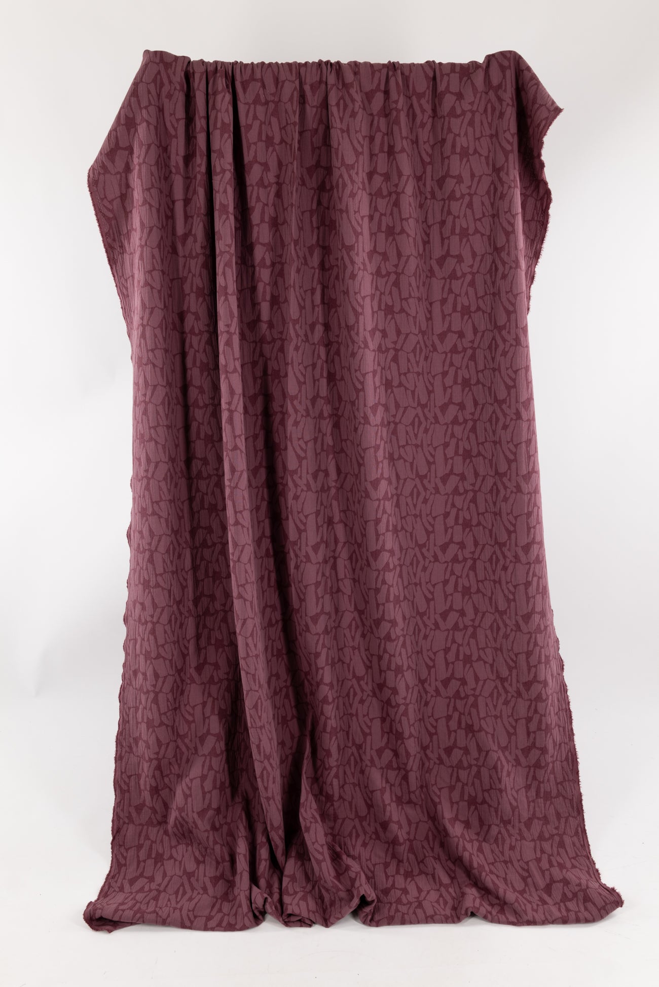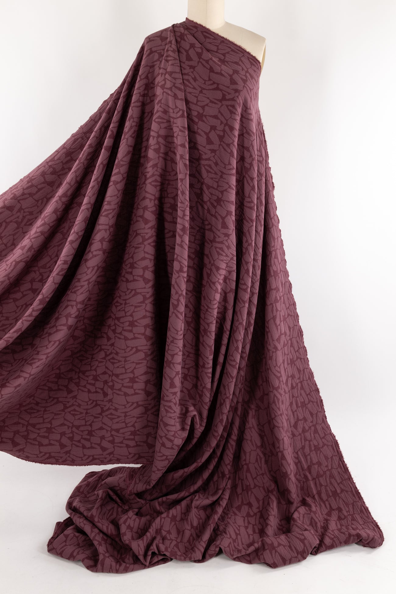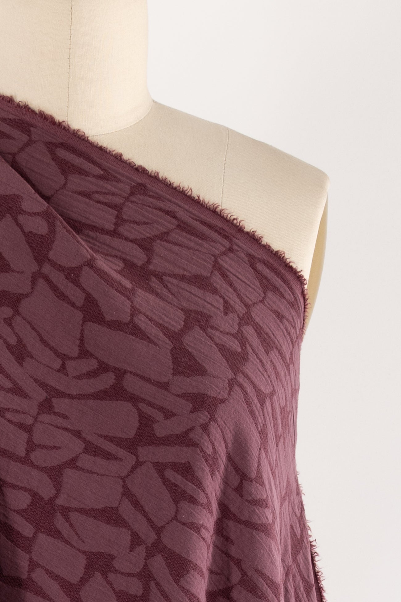 Quietly beautiful in all ways, violet rose cotton blend jacquard has a softly textured abstract/organic geometric woven in all-over design. Light suiting weight with a touch of depth, subtle texture, soft hand, and malleable drape. Use either or both sides. Feels delicious, no wrinkling, ideal for a jacket, vest, duster coat, or structured dress. Marcy says, 'Perfect for travel, ideal for a layering piece to dress up or down.'