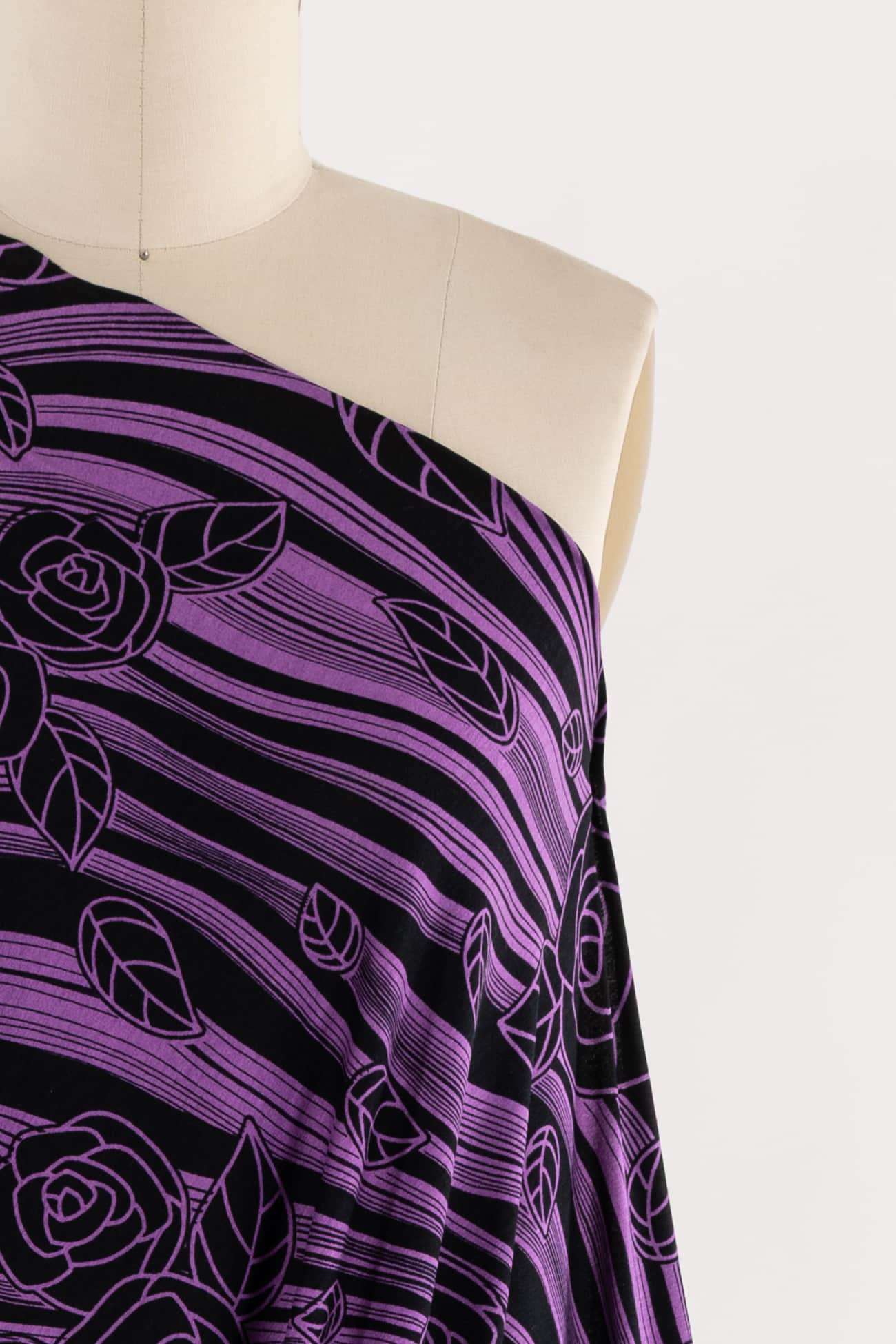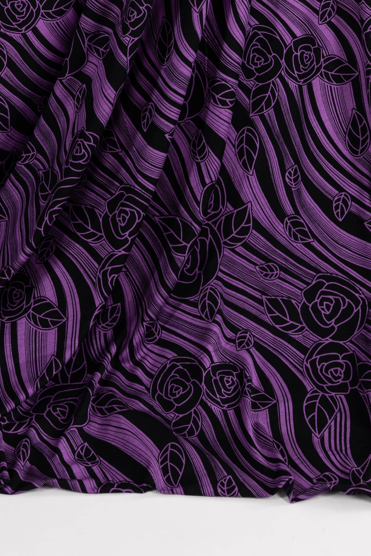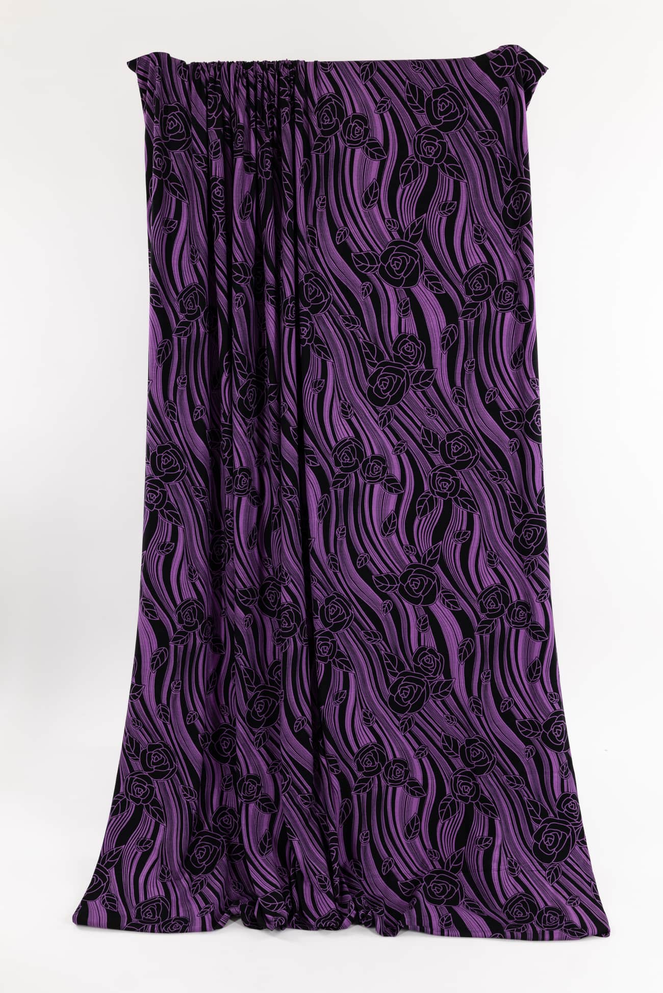 Graceful, stripey, fluid floral in violet on black in a rayon knit, fine quality deadstock from a NYC designer. Light/mid-weight, opaque with 4-way stretch, a cool dry hand, liquid drape, a 24½" repeat and some rolling at the cut edge. Just right for a t-shirt, top, tunic, dress, soft pants, caftan, loungewear or children's. Limited quantity available.