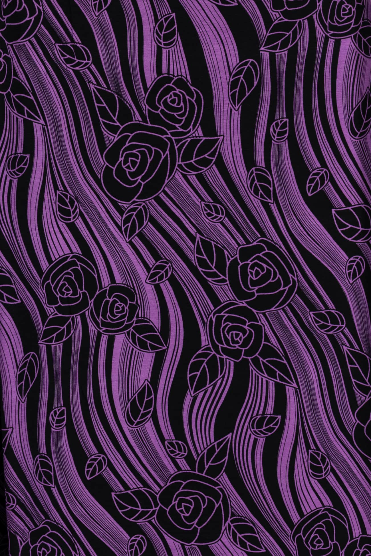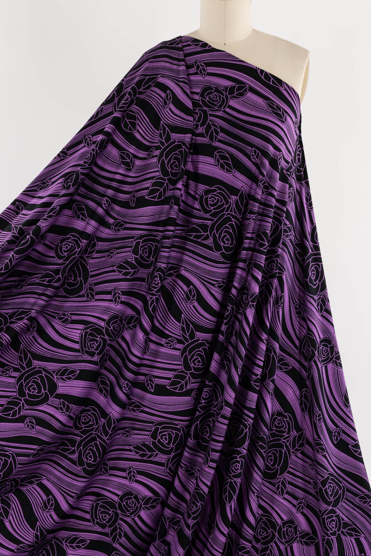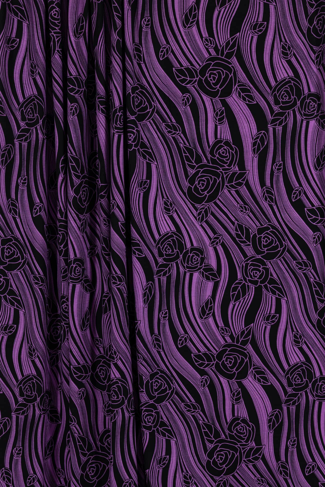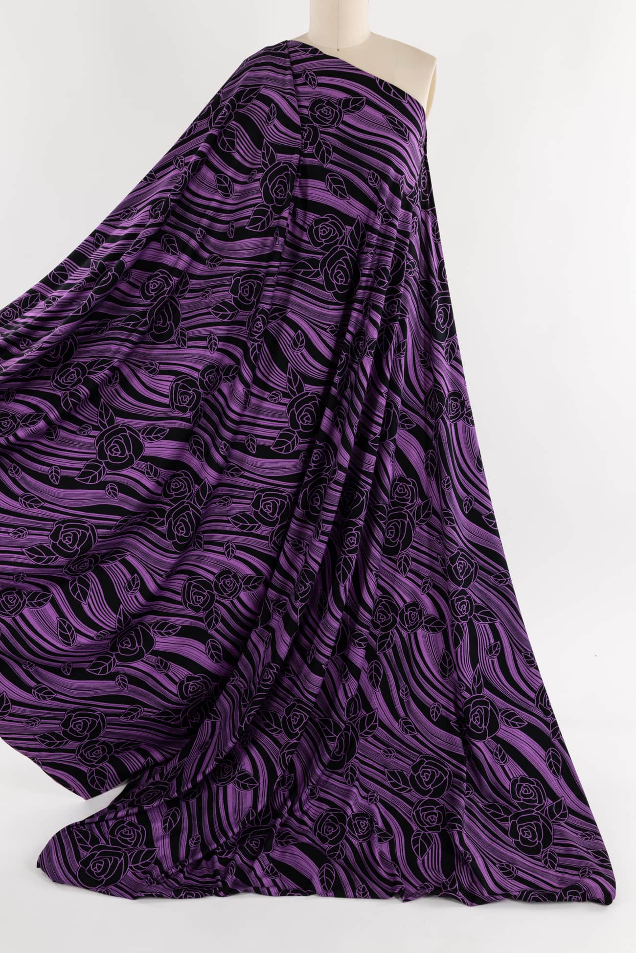 Graceful, stripey, fluid floral in violet on black in a rayon knit, fine quality deadstock from a NYC designer. Light/mid-weight, opaque with 4-way stretch, a cool dry hand, liquid drape, a 24½" repeat and some rolling at the cut edge. Just right for a t-shirt, top, tunic, dress, soft pants, caftan, loungewear or children's. Limited quantity available.